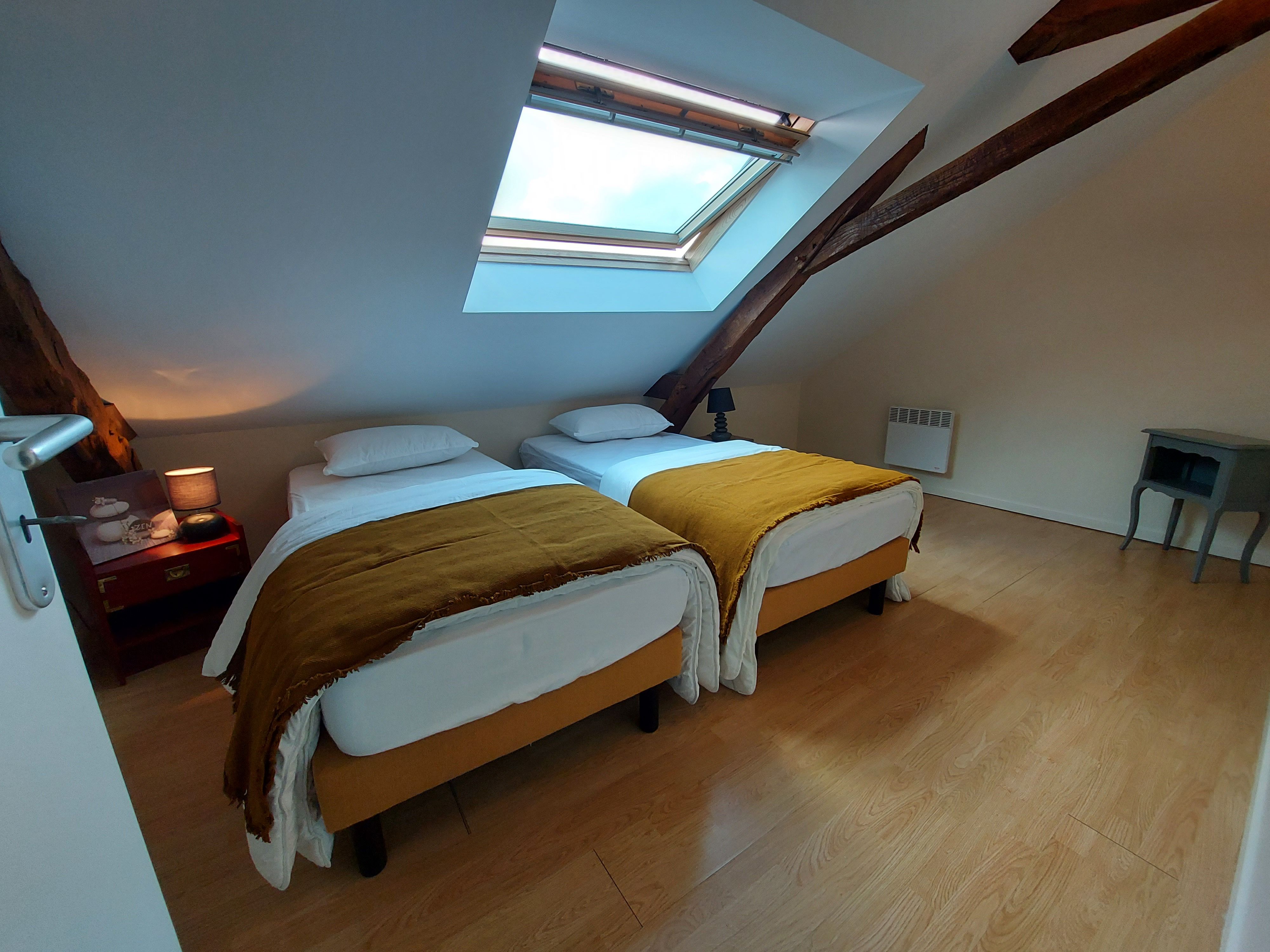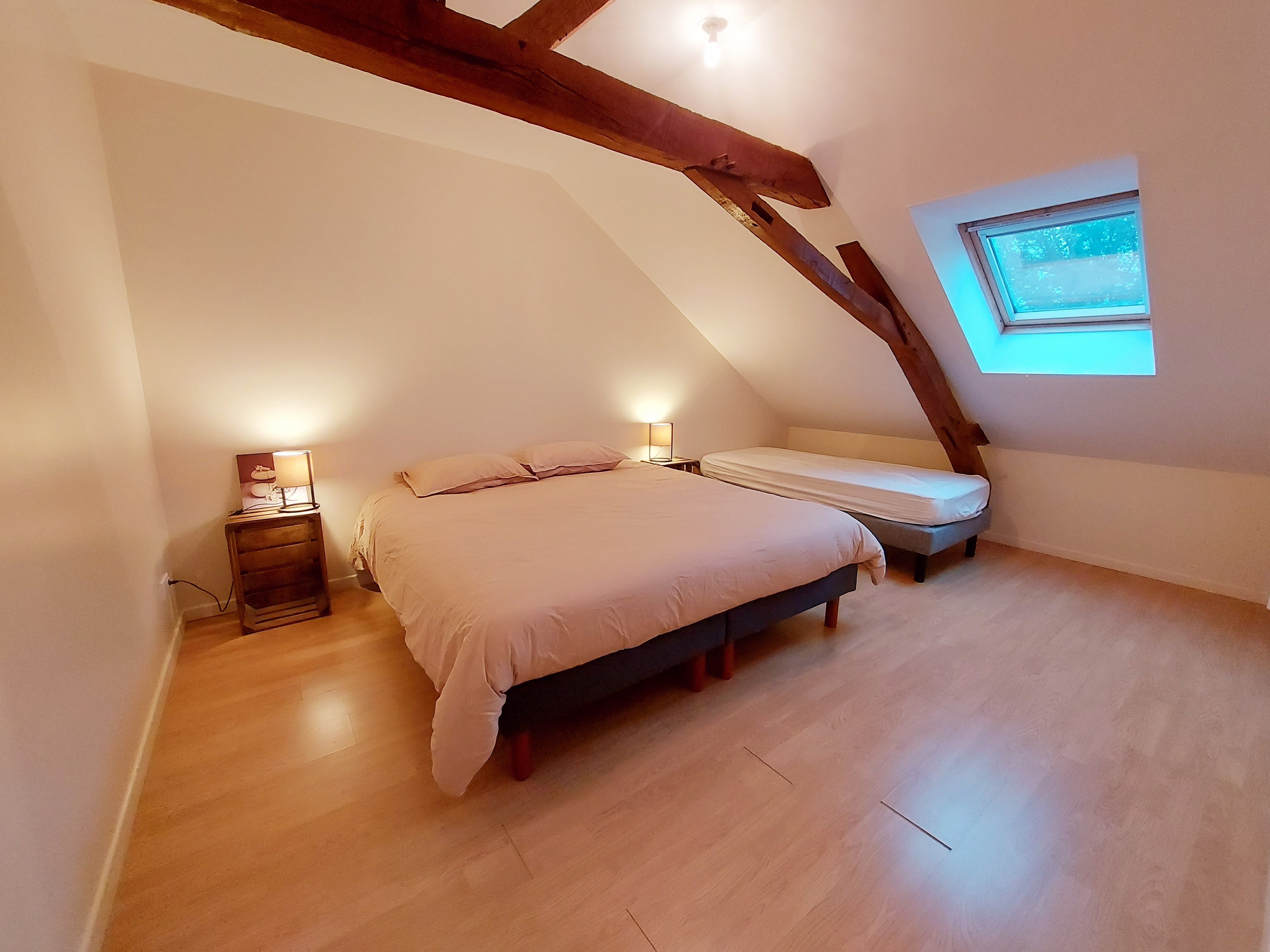 A l’étage se trouve la salle de bain avec douche et baignoire, ainsi que deux chambres disposant de 5 lits jumeaux 90×200 que vous pourrez, selon vos besoins, rapprocher afin d’obtenir un lit king size. Le canapé convertible du salon offre un couchage supplémentaire pour 2 personnes. Les draps sont fournis. Le ménage est en option à 75€. L’électricité est à régler au propriétaire > 8kWh/jour, relevé de compteur à l’entrée et la sortie.