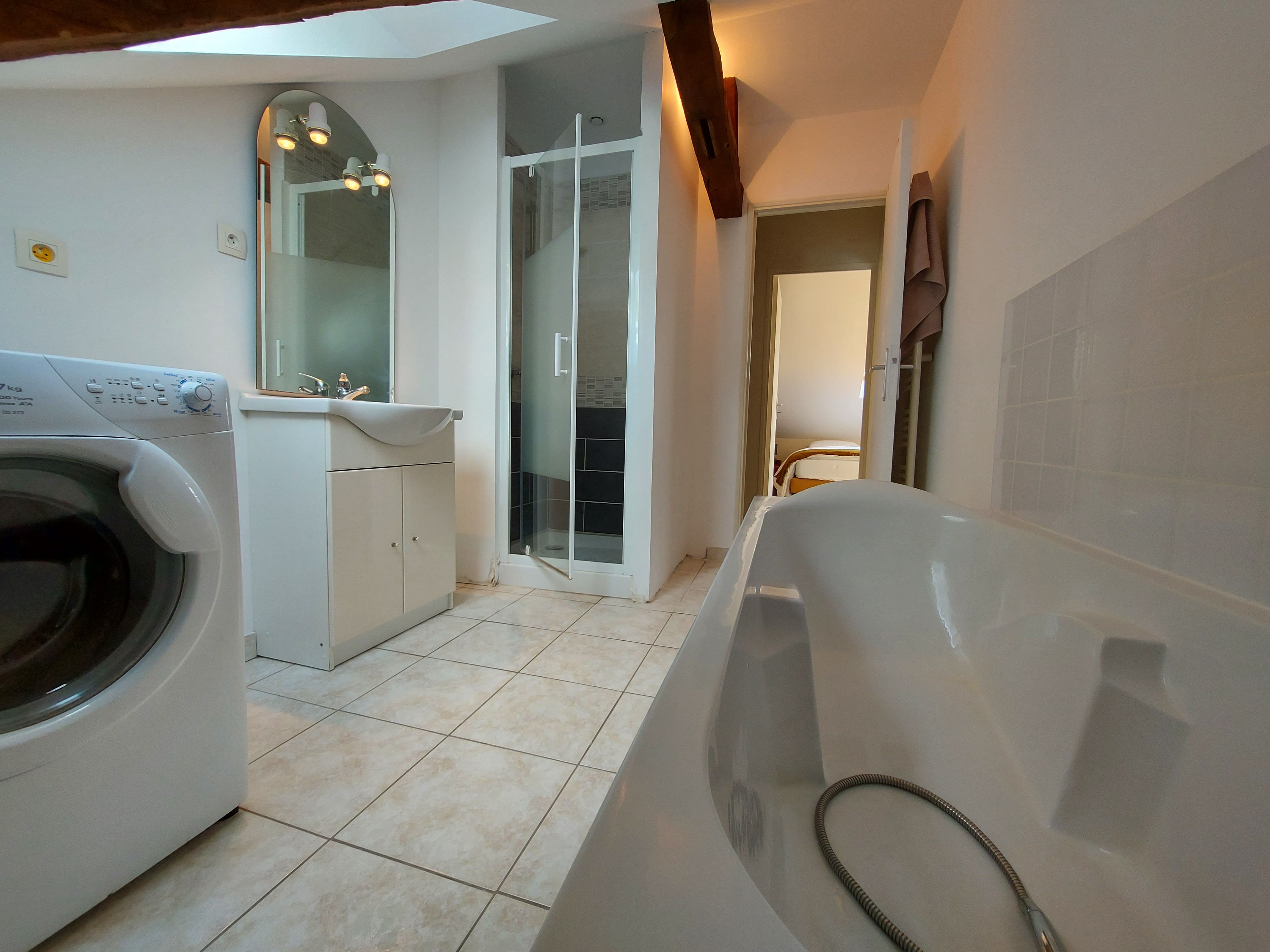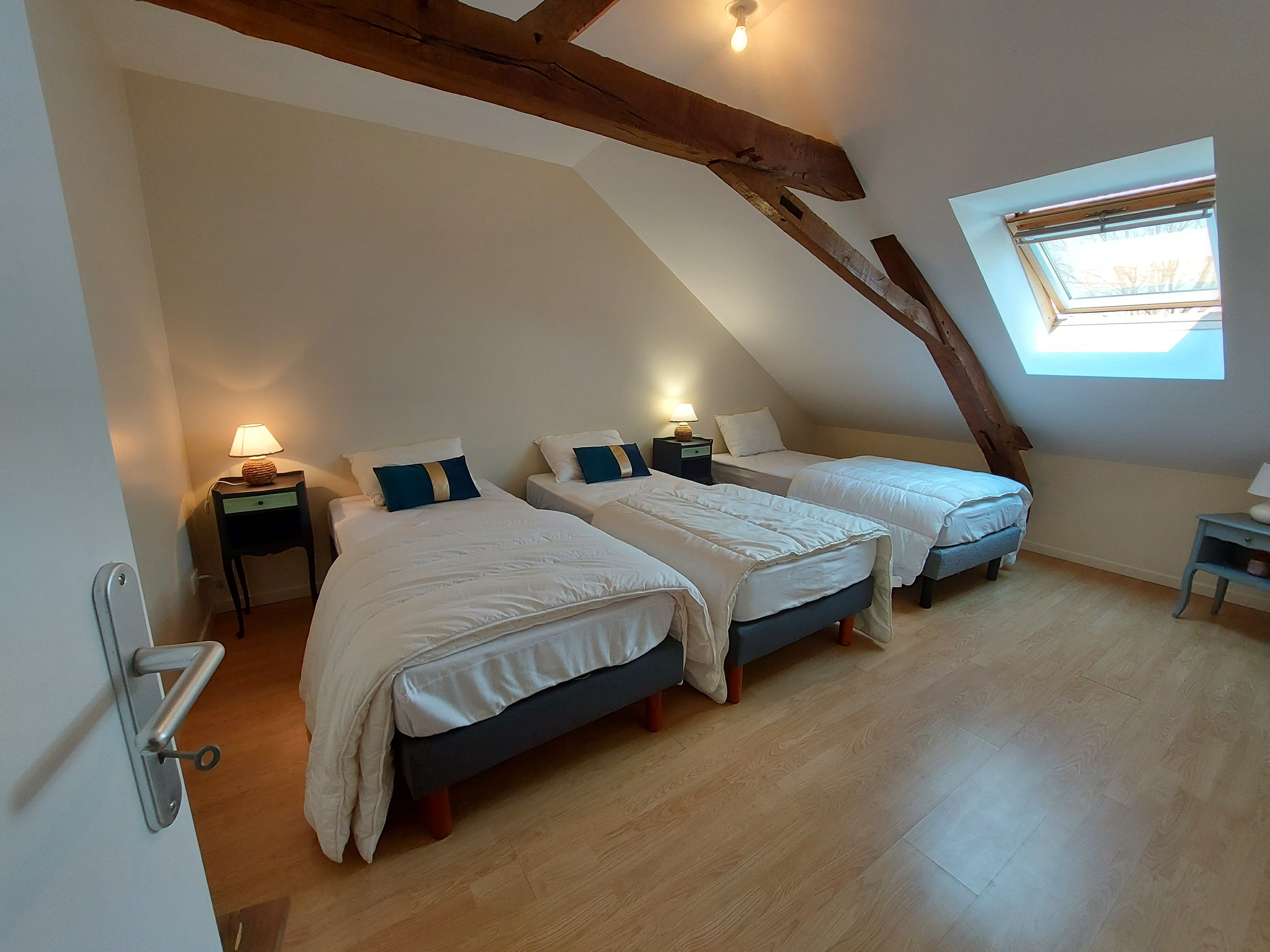A l’étage se trouve la salle de bain avec douche et baignoire, ainsi que deux chambres disposant de 5 lits jumeaux 90×200 que vous pourrez, selon vos besoins, rapprocher afin d’obtenir un lit king size. Le canapé convertible du salon offre un couchage supplémentaire pour 2 personnes. Les draps sont fournis. Le ménage est en option à 75€. L’électricité est à régler au propriétaire > 8kWh/jour, relevé de compteur à l’entrée et la sortie.
