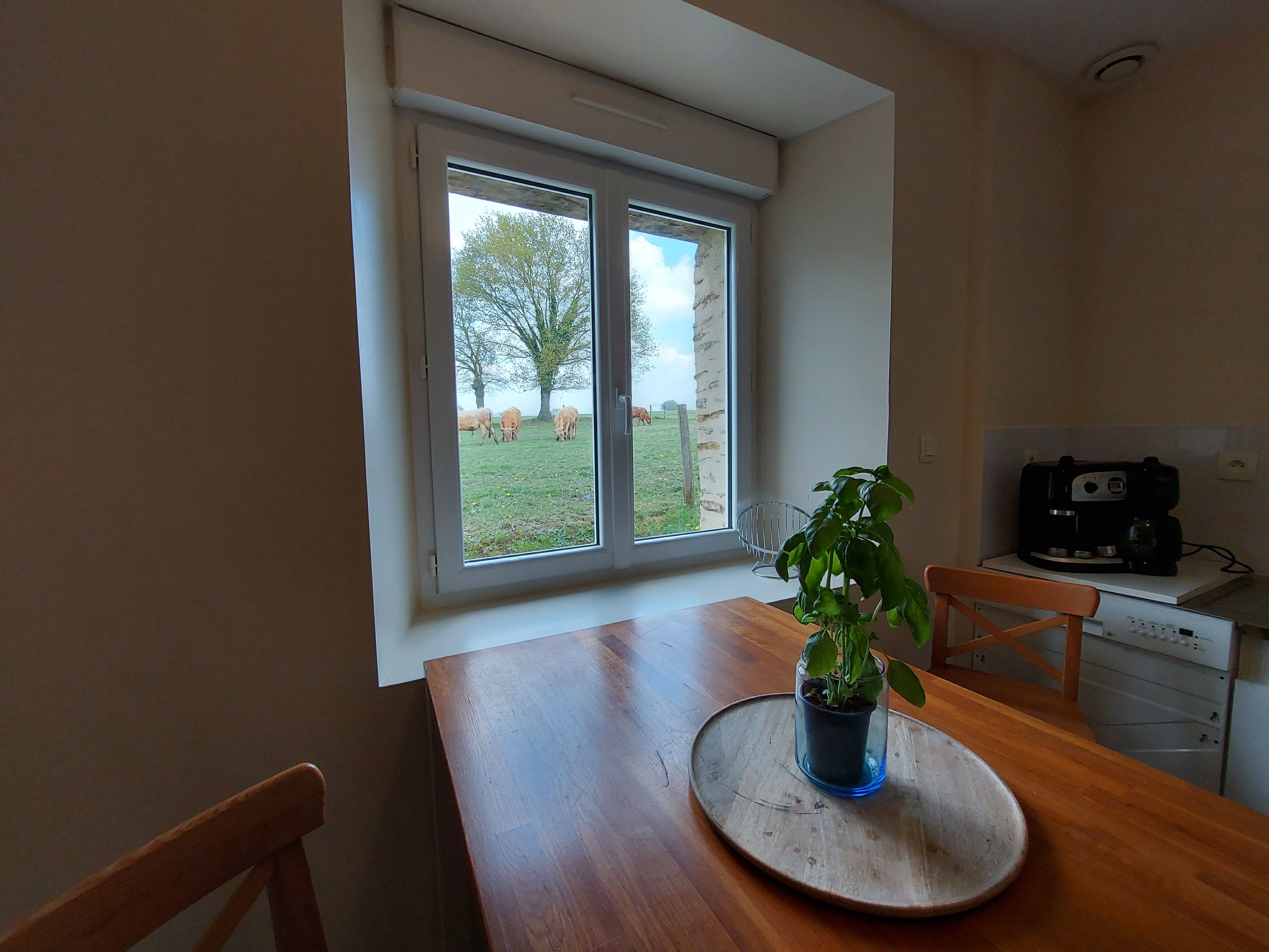 Vous pourrez profiter d’un déjeuner en toute tranquillité à l’extérieur sur la terrasse privée. Ici, c’est un vis-à-vis direct… avec les vaches, depuis la fenêtre de la cuisine ou face à la grande baie vitrée de la salle de vie.