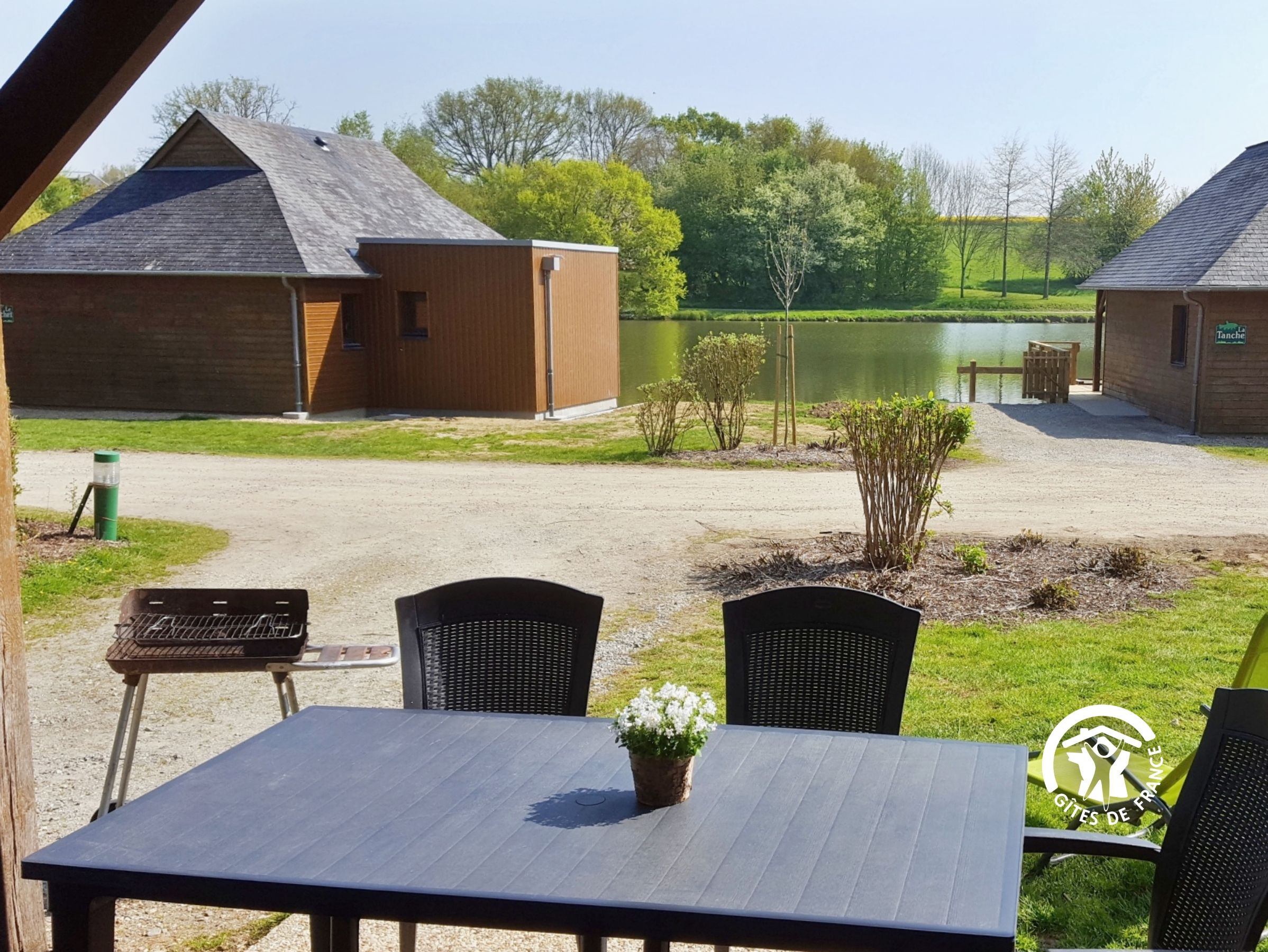 Chalet de pêche pour 4-6 pers, avec ponton privatif sur le plan d’eau de plus de 7ha réservé au village vacances et pêche, dans un cadre verdoyant.