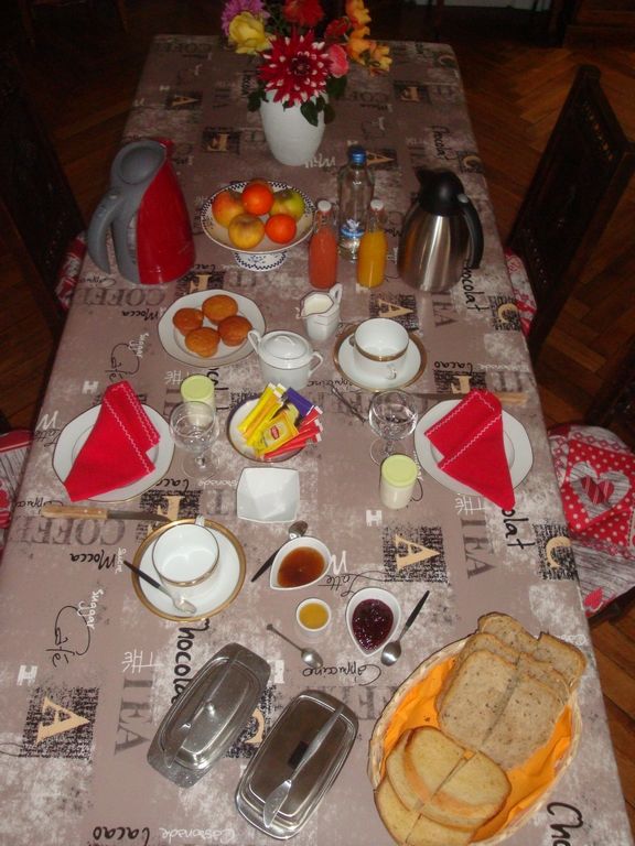 Petit déjeuner, pain,brioche et confiture, faits « maison », fruits et jus de fruits frais.