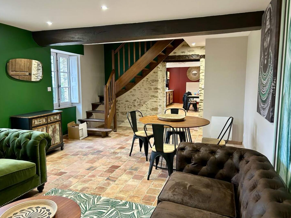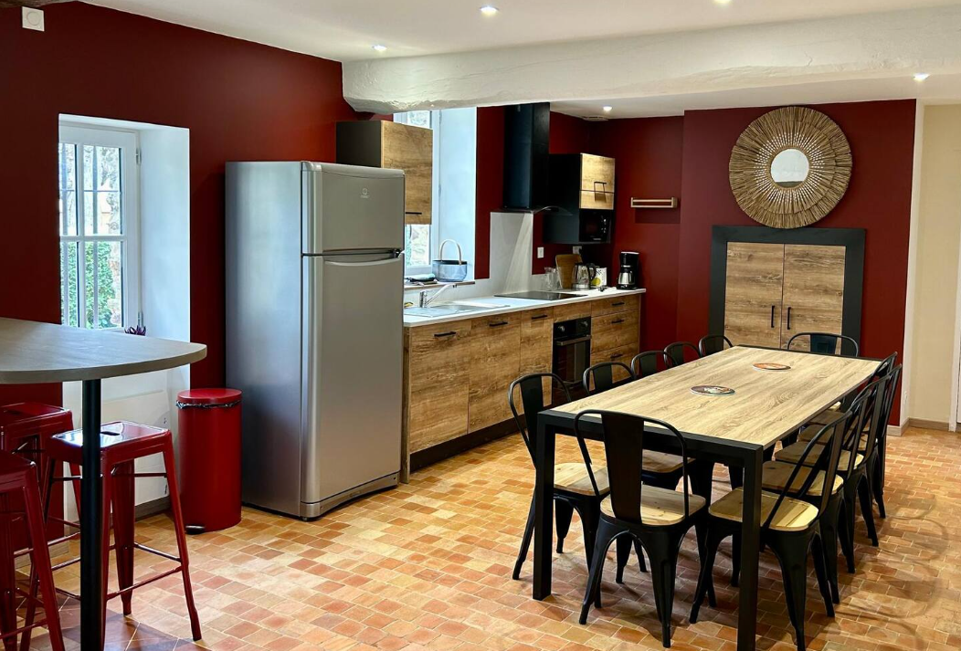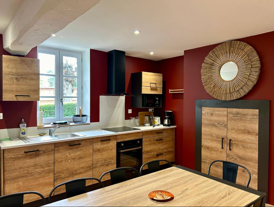 Le gîte dispose d’une grande cuisine équipée, parfaite pour préparer vos repas, ainsi que d’un salon accueillant, offrant un espace de détente convivial avec un canapé-lit pour plus de flexibilité.