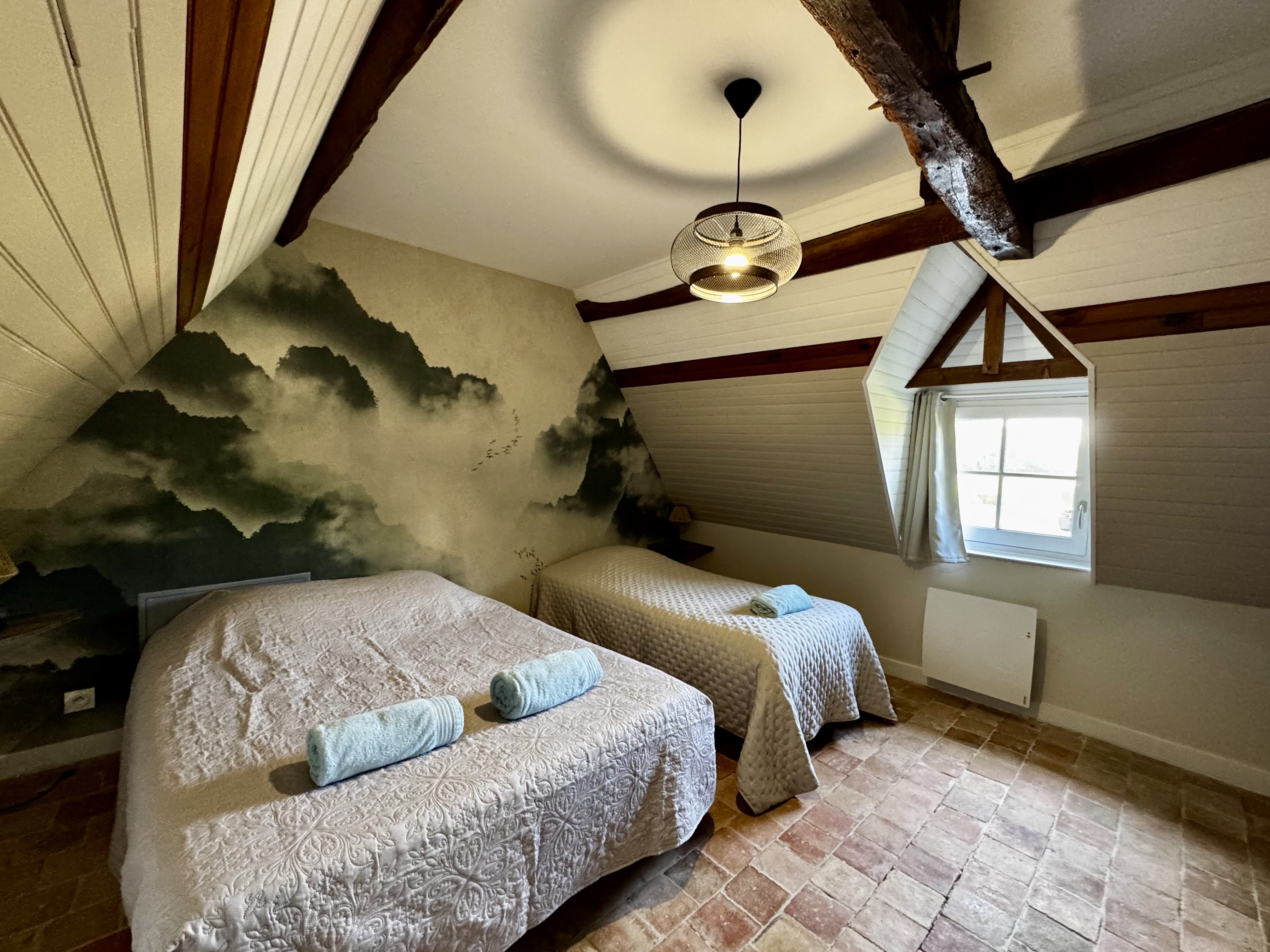 1 chambre avec 1 lit double et 1 lit simple