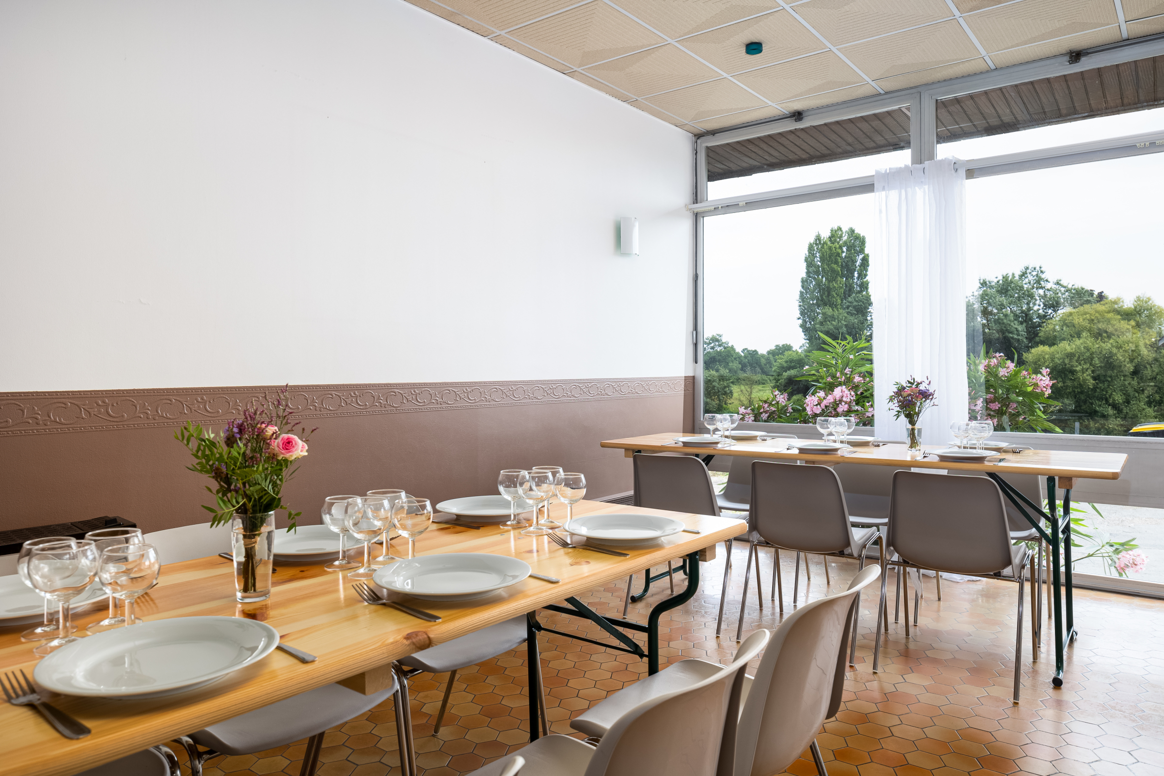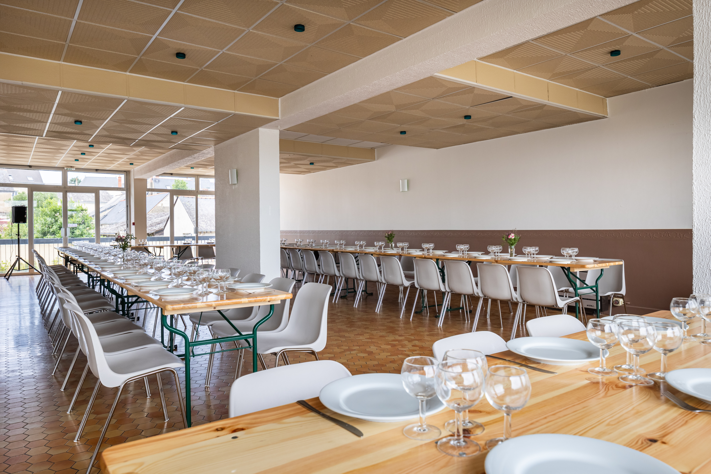 Trois salles et pleins d’autres espaces pour s’adapter à tous les usages comprenant une grande salle de réception de 120m² avec vue sur la Sarthe; une salle de danse de 100m² insonorisée avec sono incluse et une salle de 100m² permettant d’accueillir vin d’honneur, ou les repas des enfants. Une grande cuisine entièrement équipée vous permettra d’organiser vos repas.