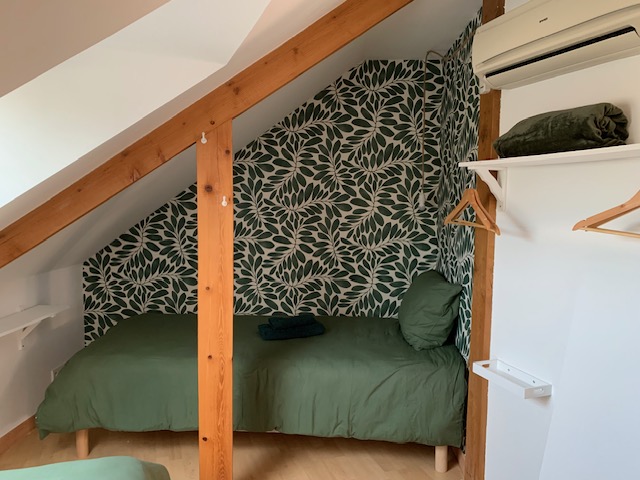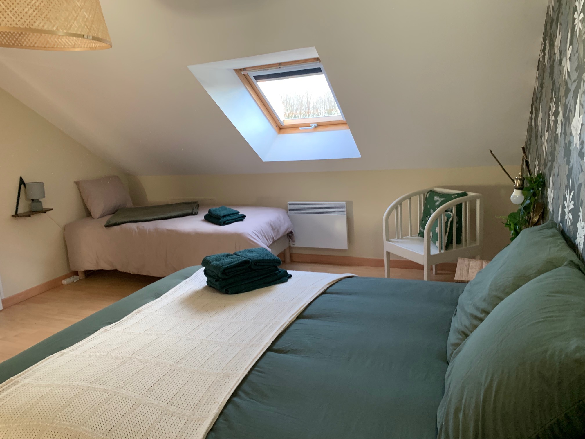 A l’étage : une grande mezzanine avec fauteuils pour des petits coins lecture ou de repos, une chambre de 18m² avec ses poutres en bois et sa tapisserie bleu nuit composée d’un lit double et d’un lit une personne, une armoire, une chambre de 21m² thème forêt avec un lit double et 2 lits d’une personne ainsi qu’une armoire , une chambre de 11m² avec 2 lits une personnes avec étagères et porte manteau, et une salle de douche avec double vasque et un toilette, une sèche-serviette et un sèche-cheveux.