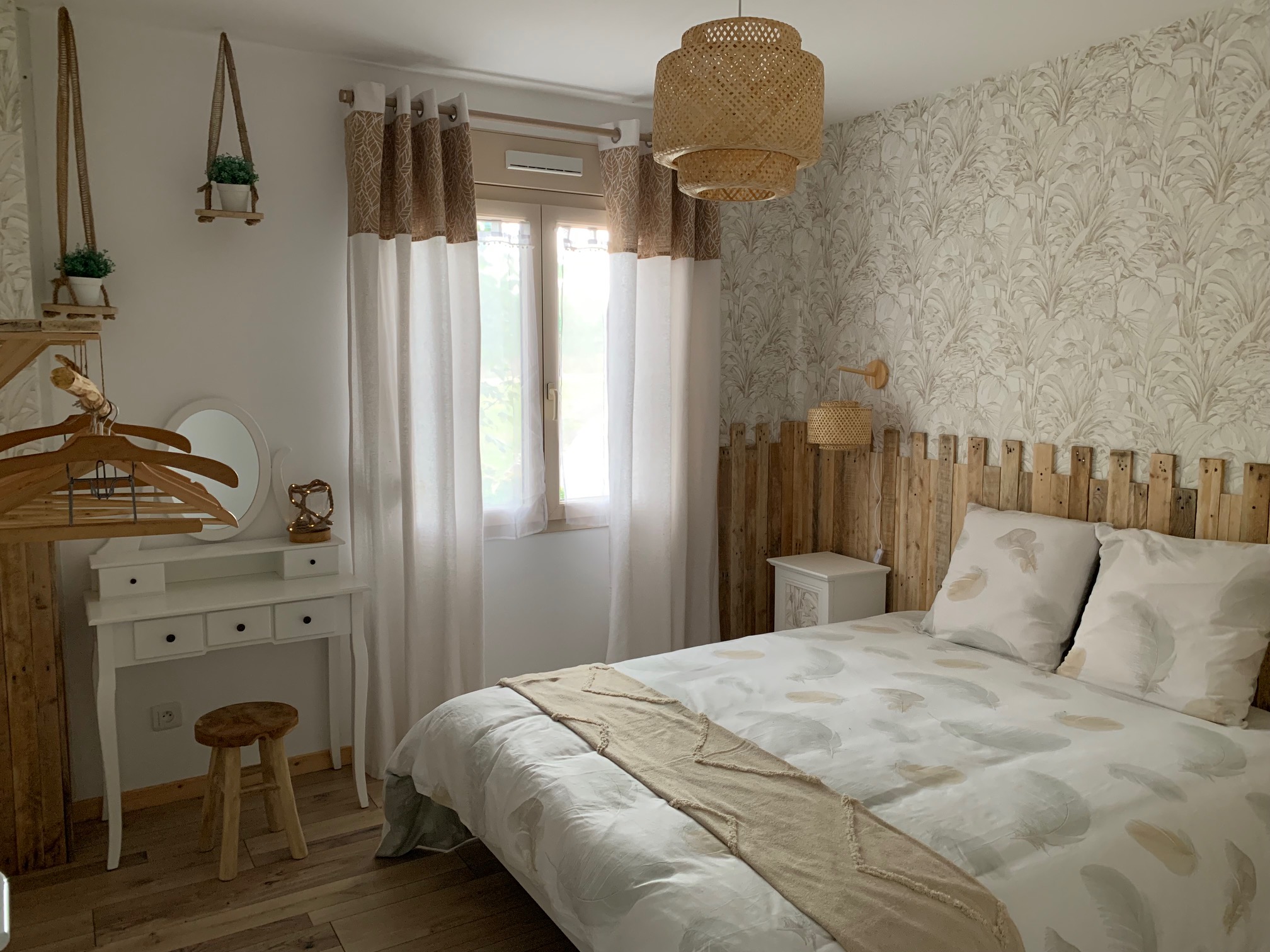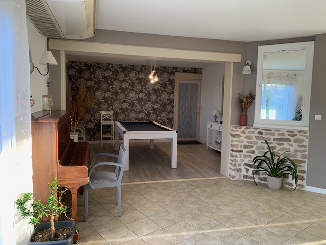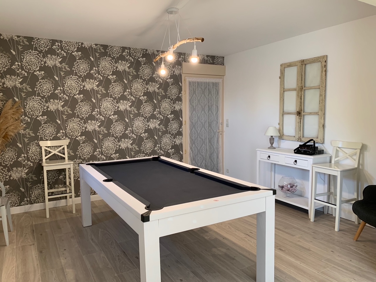 Au rez-de-chaussée, une entrée spacieuse donne sur un salon de 50 m² composé de 3 canapés et fauteuils pour des moments de partage cocooning ou de repos, attenant à une salle avec un billard. Une grande salle à manger de 60m² avec deux longues tables familiales pour de bons repas entre amis ou en famille, un coin bibliothèque avec un espace de jeux de société, au dessus de cette pièce un espace jeux avec un babyfoot et des canapés. Une cuisine ouverte toute équipée four, plaque de cuisson, lave-vaisselle, micro-onde, cafetières, cafetière Senseo, bouilloire, grille-pain, 2 réfrigérateurs-congélateurs, toutes vaisselles avec un ilot central pour préparer des bons petits plats et un petit déjeuner intimiste, des grandes baies vitrées donnent sur la terrasse. Trois chambres chic et douillettes, 2 de 10 m² et une de 13 m² avec chacune leur thème (Jungle-cabane-baroque), composé de lits double, le linge de lit et les serviettes de toilette sont fournis. Une salle de bain avec une petite baignoire d’angle, une grande cabine de douche verrière et des double vasques, sèche serviettes, sèche-cheveux et un toilette séparé.