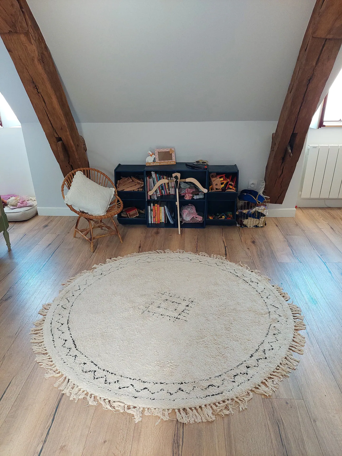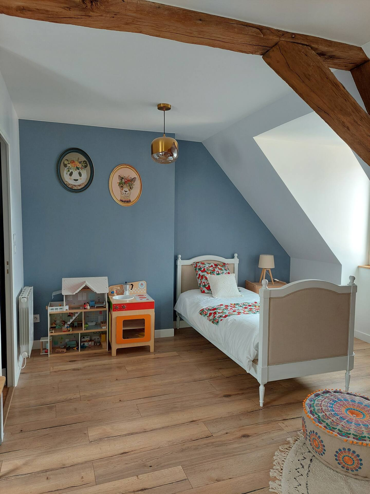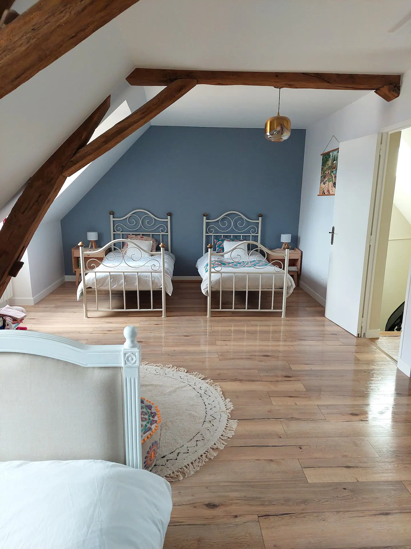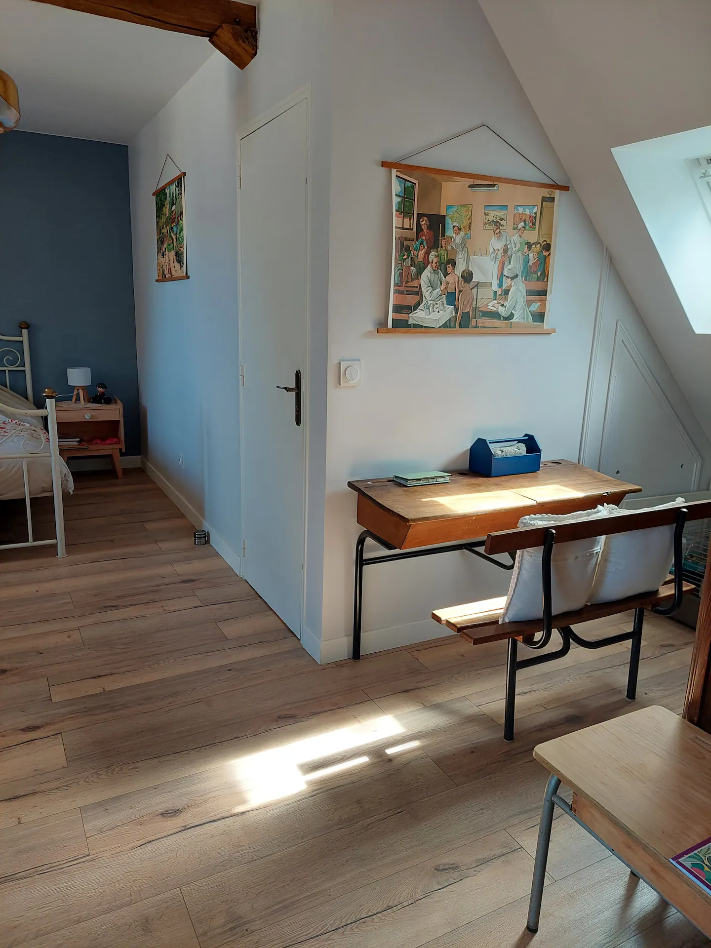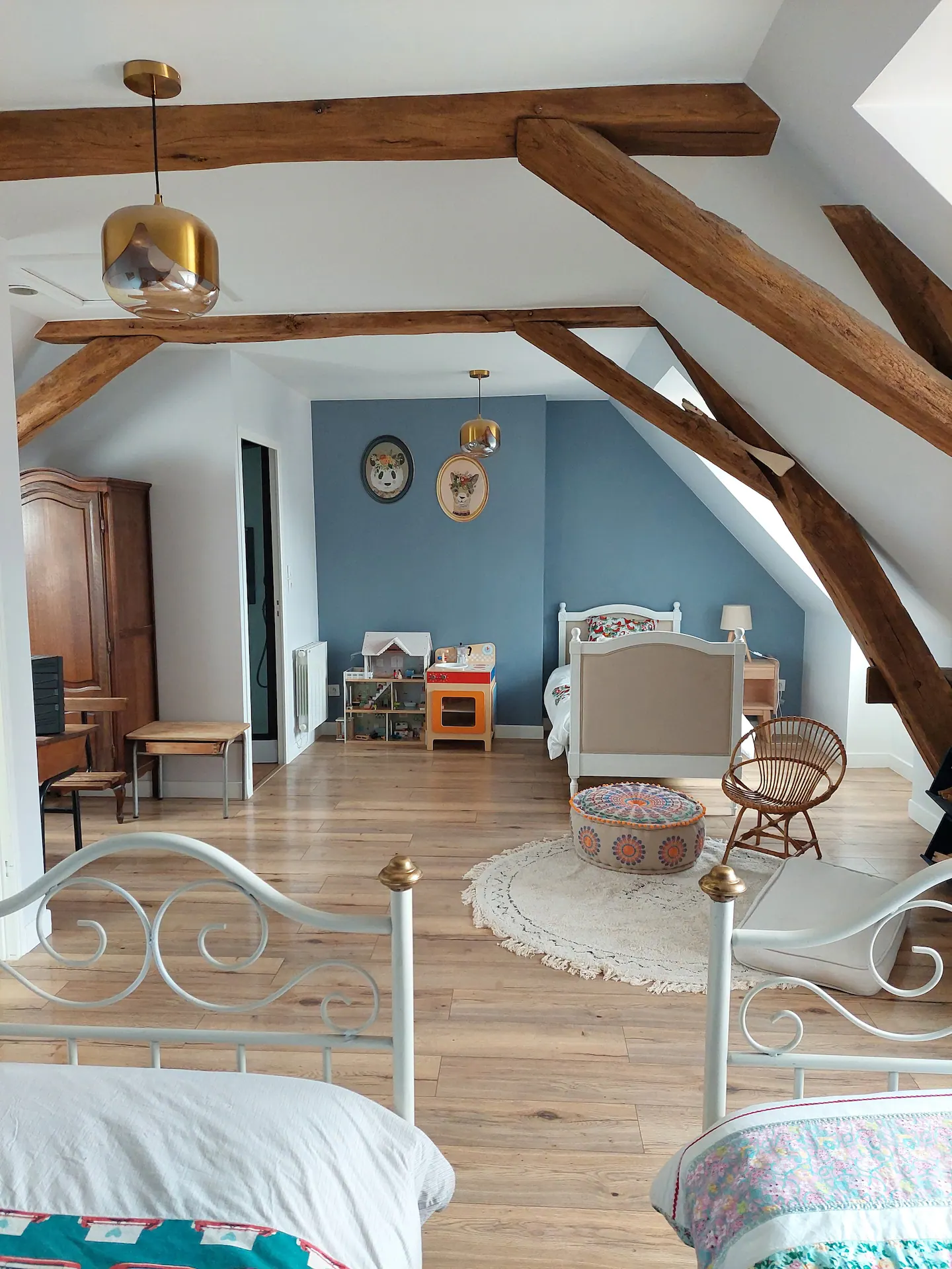 Au dernier niveau de la maison se trouve une grande chambre avec trois lits simples et un coin jeux aménagé, ainsi qu’une salle de bain avec douche. Il y a des wc aux trois niveaux.