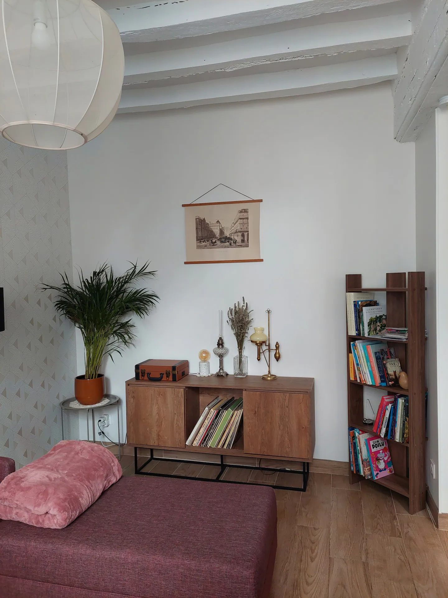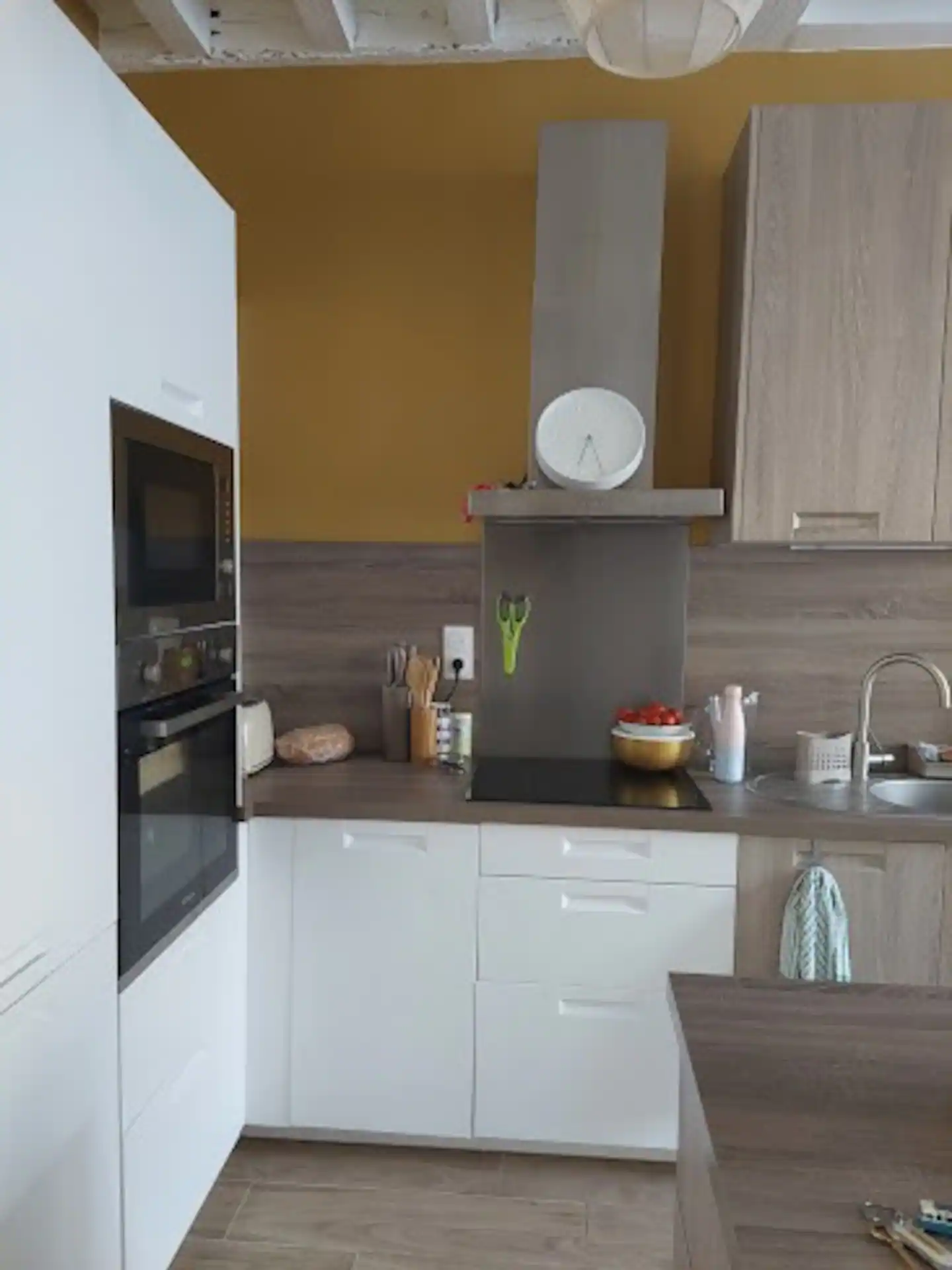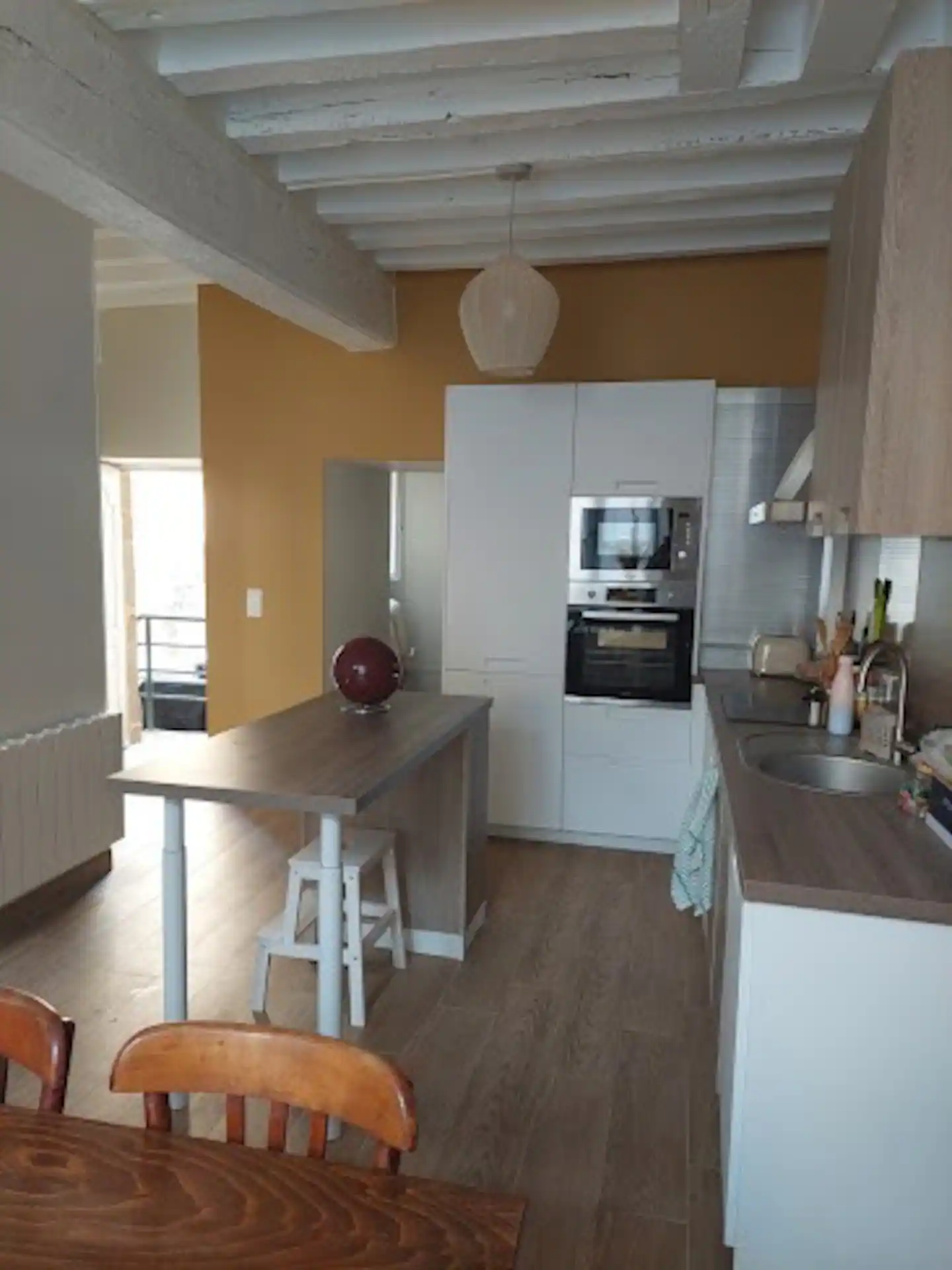 Au premier niveau : un salon (avec platine vinyle, télévision avec lecteur DVD et accès à Netflix), une salle à manger, une cuisine équipée et un cellier avec lave-linge/sèche-linge.