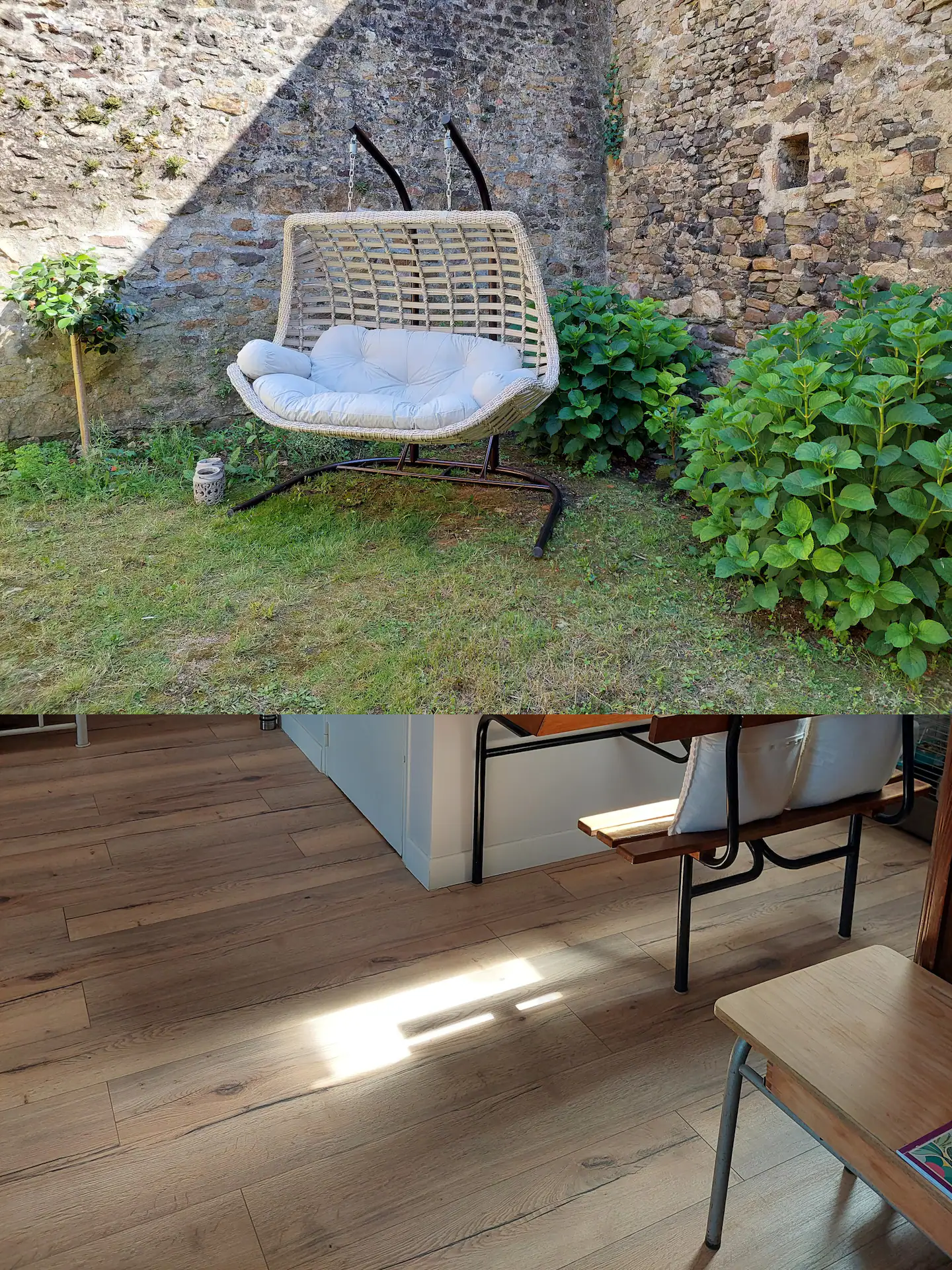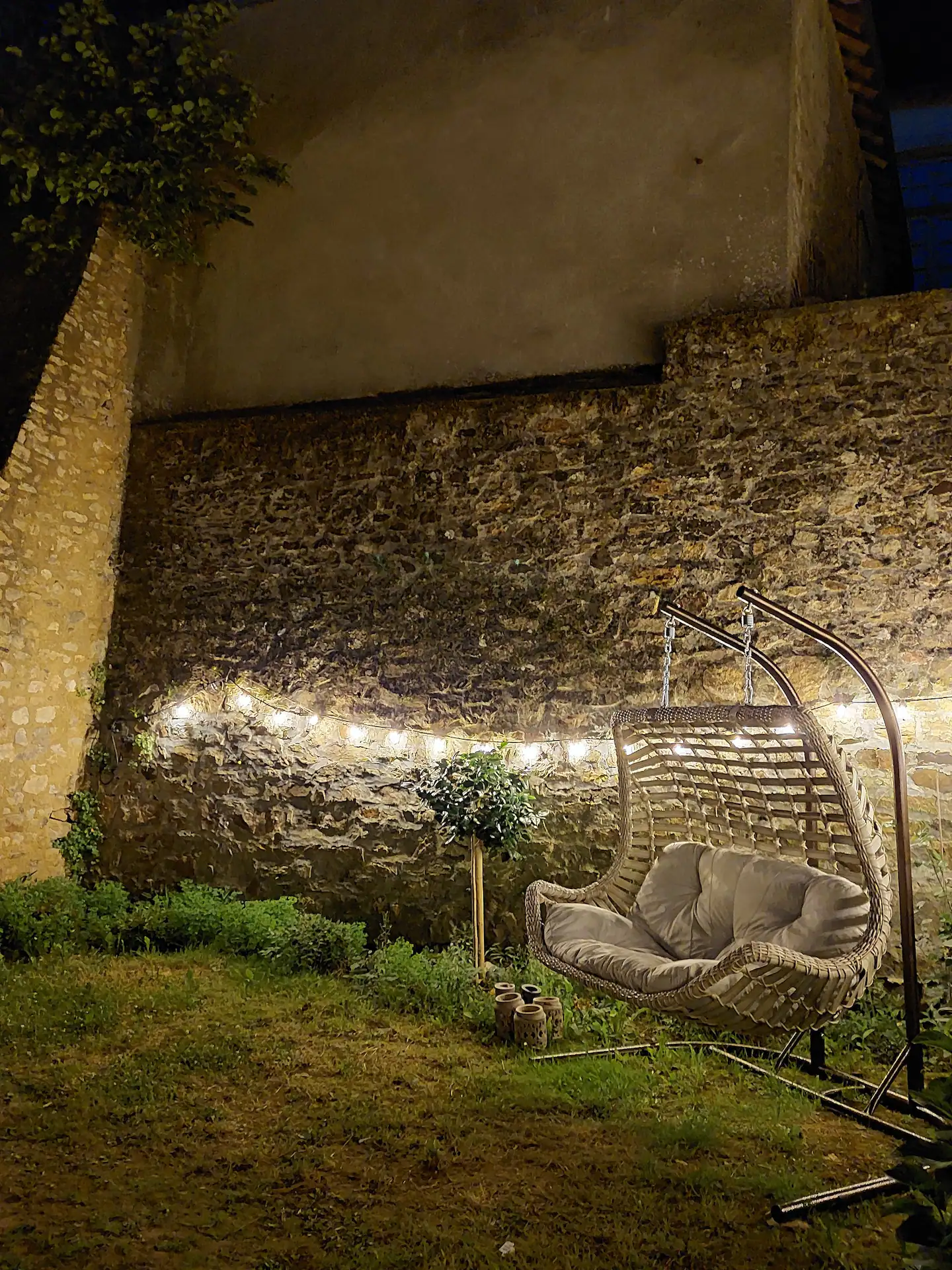 Derrière la maison se trouve une petite cour arborée avec salon de jardin et barbecue.