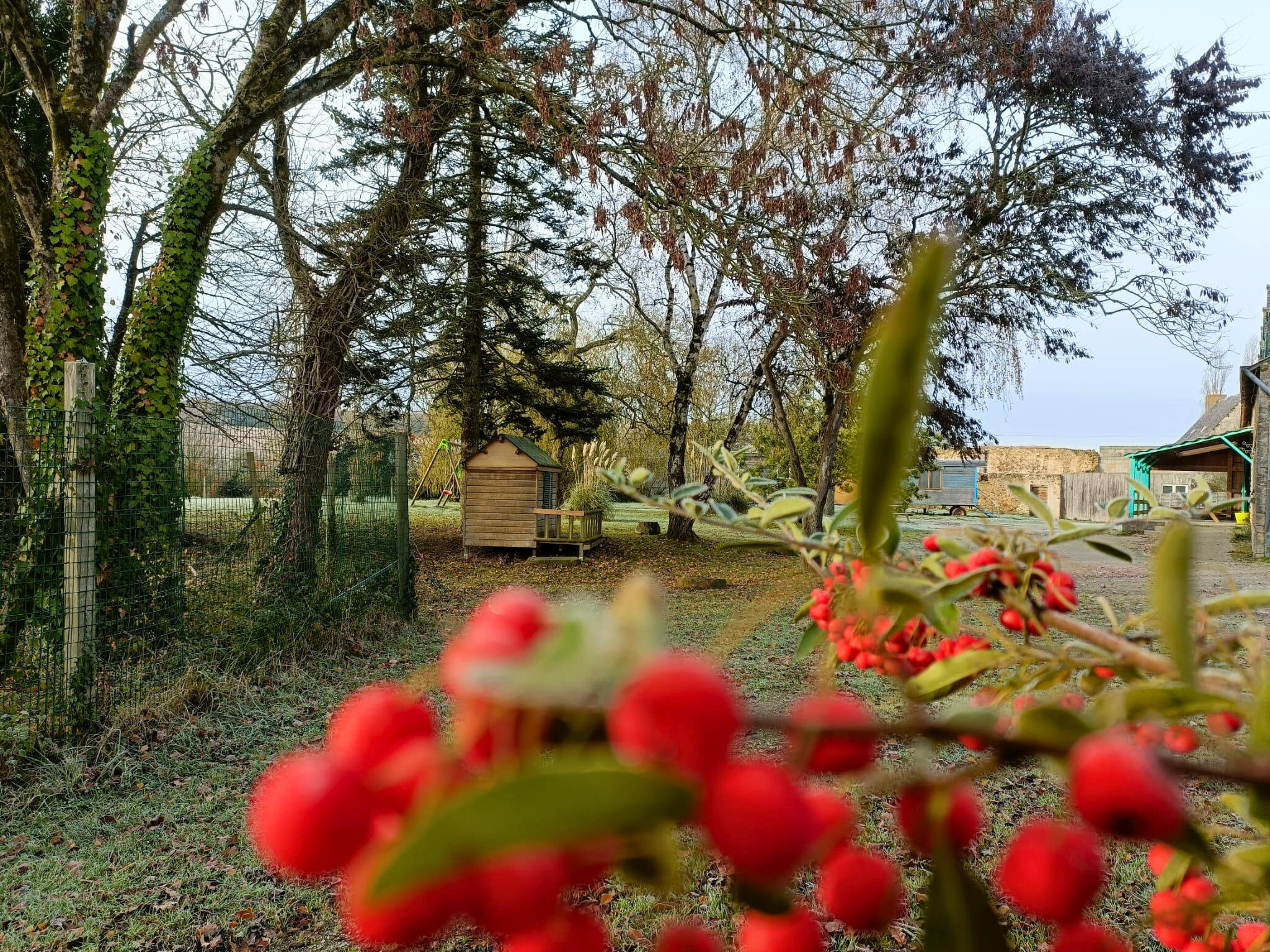 Depuis la terrasse couverte, vous pourrez observer les enfants s’amusant sur les jeux de jardin mis à leur disposition. Pour leur sécurité, la pièce d’eau voisine est close par un grillage haut.