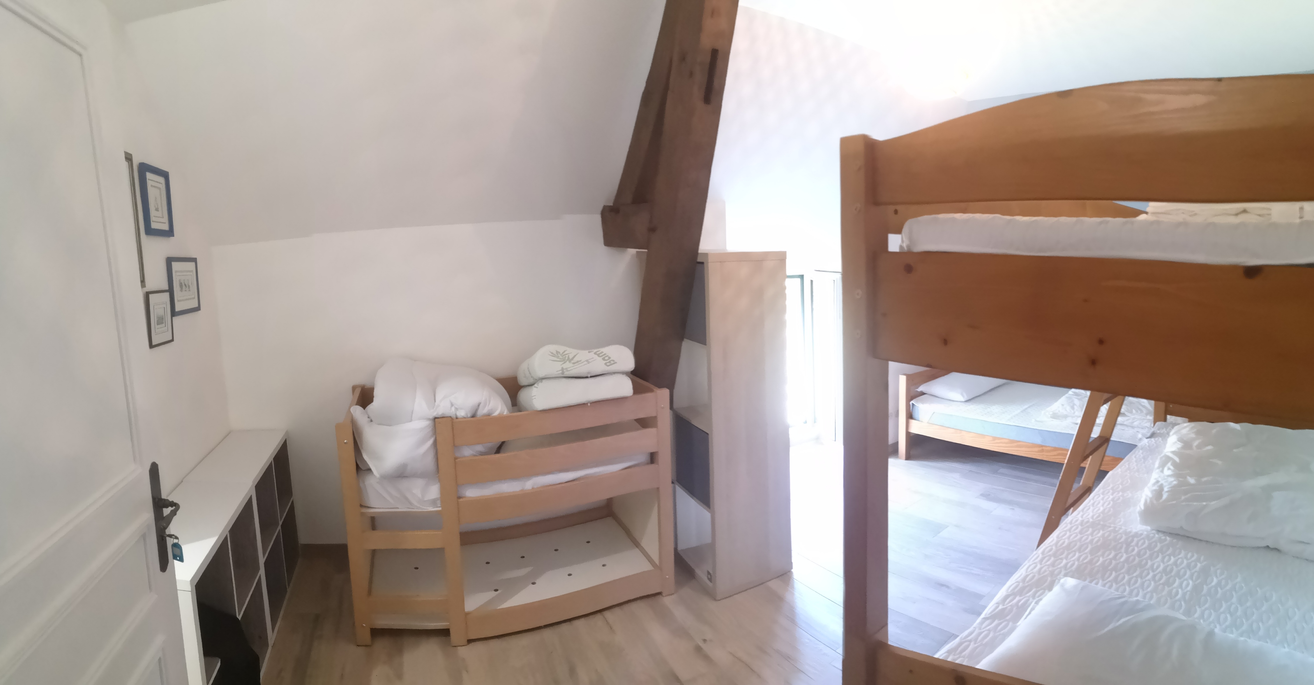 A l’étage, 3 chambres équipées d’un lit double (160×200), dont une équipée d’une douche; d’un espace de travail/chambre (prise Ethernet avec écran d’ordinateur supplémentaire), un lit gigogne (180×200); d’un dortoir avec 3 couchages en 90 dont 2 sont superposés et un lit superposé pour bébé (lit de crèche) 120×60; d’une douche, d’une salle de bains avec double vasque et baignoire et WC séparé.