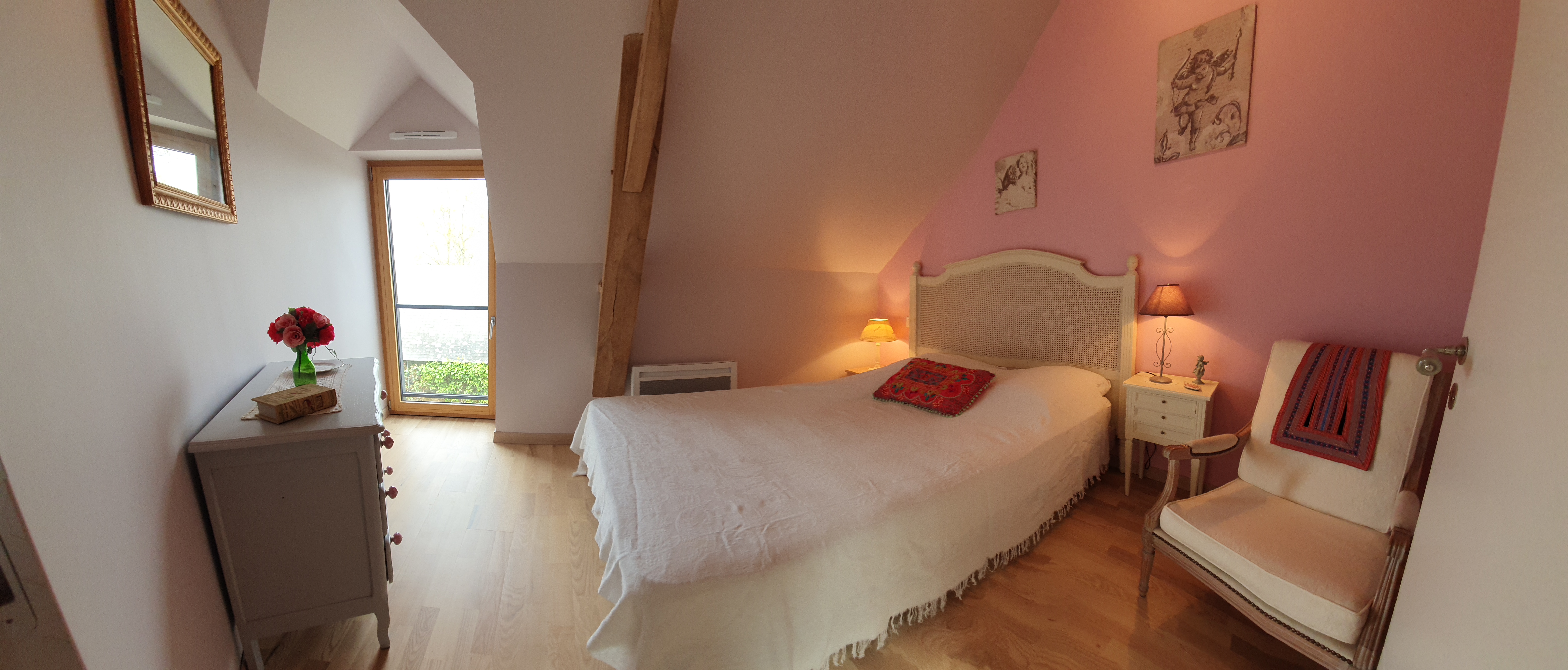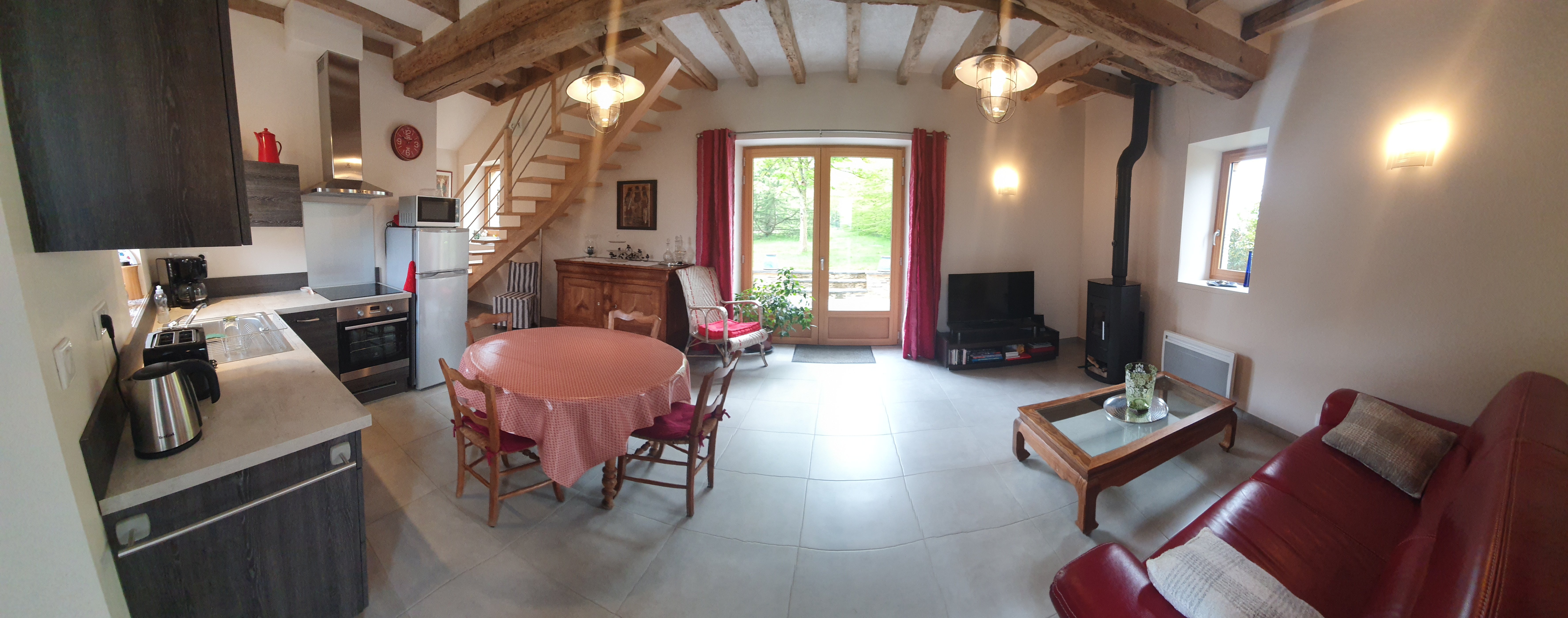 Au rez-de-chaussée, un grand salon séjour avec poêle à bois, canapé et télévision, une cuisine aménagée avec lave-vaisselle, une salle de bain avec douche à l’italienne, baignoire et lave-linge. A l’étage, deux chambres donnant sur la campagne environnante avec literies de 160 et 140.