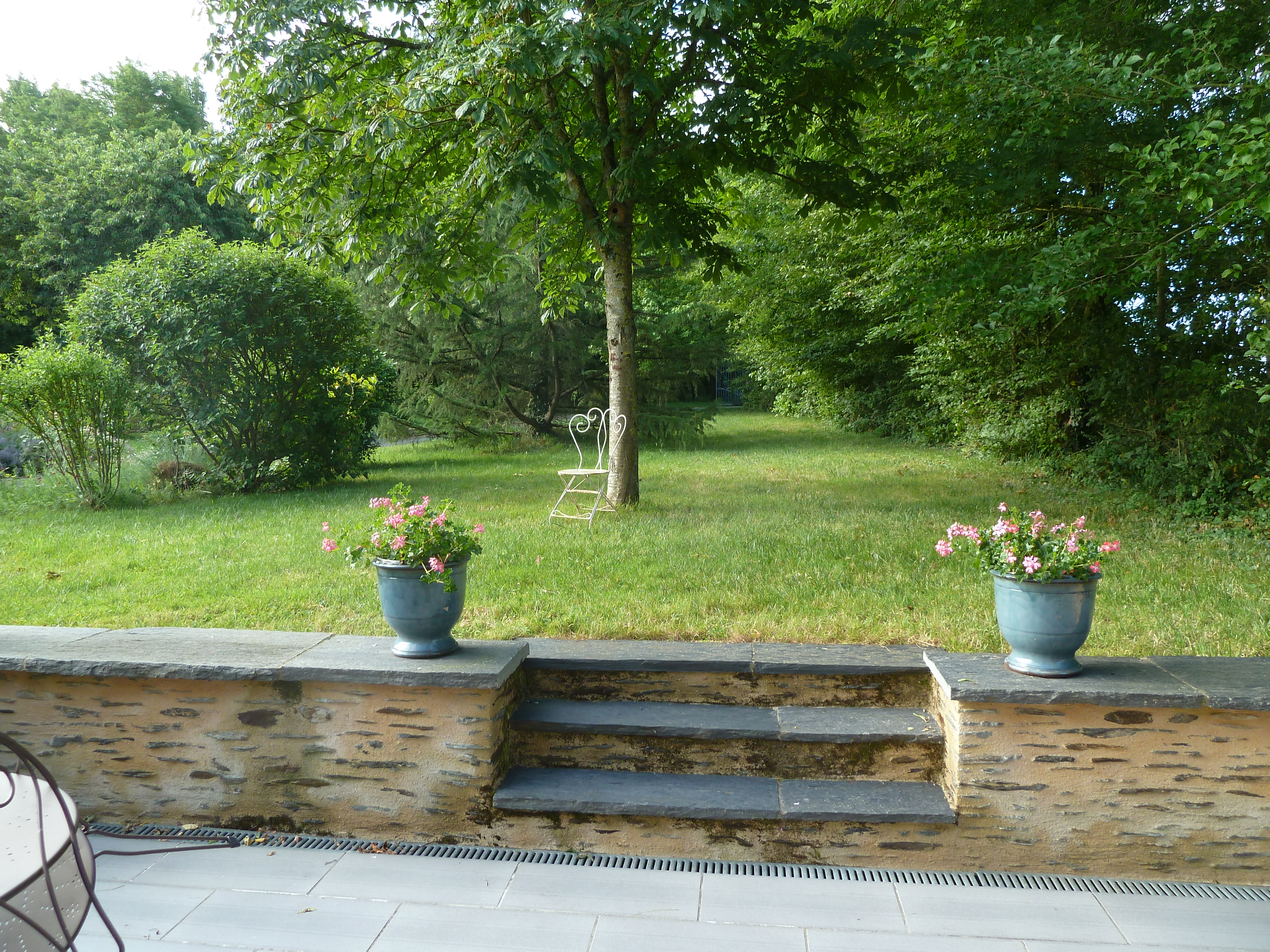 L’extérieur s’ouvre sur une grande terrasse et donne l’accès à l’ensemble de la propriété (jardin, bois, prés, étang).