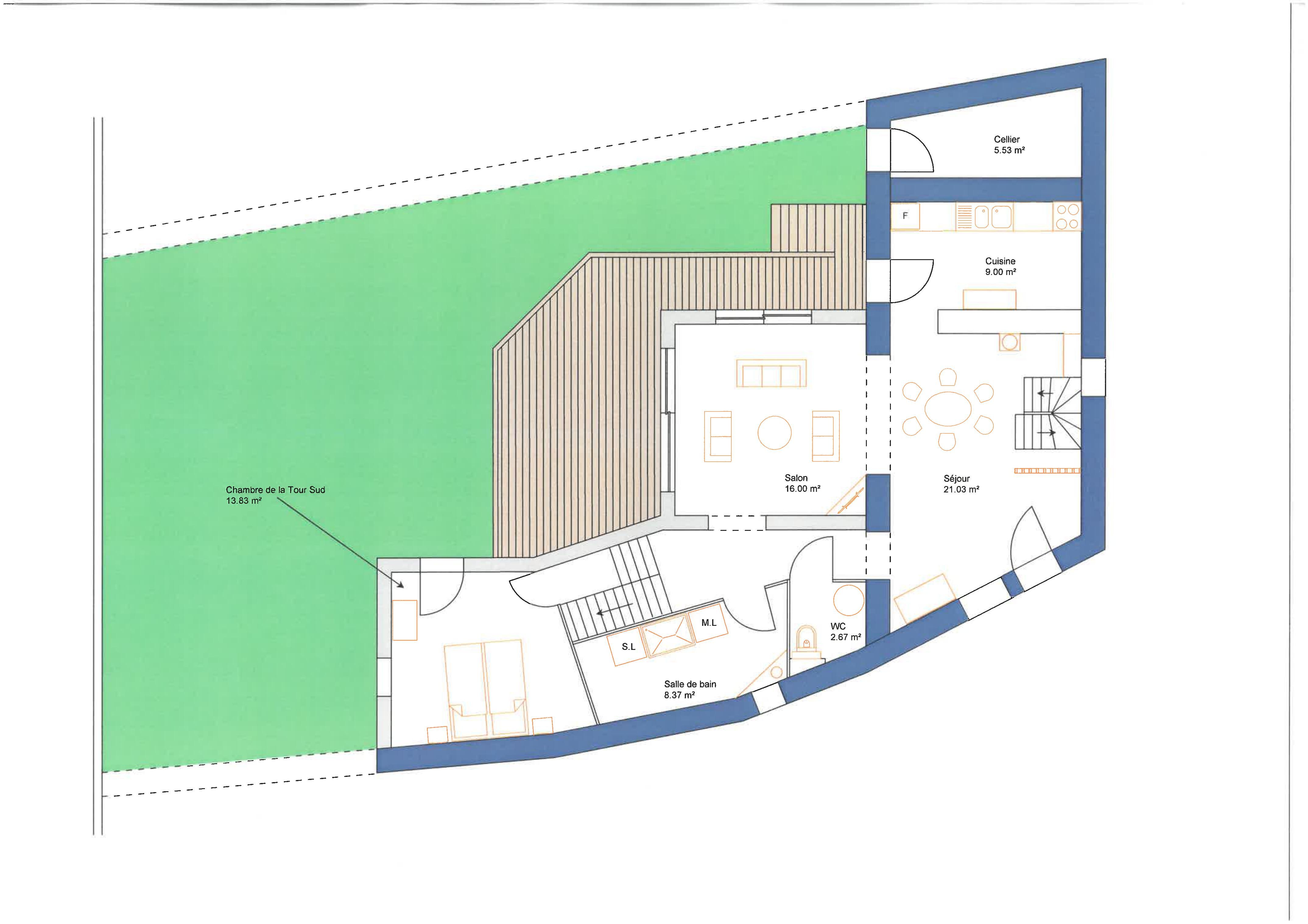 Au pied des remparts de la cité médiévale de Sainte Suzanne, classée parmi les « Plus Beaux Villages de France », cette maison indépendante allie le charme d’une partie ancienne rénovée à une extension contemporaine en bois.