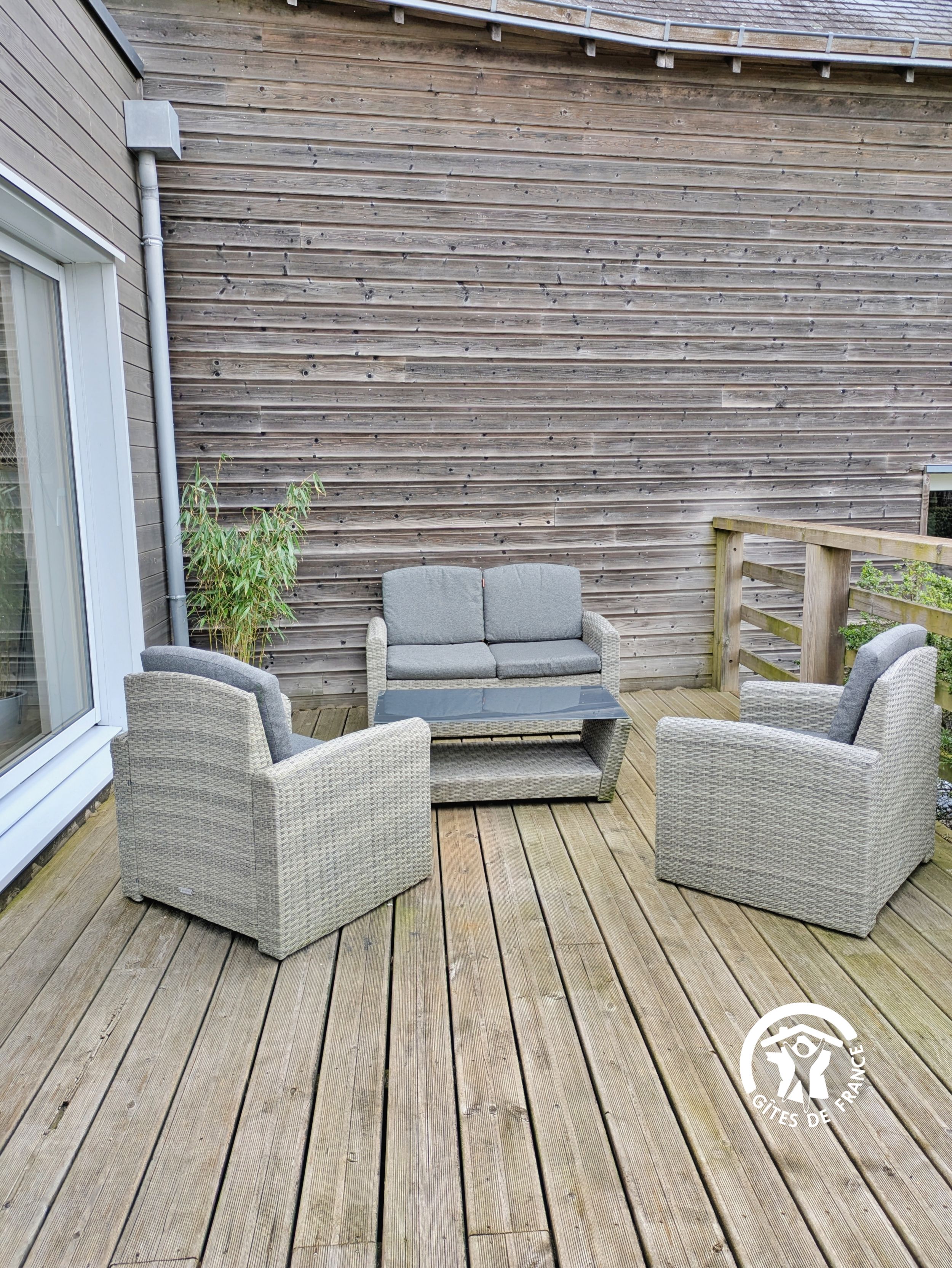 À l’extérieur, vous profiterez d’une terrasse sur pilotis avec un accès direct au salon, ainsi que d’une seconde terrasse au fond du jardin, équipée d’un coin repas et d’un barbecue. Le terrain clos assure un environnement sécurisé pour les enfants.