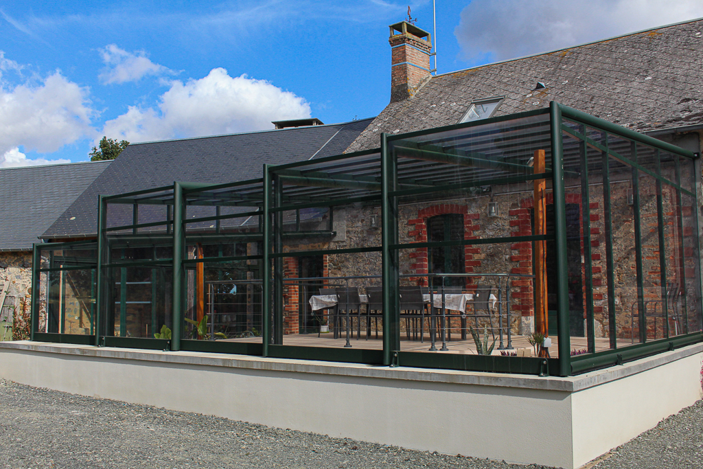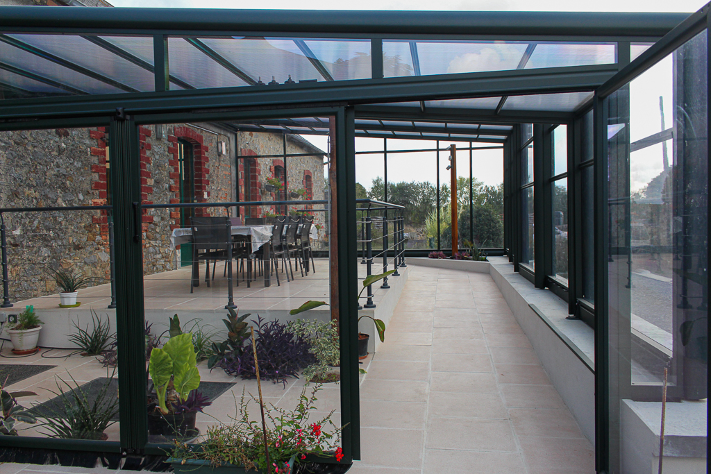 – une terrasse directement accessible depuis la cuisine, couverte avec un abri, offrant ainsi une pièce à vivre supplémentaire quelque soit le temps et la saison. Cet abri peut également coulisser facilement de chaque côté afin de profiter de la terrasse en plein air.