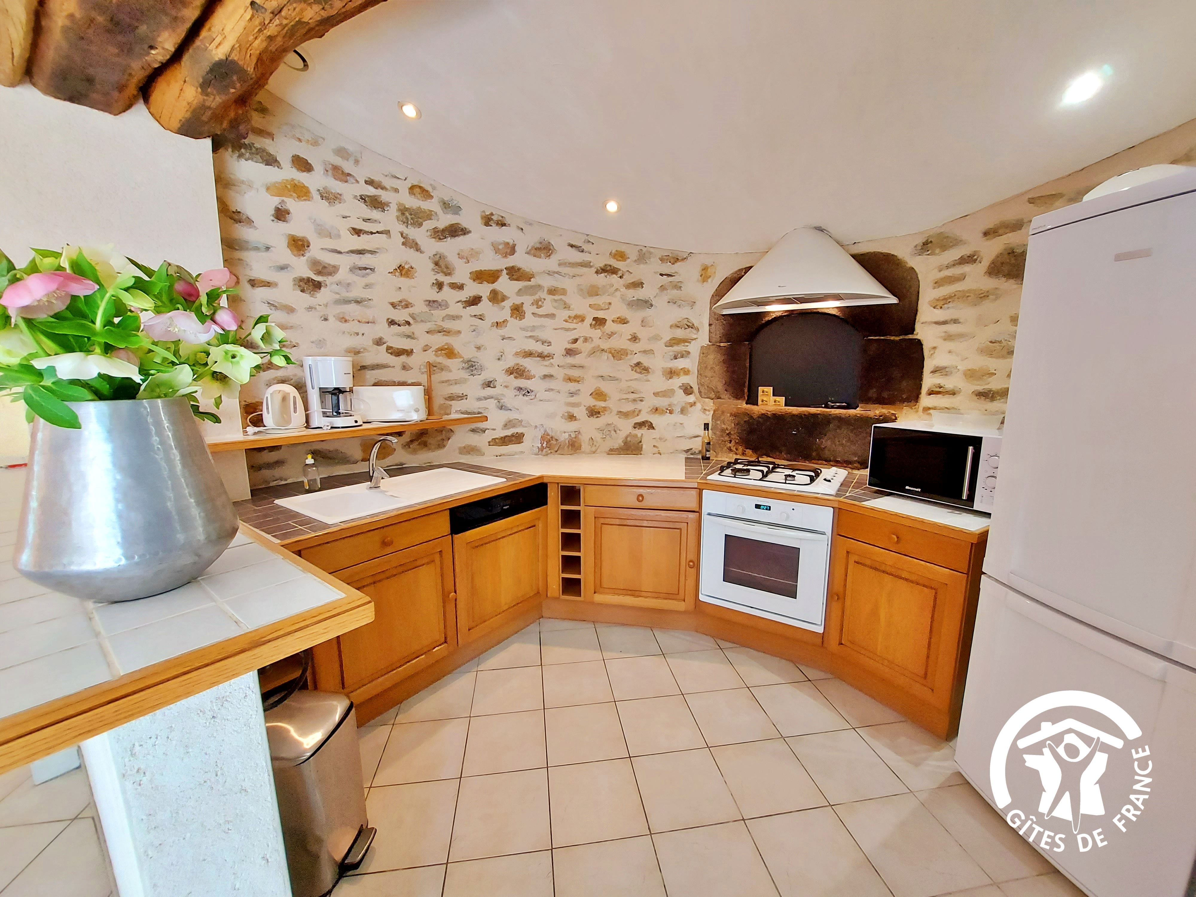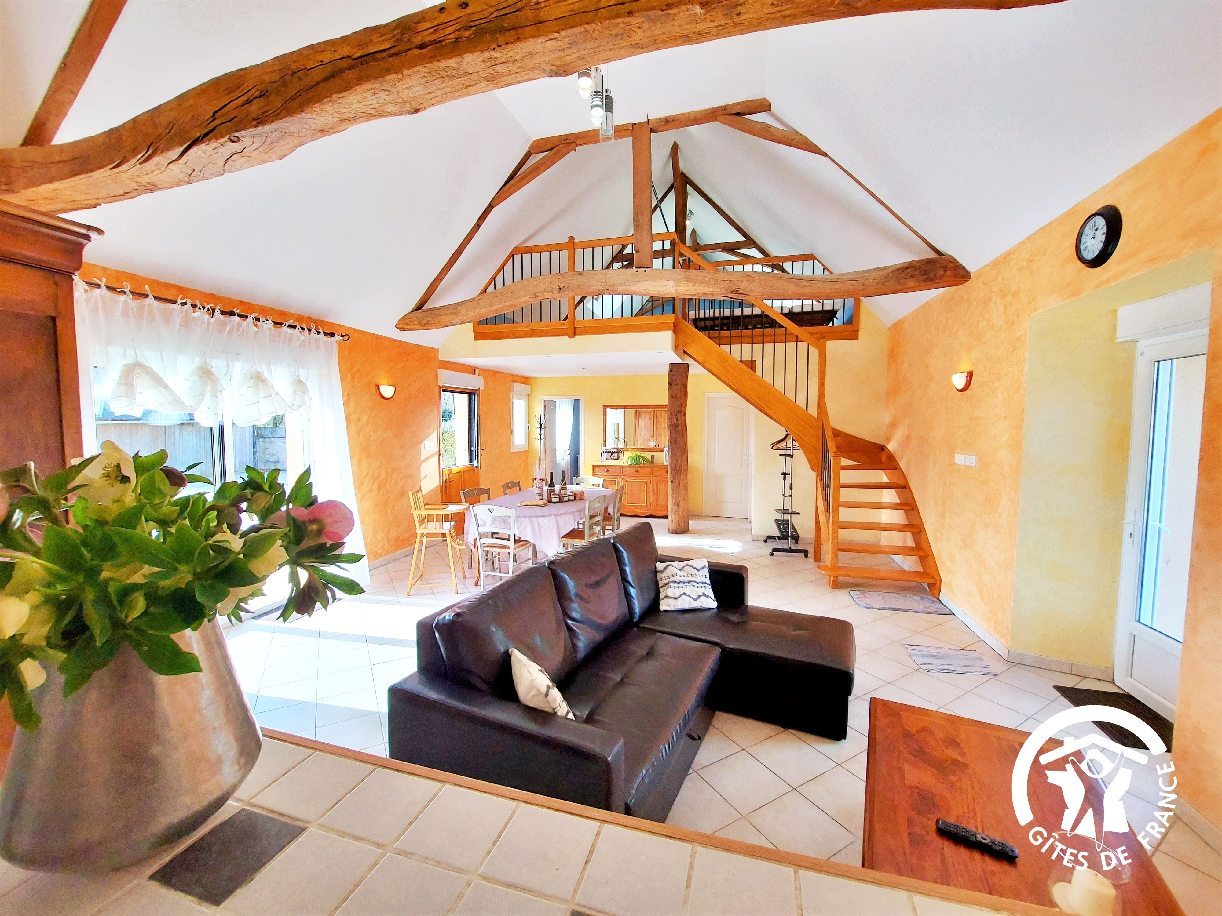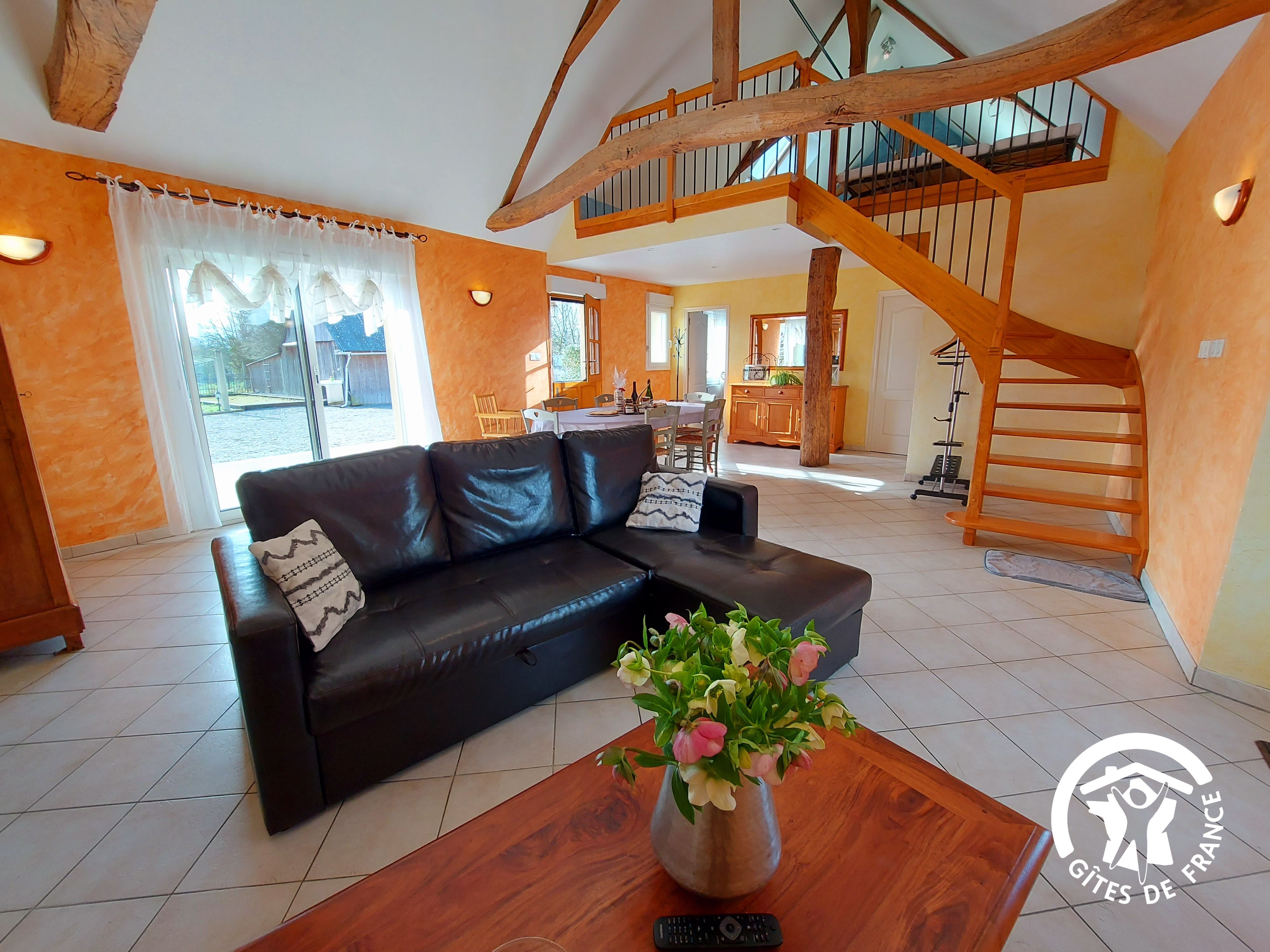 Le gîte du Brame est une maison lumineuse avec sa baie vitrée ouverte sur la terrasse plein Sud. En rez-de-chaussez, vous disposez d’une cuisine installée dans l’ancien four à pain, ouverte sur le grand séjour de 41m², une chambre et les sanitaires (WC indépendants). Les poutres apparentes donnent une impression d’espace augmenté. En mezzanine, la chambre propose 2 lits 140*190.