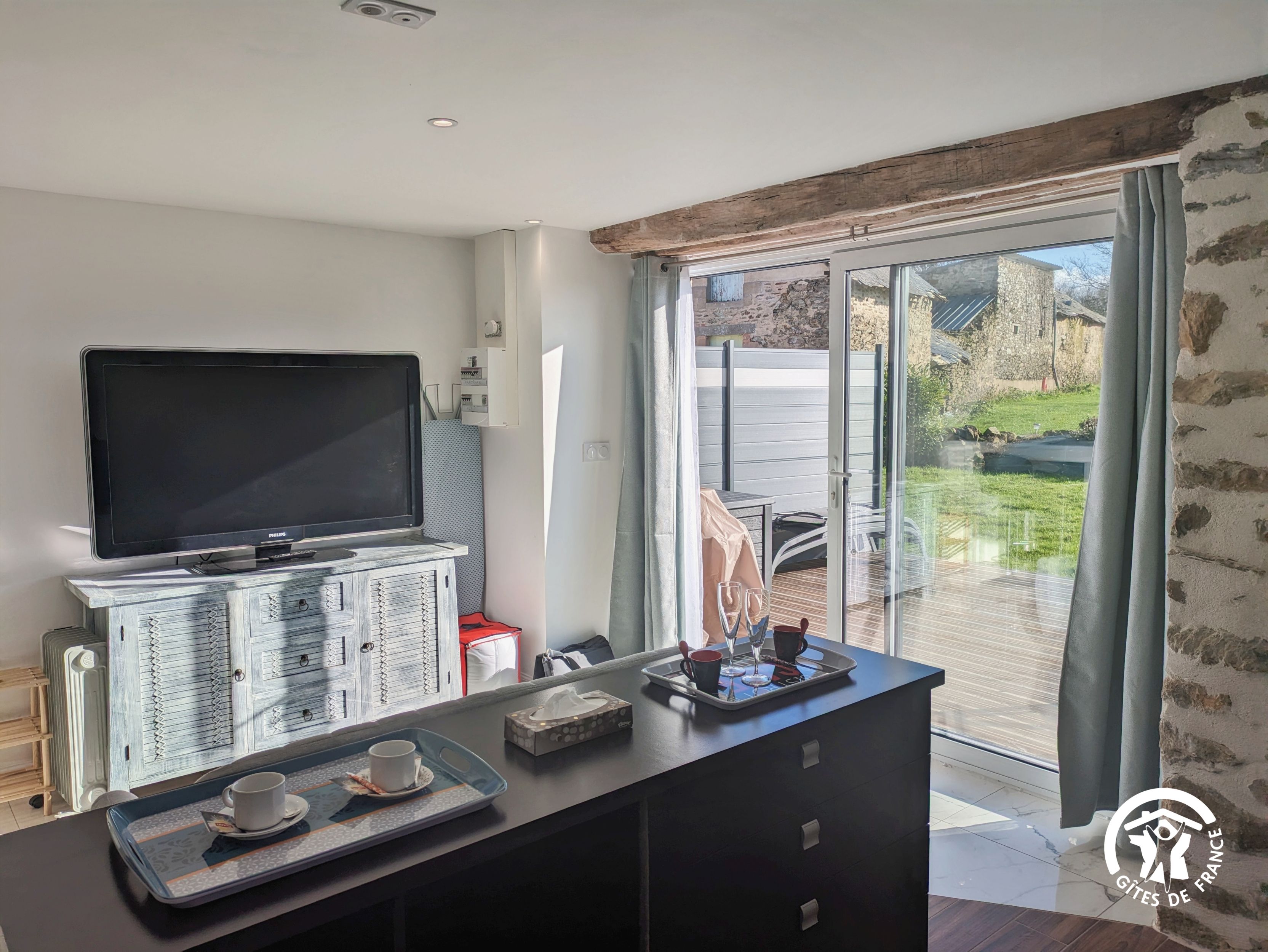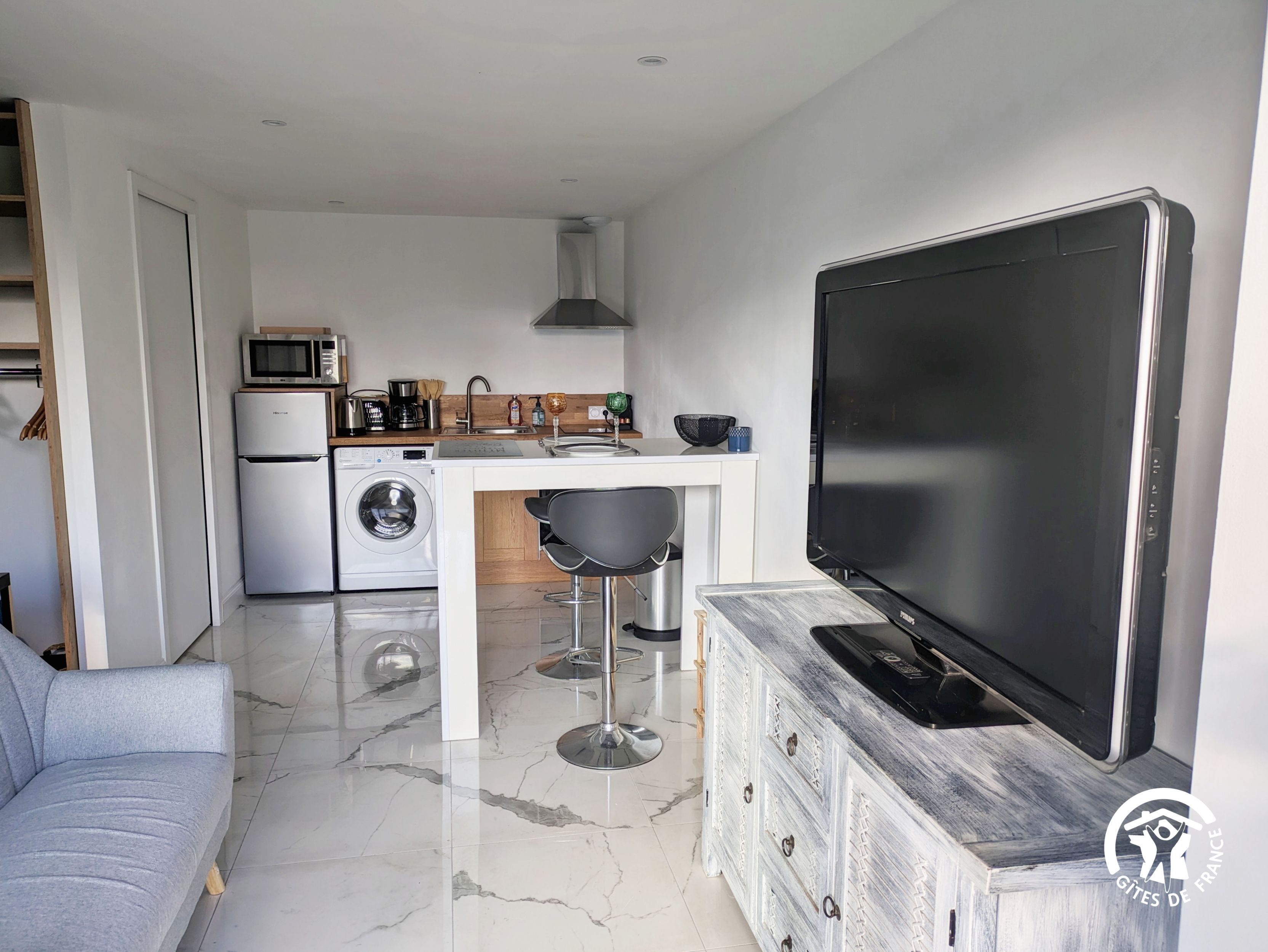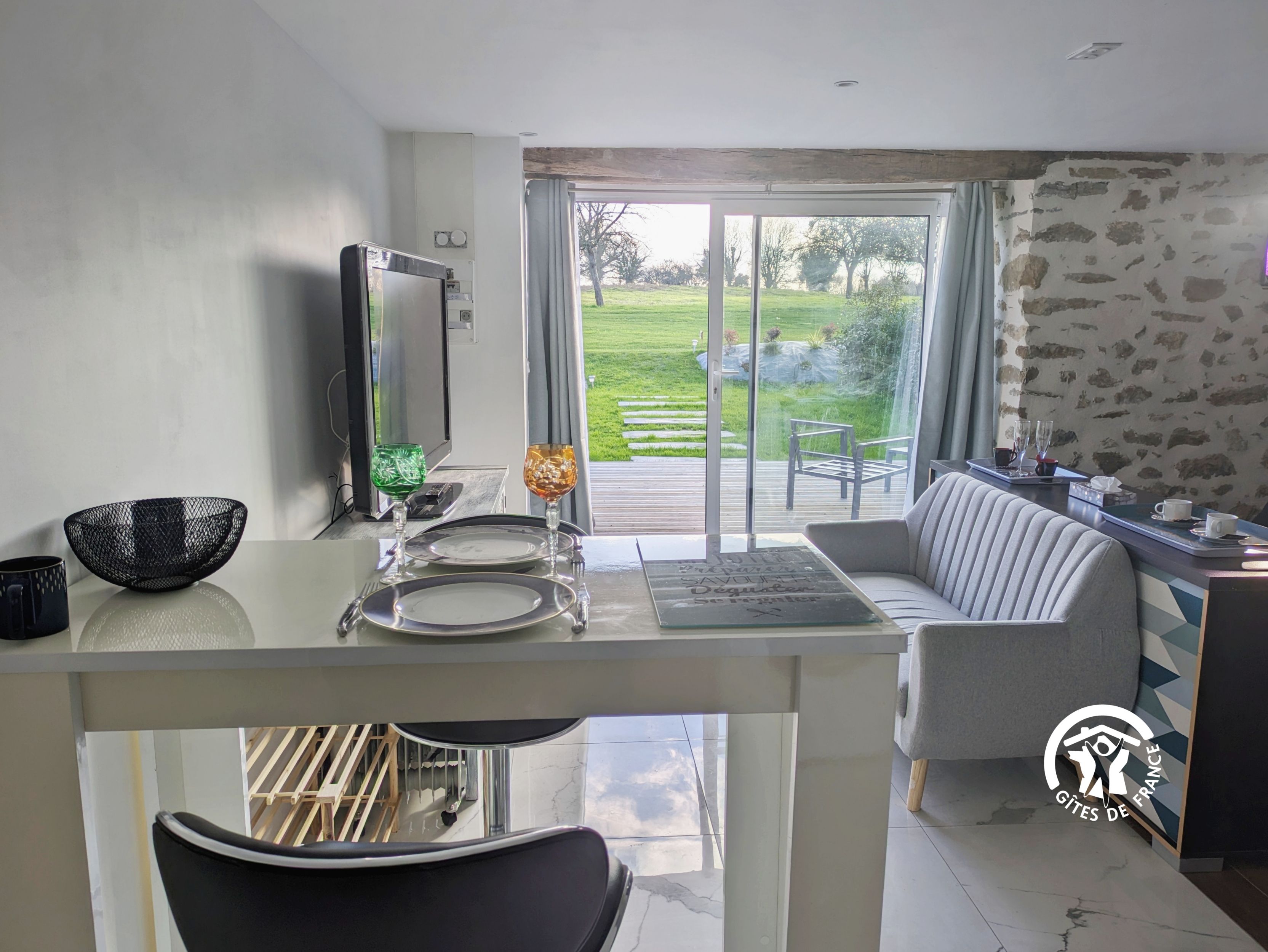 Depuis la terrasse exposée plein sud, vous profiterez d’une vue dégagée sur la campagne environnante invitant au calme et à la détente. Confort assuré grâce aux équipements et services inclus (cuisine équipée, lits faits, linge de toilette fourni, belle literie, grand écran tv).