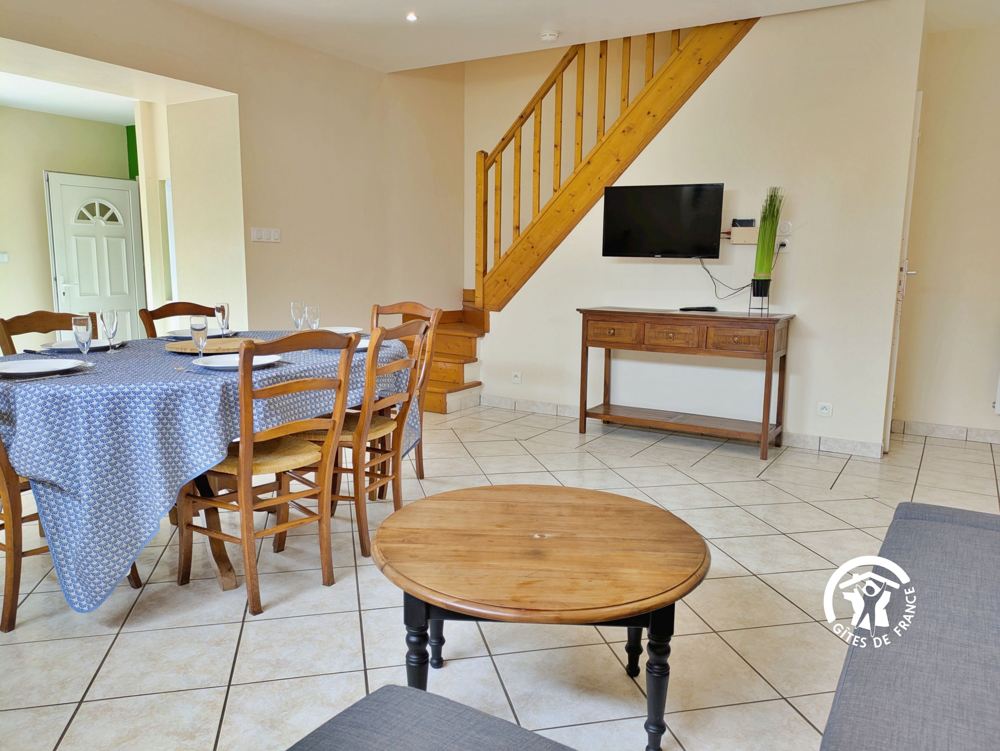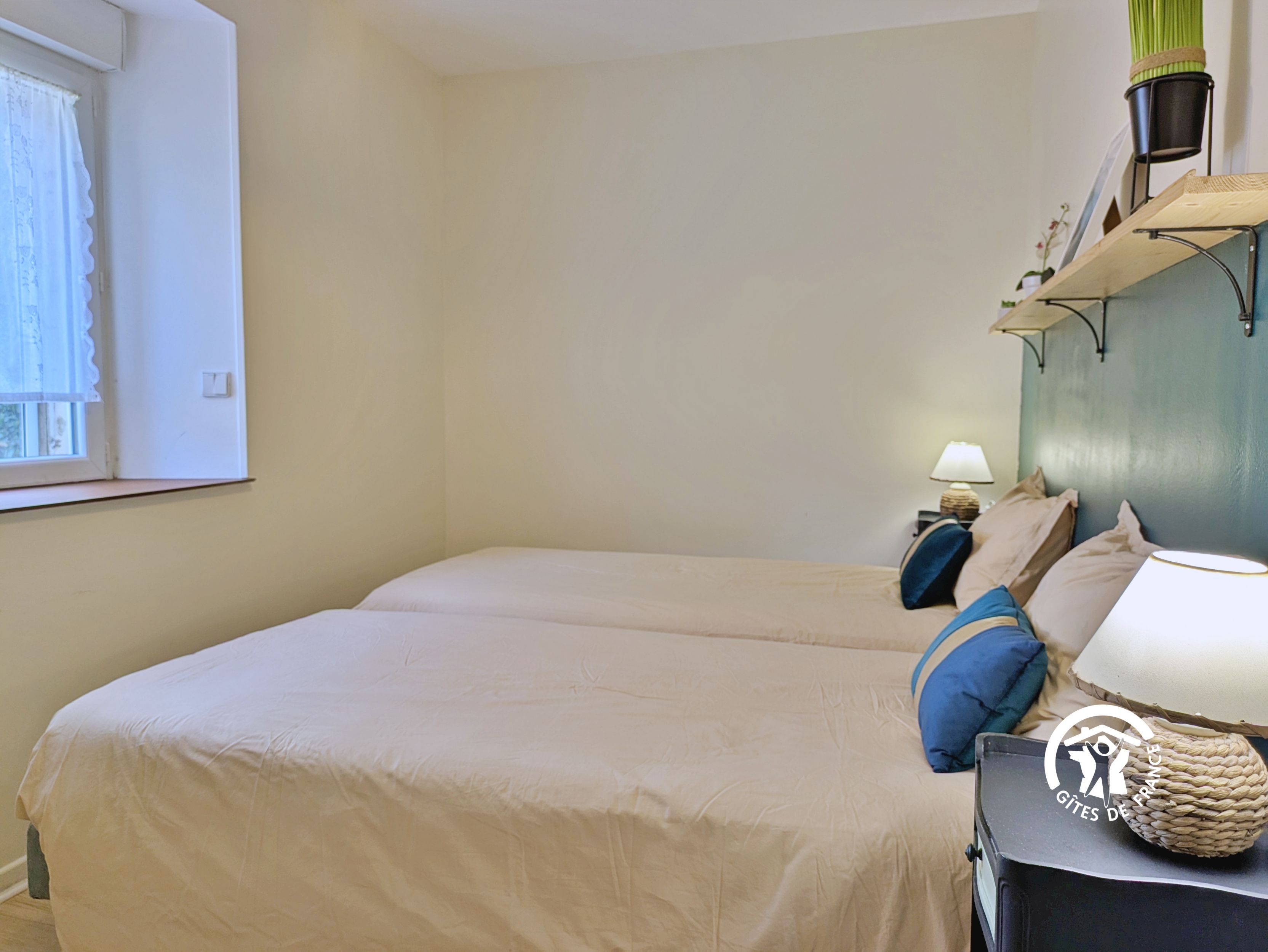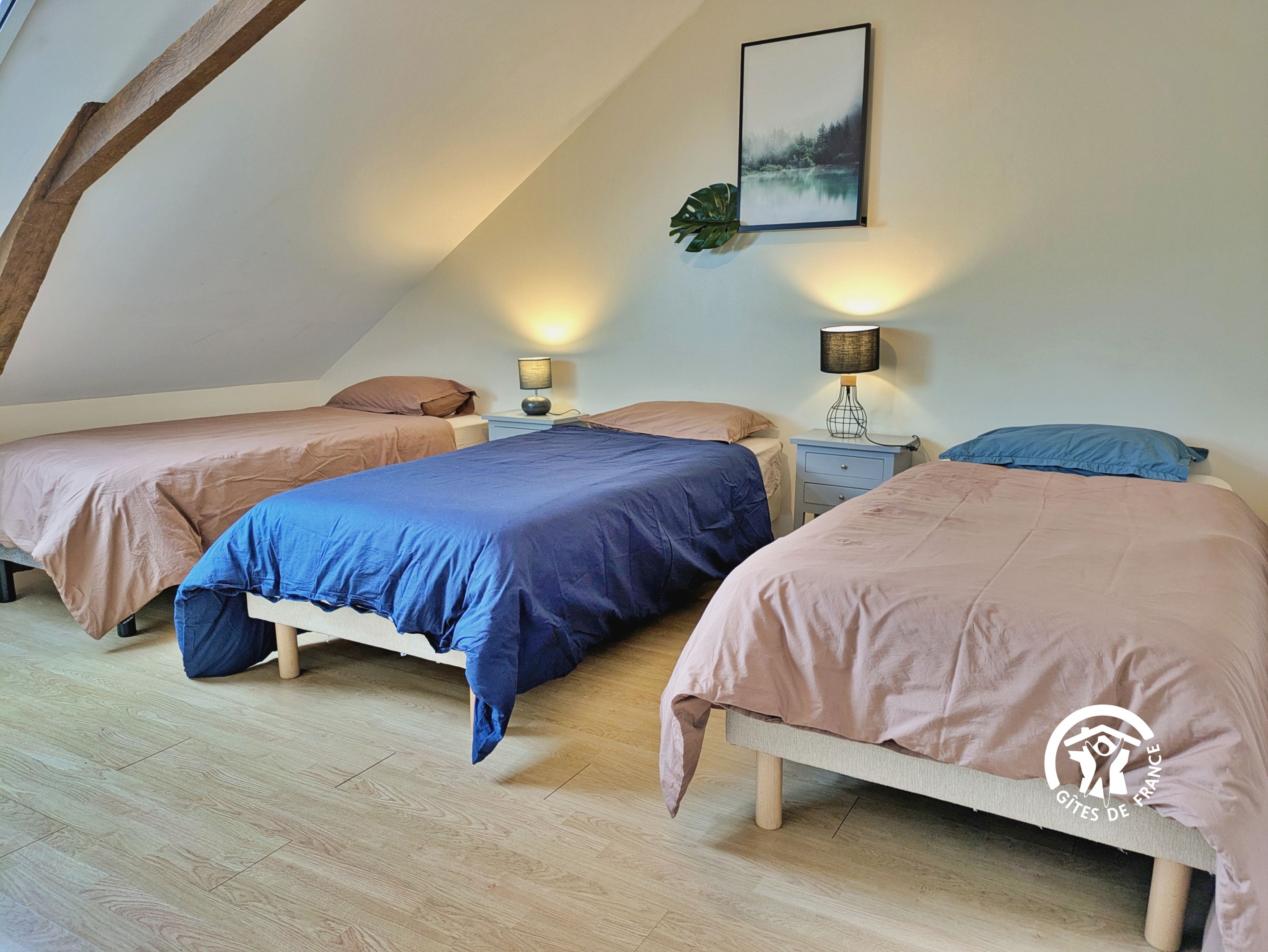 Le logement se compose de trois chambres, dont une au rez-de-chaussée (accès par 2 marches depuis le salon), de deux salles d’eau, et une pièce de vie avec cuisine ouverte sur le salon. La literie est modulable (lits 90×200 rapprochables pour former un grand lit).