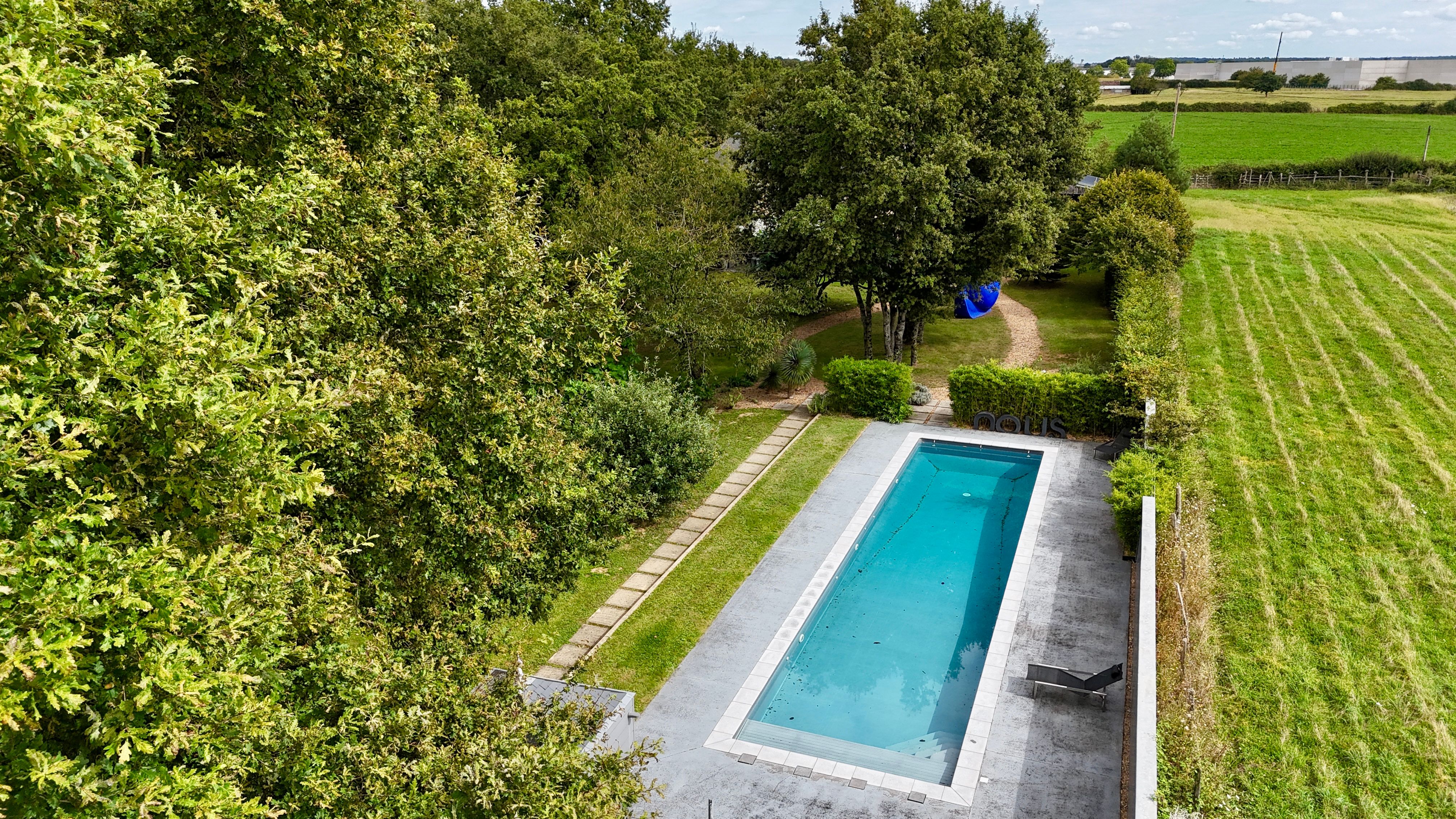 La piscine est sécurisée par un rideau électrique à accroche manuelle, conçu pour la sécurité des enfants en bas âge.