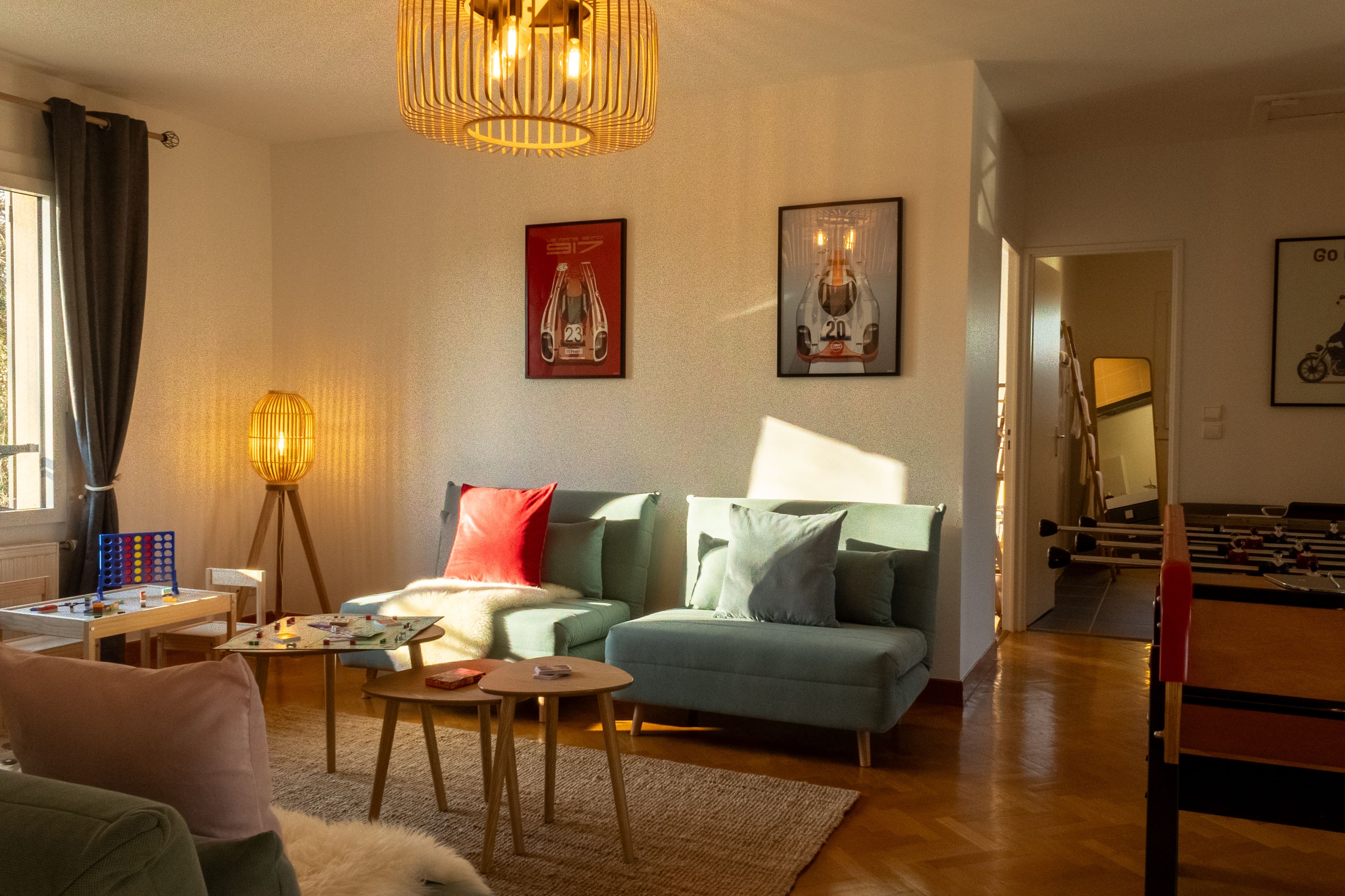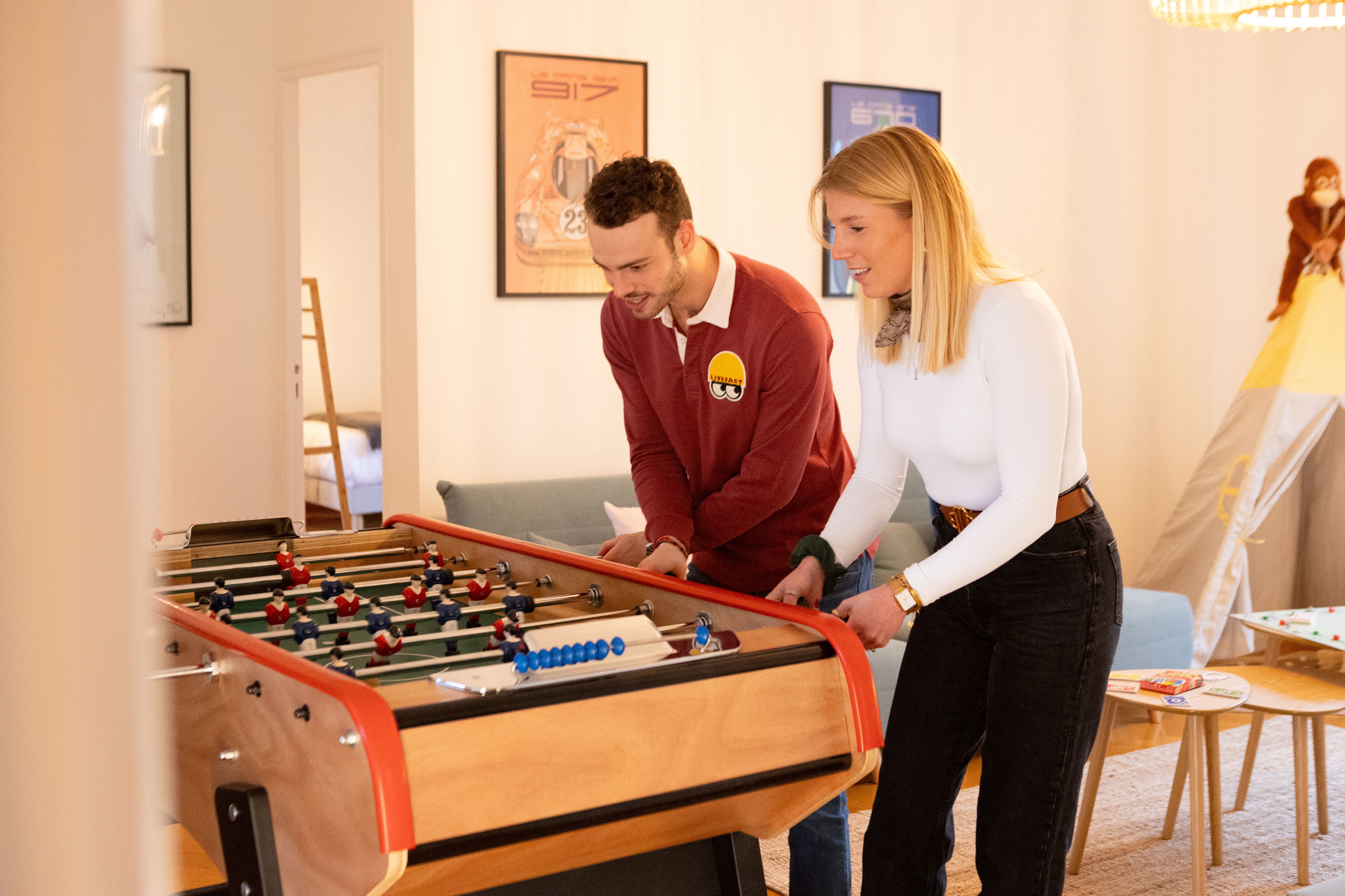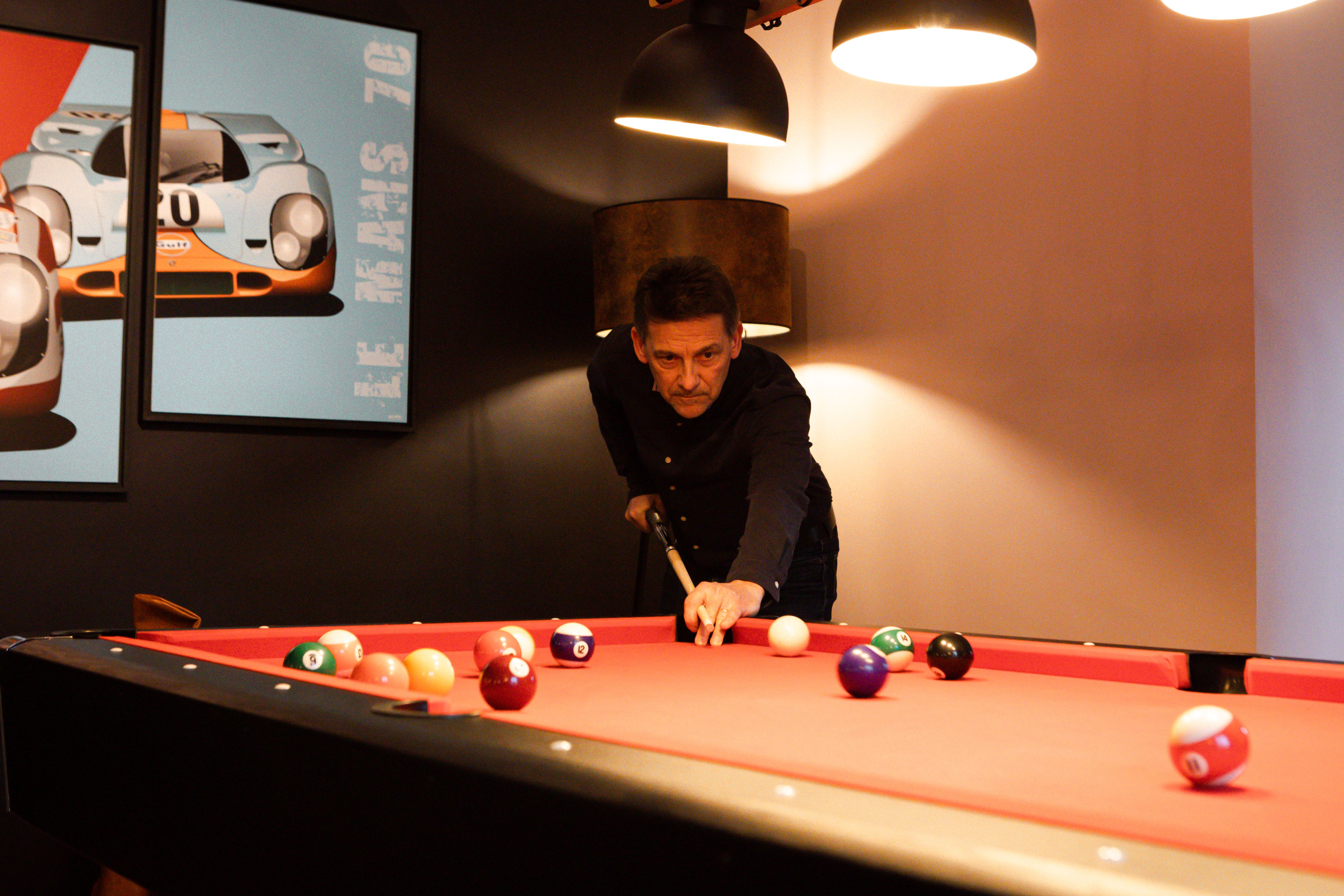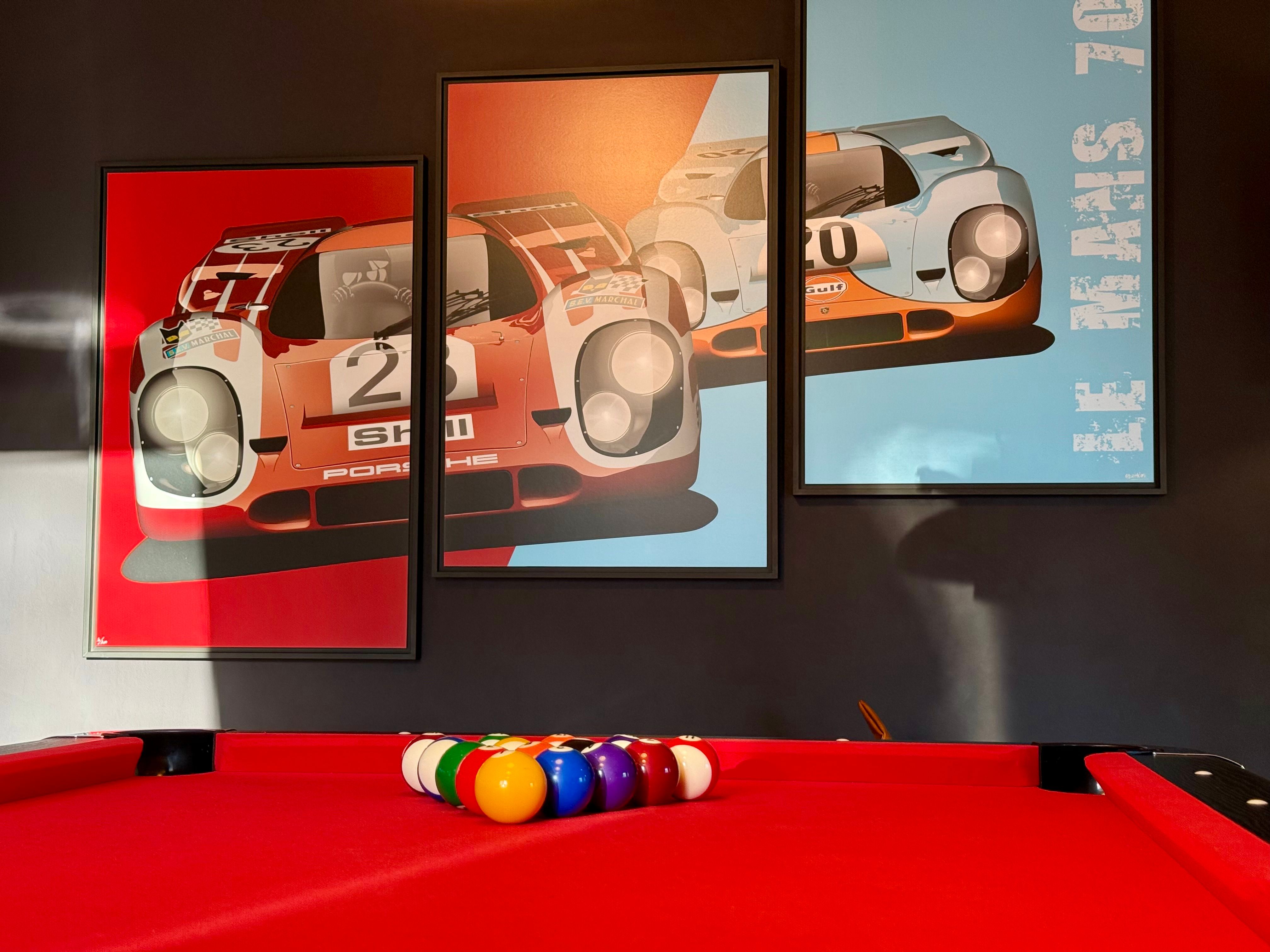 À l’intérieur, vous retrouverez un grand salon détente équipé d’un billard, de canapés confortables et d’un ensemble de jeux de société le tout dans une décoration automobile en clin d’oeil avec l’histoire du Mans.
