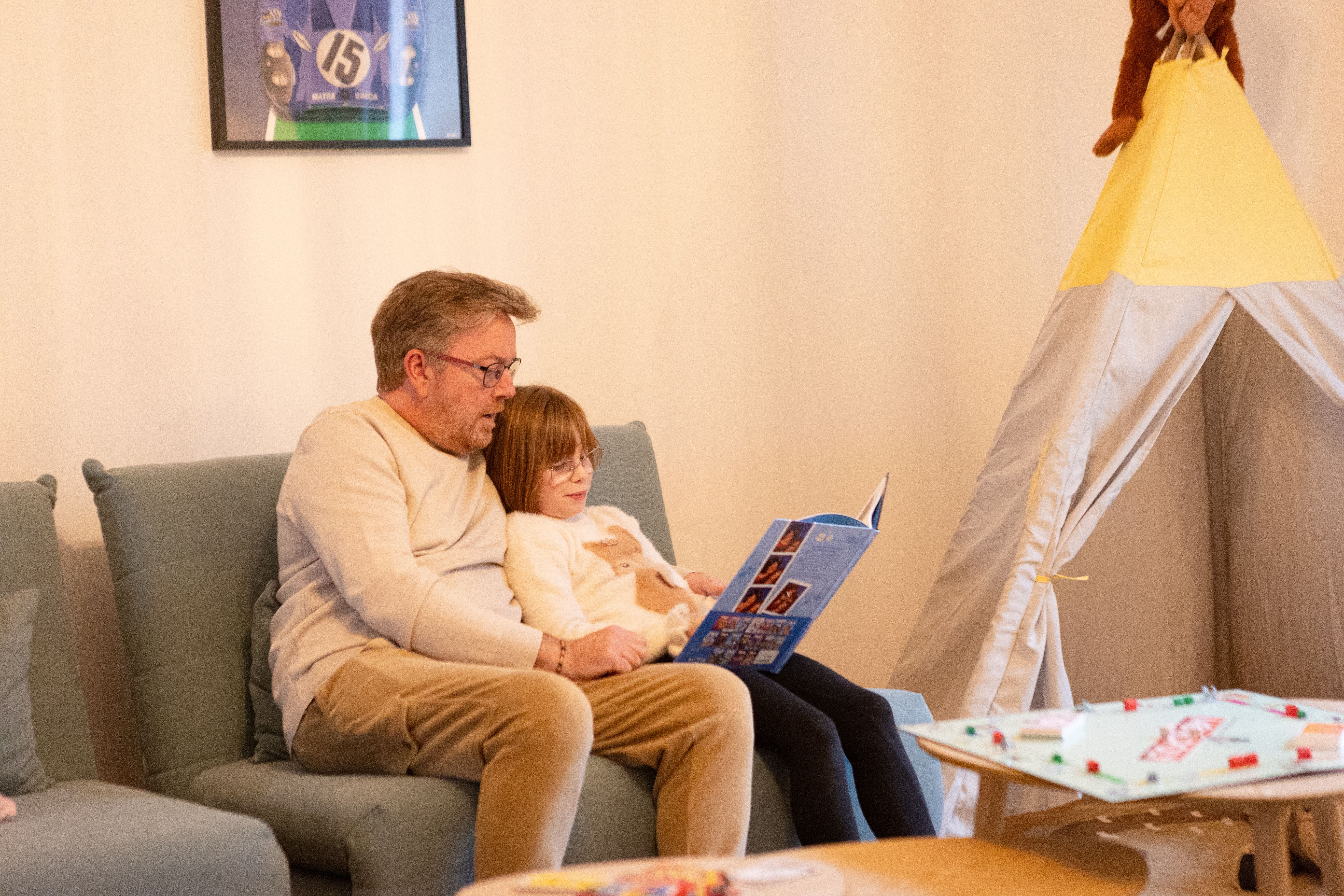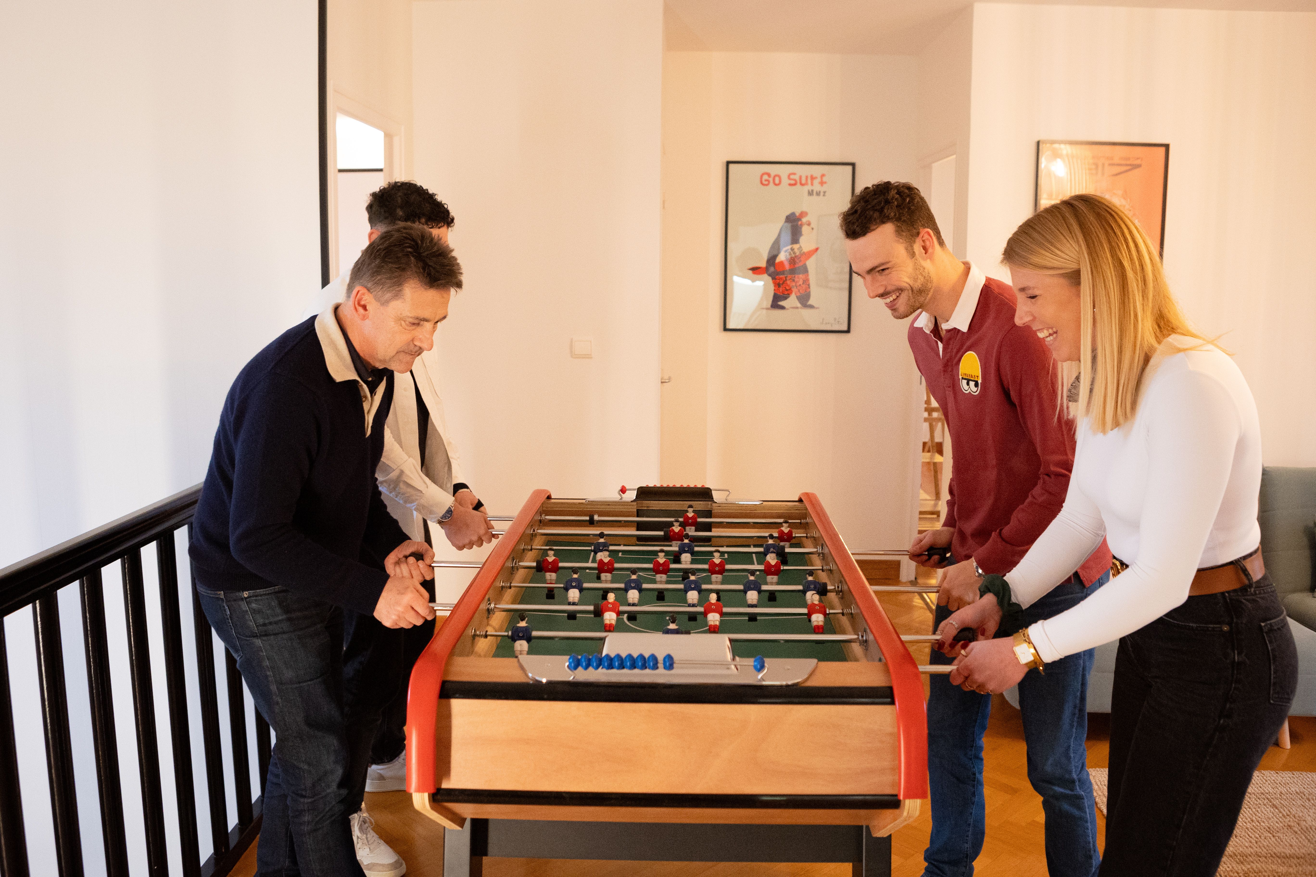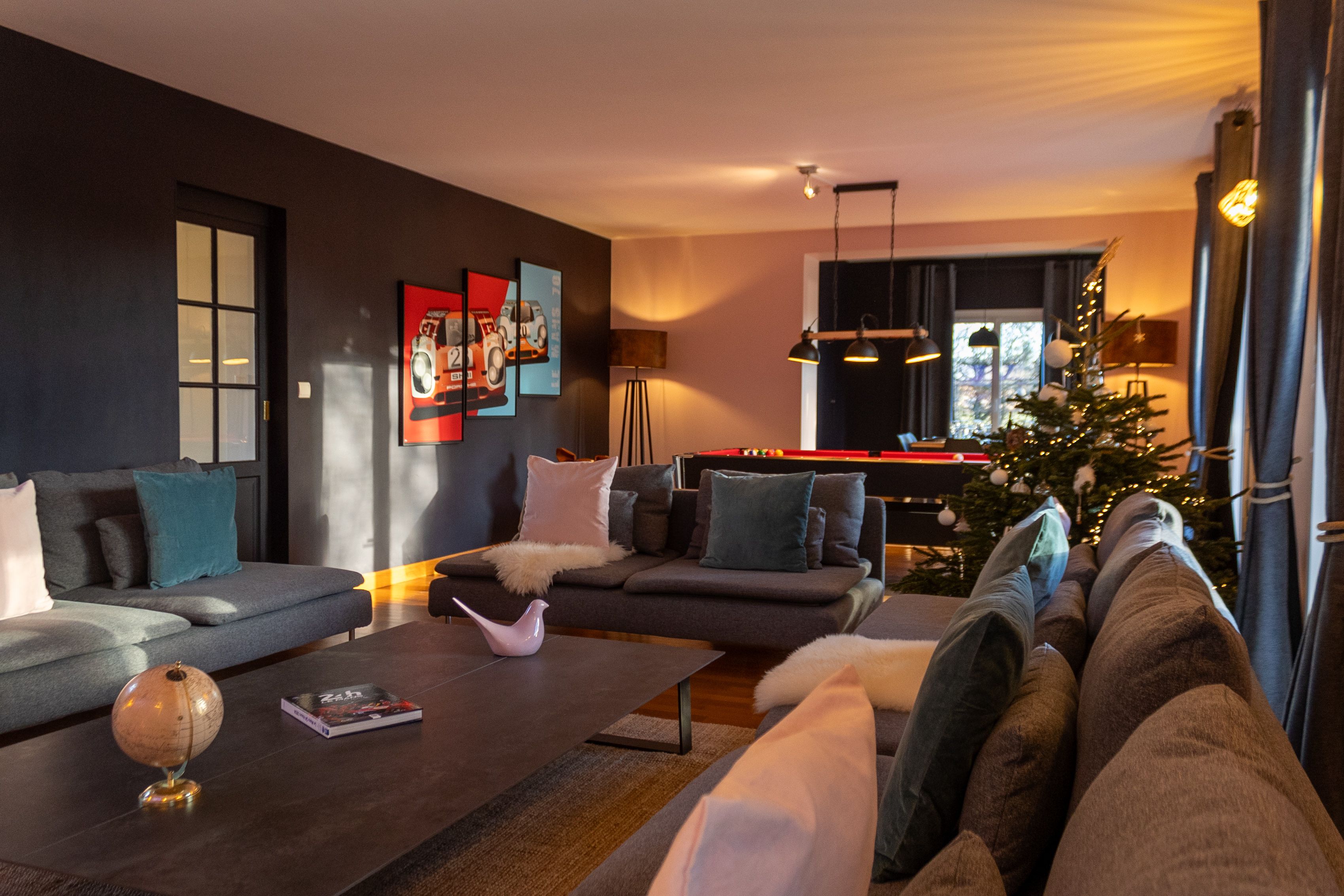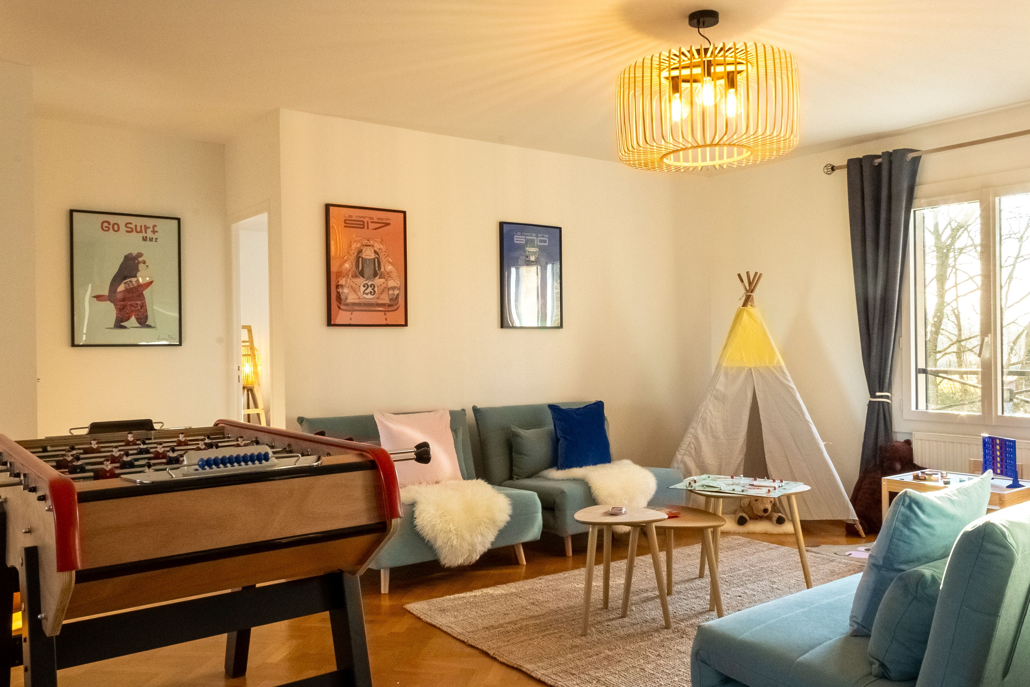 À l’intérieur, vous retrouverez un grand salon détente équipé d’un billard, de canapés confortables et d’un ensemble de jeux de société le tout dans une décoration automobile en clin d’oeil avec l’histoire du Mans.