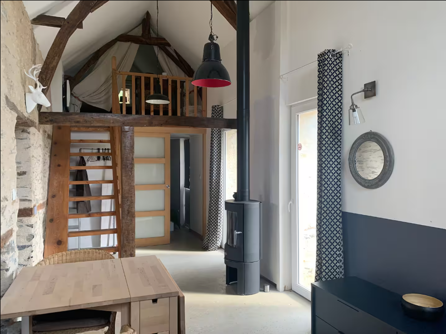 Gîte à la campagne contemporain et tout équipé entre Segré et Le Lion d’Angers. Les chambres sont aménagées en mezzanine afin de pouvoir optimiser l’espace pièce de vie. Un cocon qui peut s’adapter pour les petites familles.