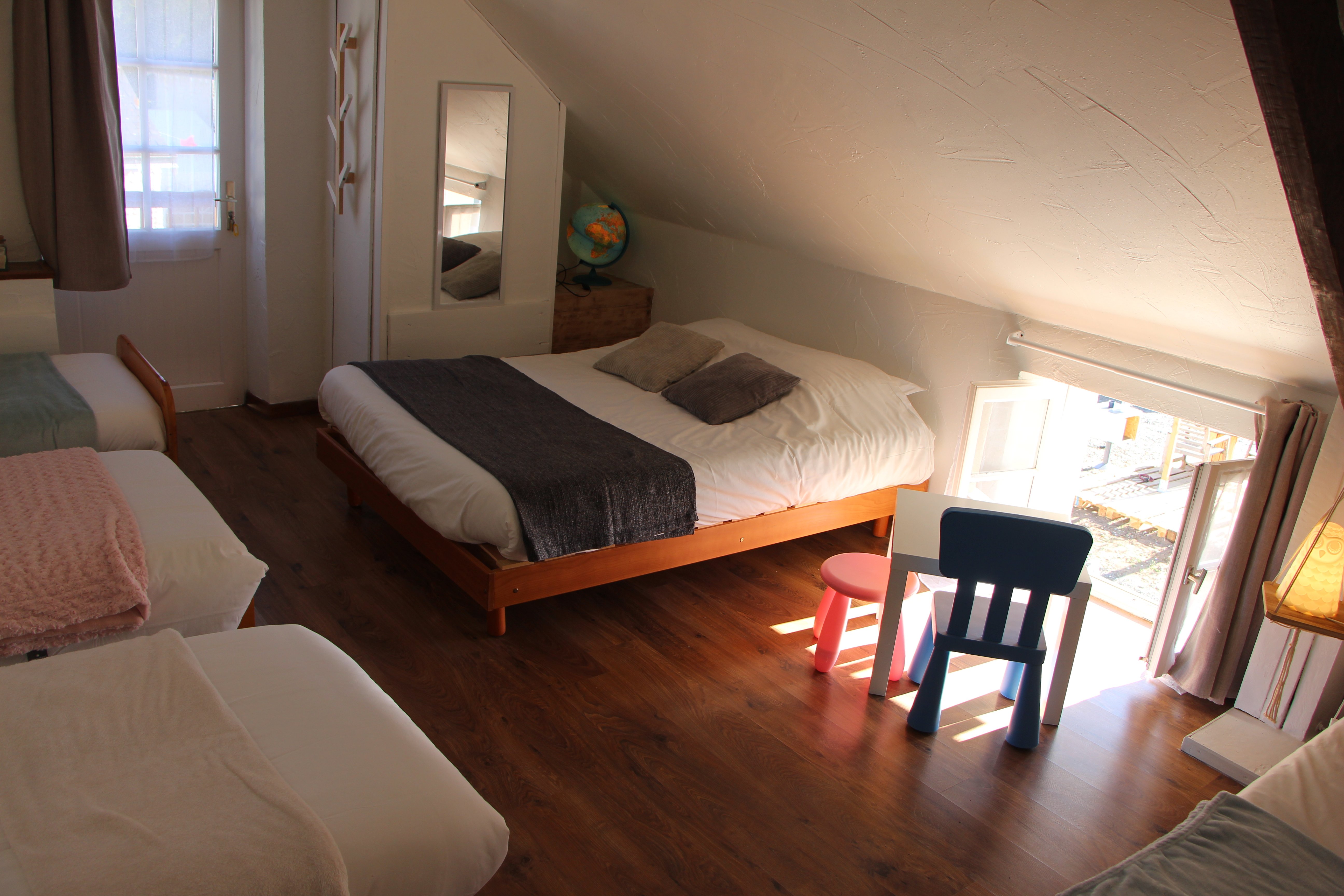 Petite maison indépendante et totalement équipée pour le confort de ses habitants. Elle se compose en rez-de-chaussée d’un grand salon/séjour, d’une grande chambre parentale (1 lit de 140 cm ) avec salle de douche et WC privatifs et d’une cuisine équipée. A l’étage, une grande chambre type dortoir est composée de 4 lits de 90 cm avec une seconde salle de douche/WC.