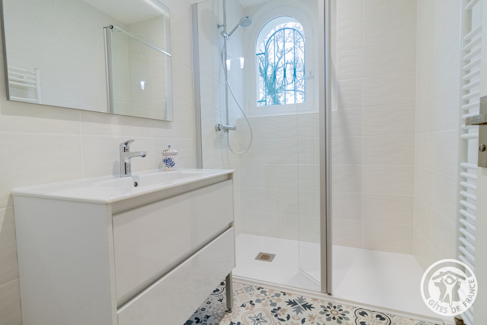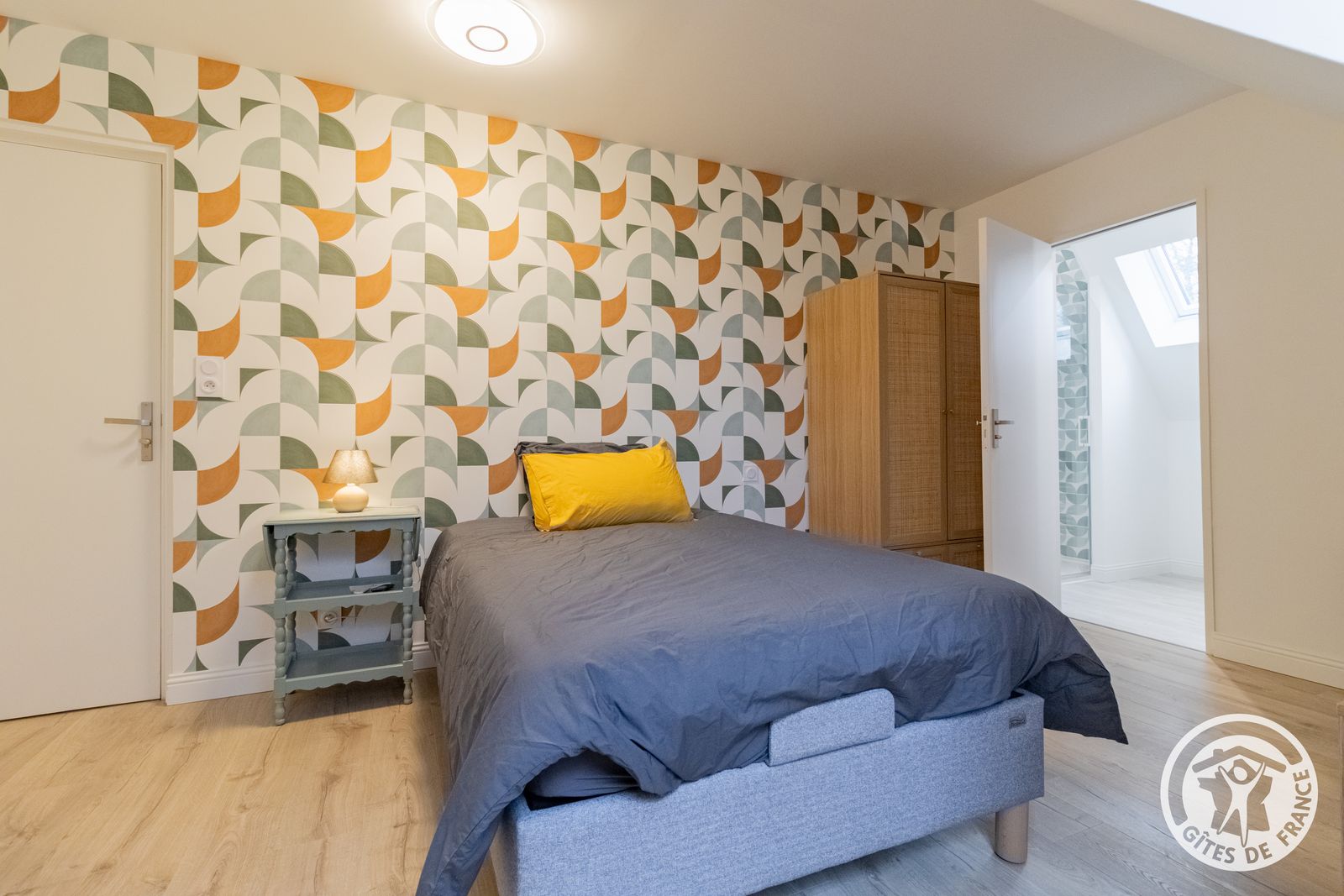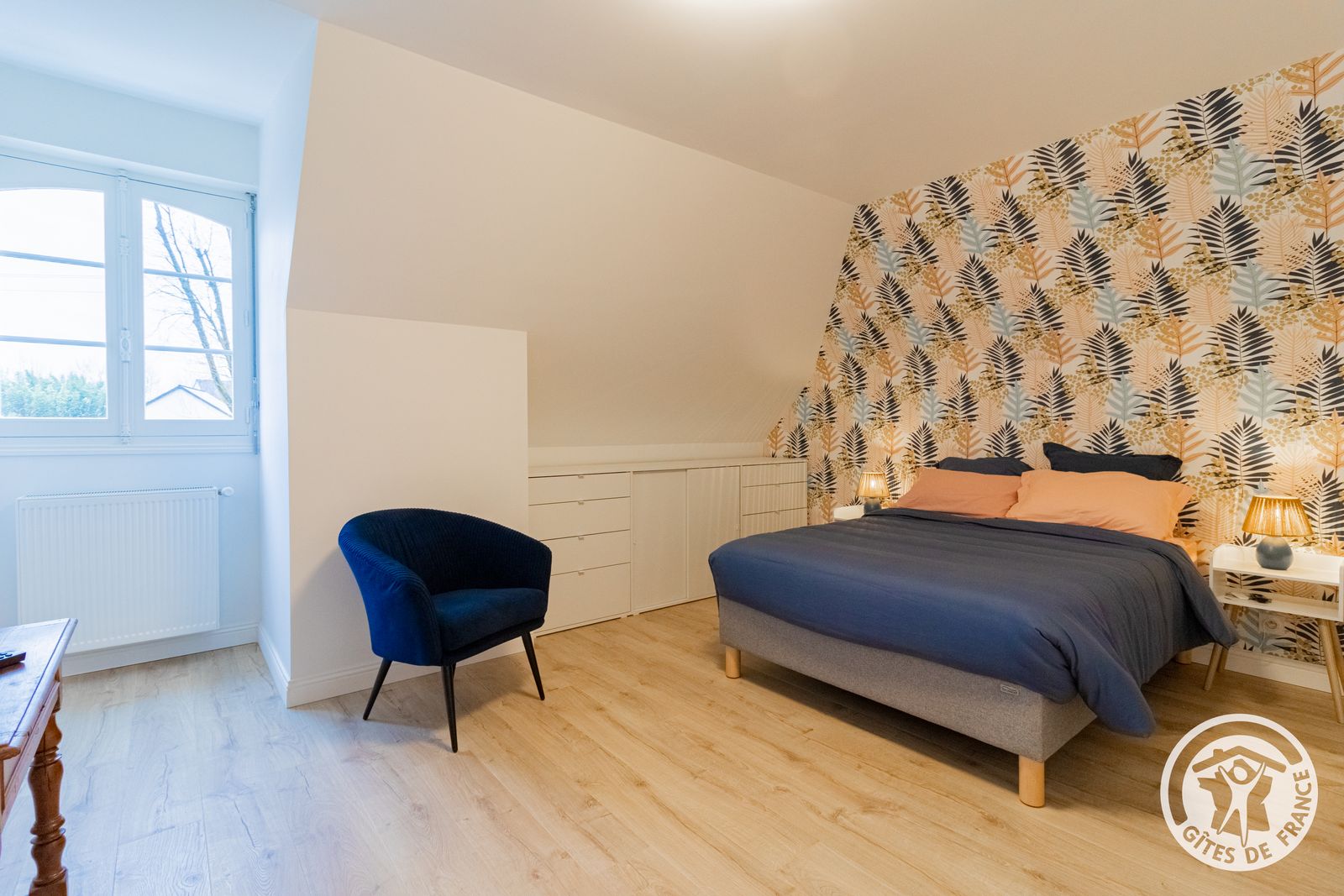 A l’étage, l’escalier monumental en bois dessert la partie Sud : dégagement avec 2 grandes chambres. La partie Nord dessert 1 chambre avec sanitaires séparés, une chambre avec un lit de 120cm, une autre chambre avec un lit de 140x200cm.
