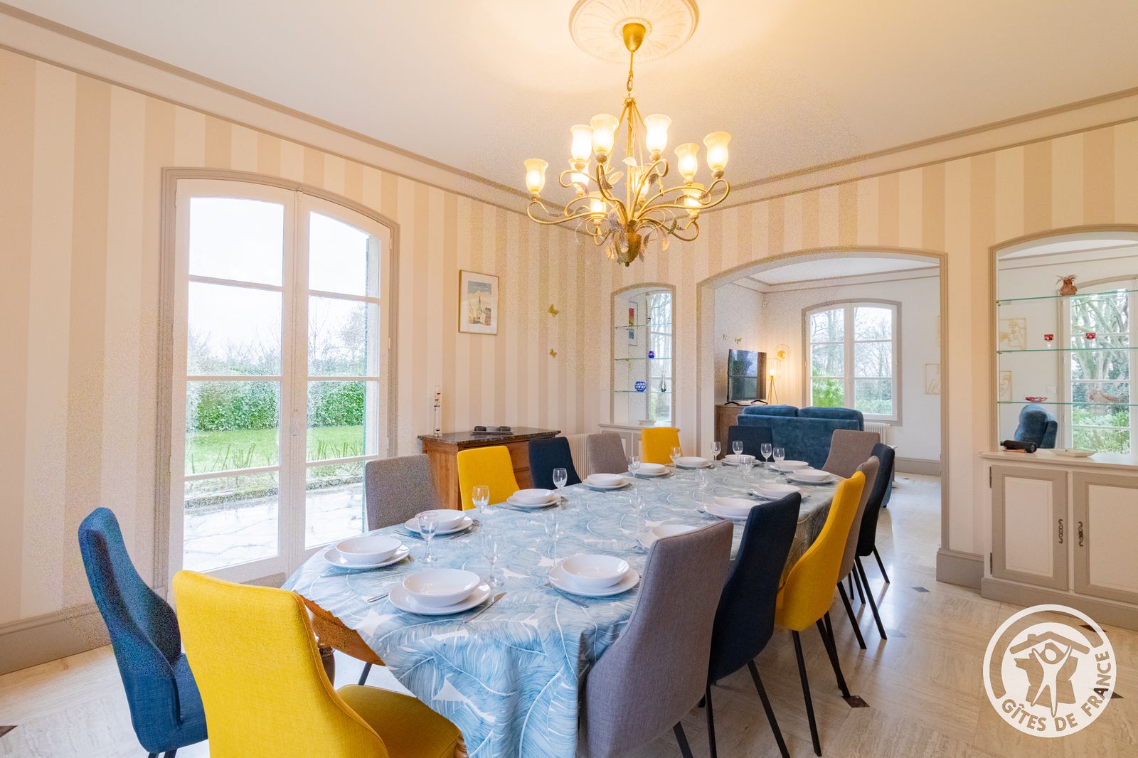 Au rez-de-chaussée, grande entrée, cuisine entièrement équipée pour des groupes avec de nombreux équipements pour préparation des repas (Cookéo, Mister Cook, robot pâtissier, grands frigos et congélateurs…), salon de thé, salon convivial pour les jeux et apéritifs devant la cheminée, salon avec télévision et canapés grand confort, grand espace repas pour 15 personnes.