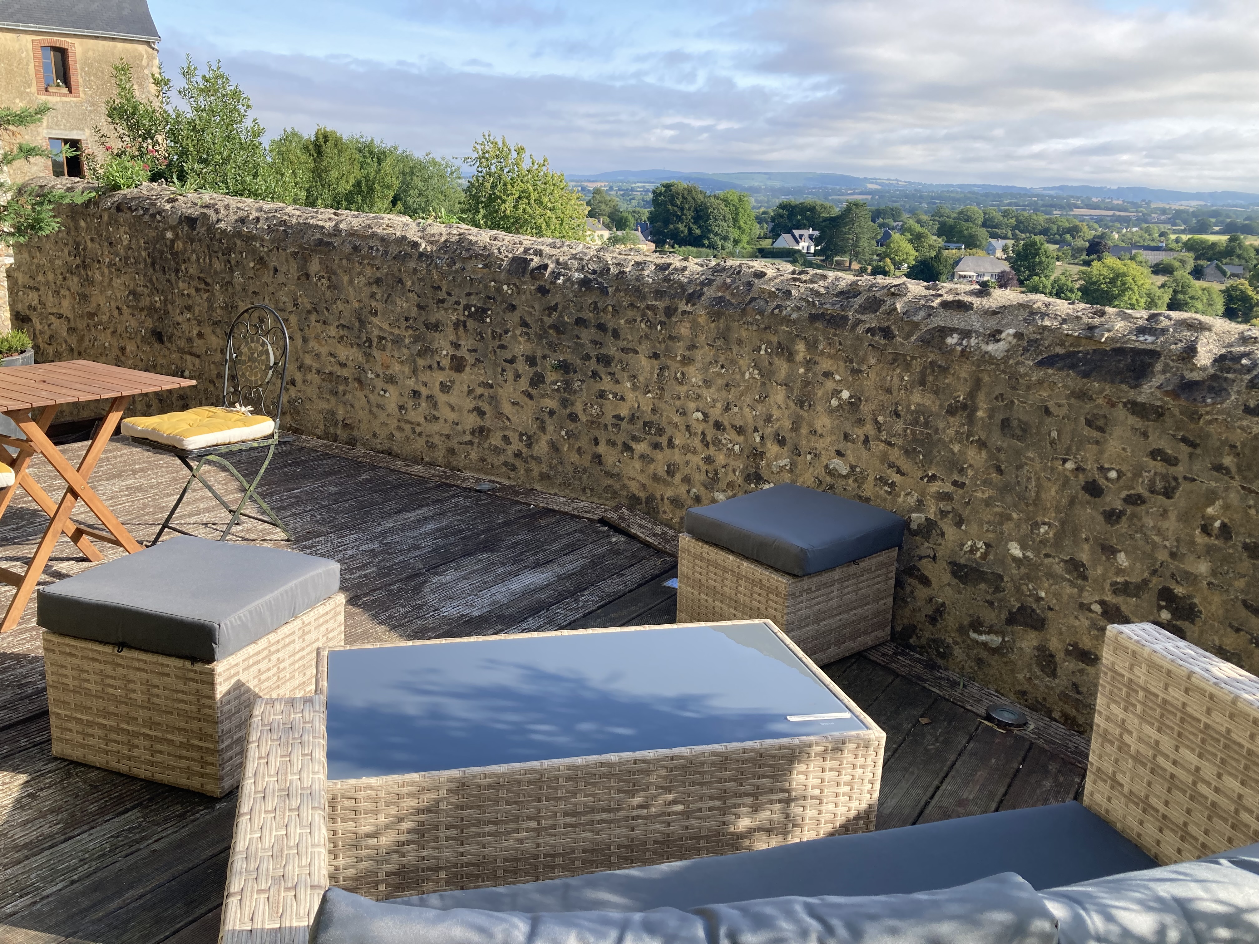 Profitez d’une terrasse avec vue imprenable sur le bocage des Coëvrons, de la vallée de l’Erve et ses moulins… cadre idéal pour un petit déjeuner ensoleillé ou tout simplement une pause contemplative au fil des heures.