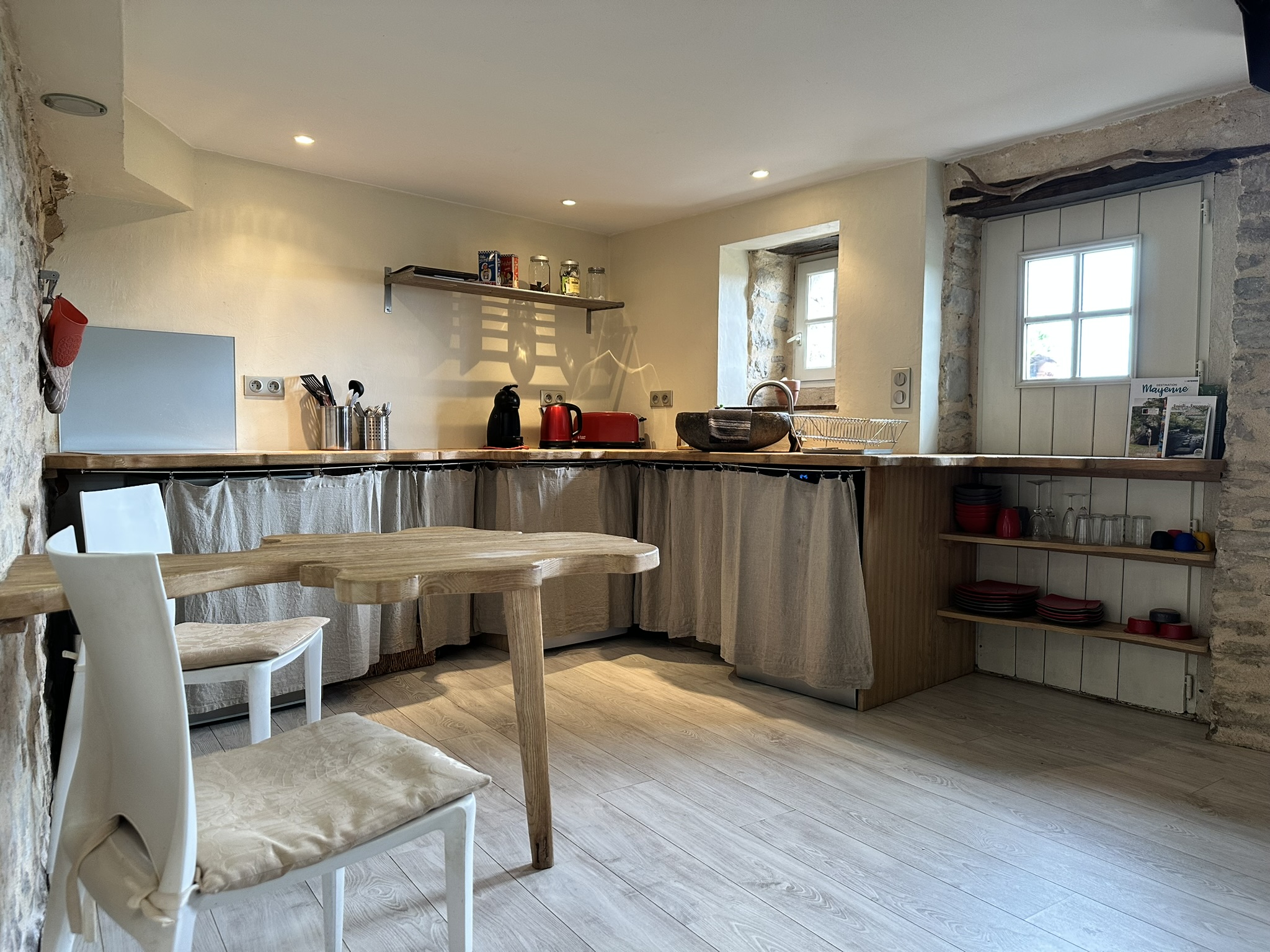 Aménagé sur deux niveaux, le gîte vous propose une cuisine équipée sur mesure et un petit coin salon. À l’étage, une belle suite parentale (lit 160×200) avec salle d’eau attenante.