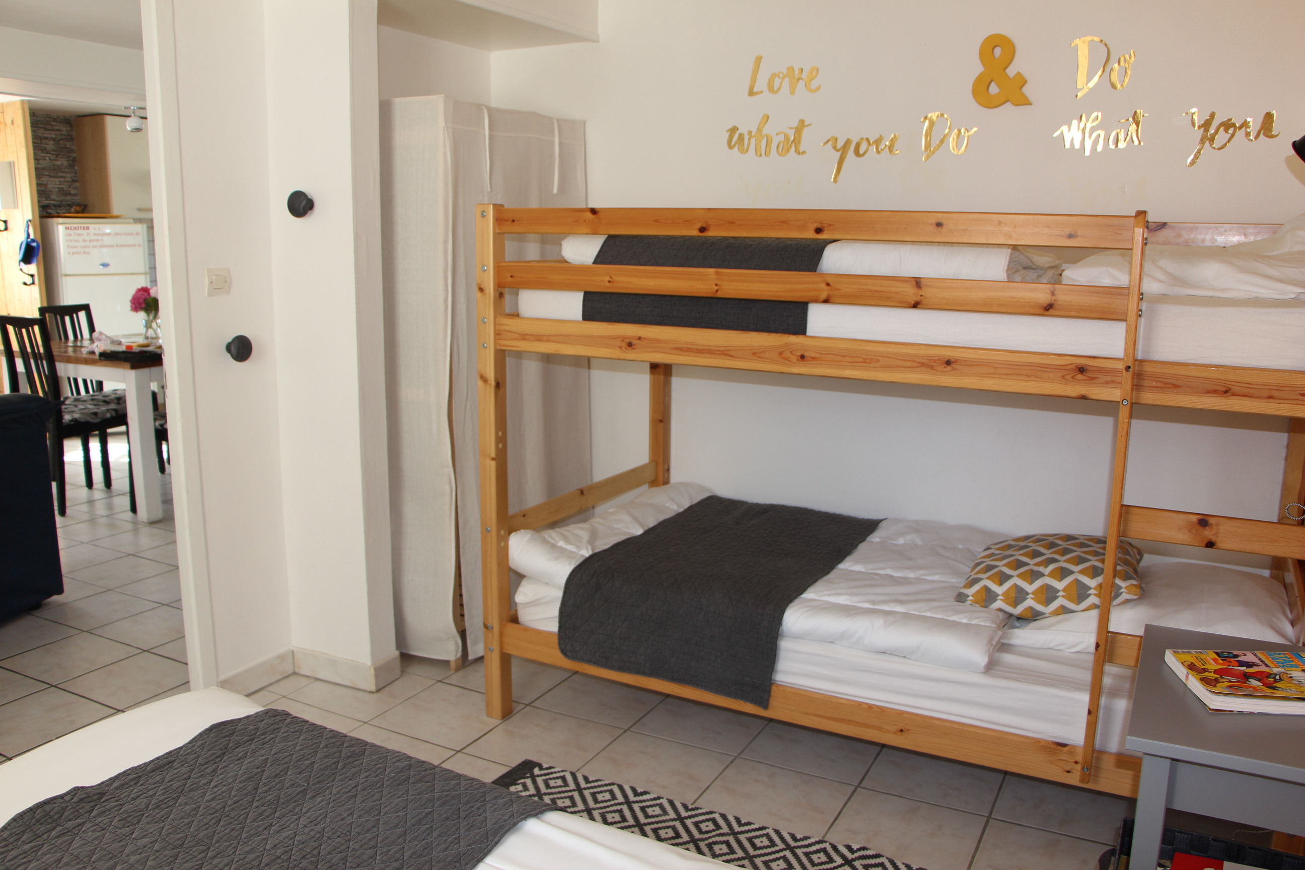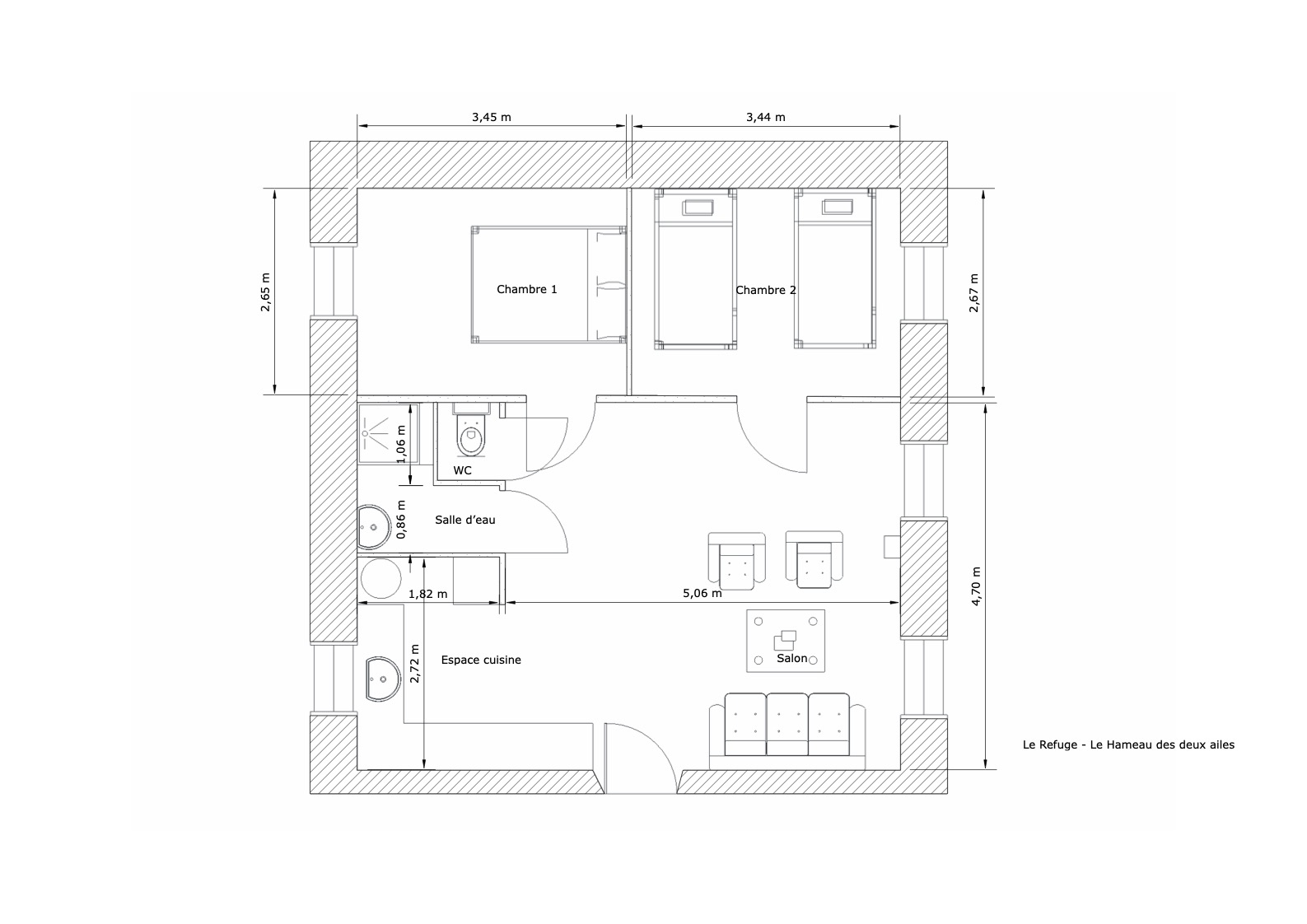 Le gîte « Le refuge » pour 5 personnes se compose d’un vaste séjour et de deux chambres. La première vous offre un lit deux places (140×190 cm) et la seconde se compose de trois lits 1 place (90×190 cm) dont deux superposés. Une grande cuisine ouverte sur le séjour et totalement équipée vous permet d’être indépendants pendant votre séjour. Une salle de douche et des toilettes séparées complètent l’espace.