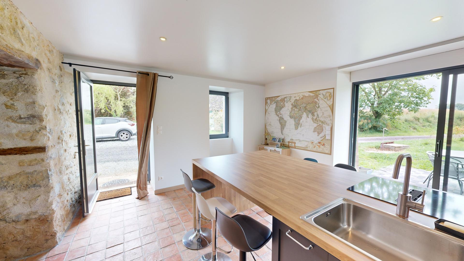 En entrant, un salon spacieux s’ouvre sur une cuisine moderne entièrement équipée, idéale pour des repas conviviaux. La décoration chaleureuse crée une atmosphère apaisante, parfaite pour se détendre après une journée bien remplie.