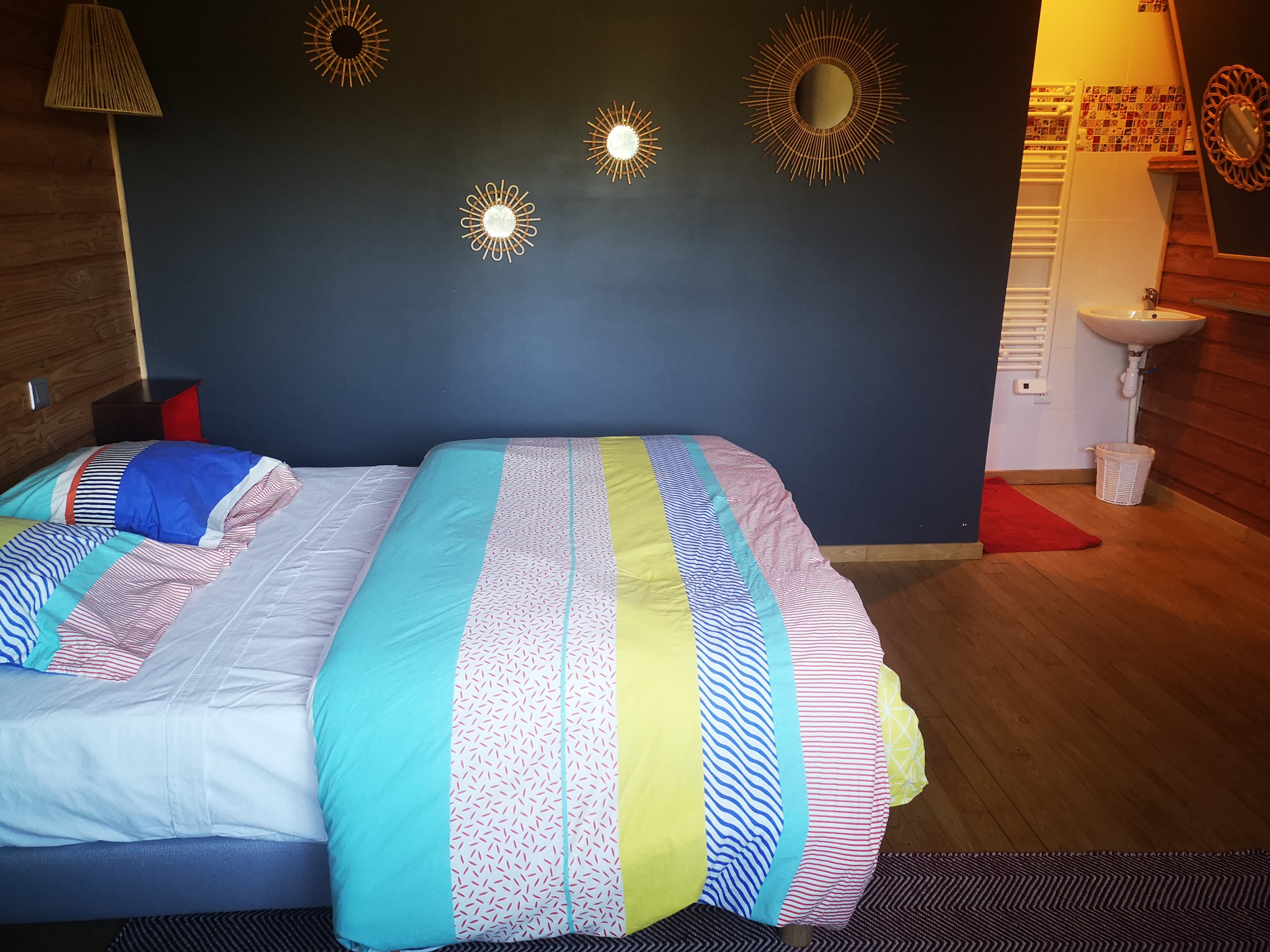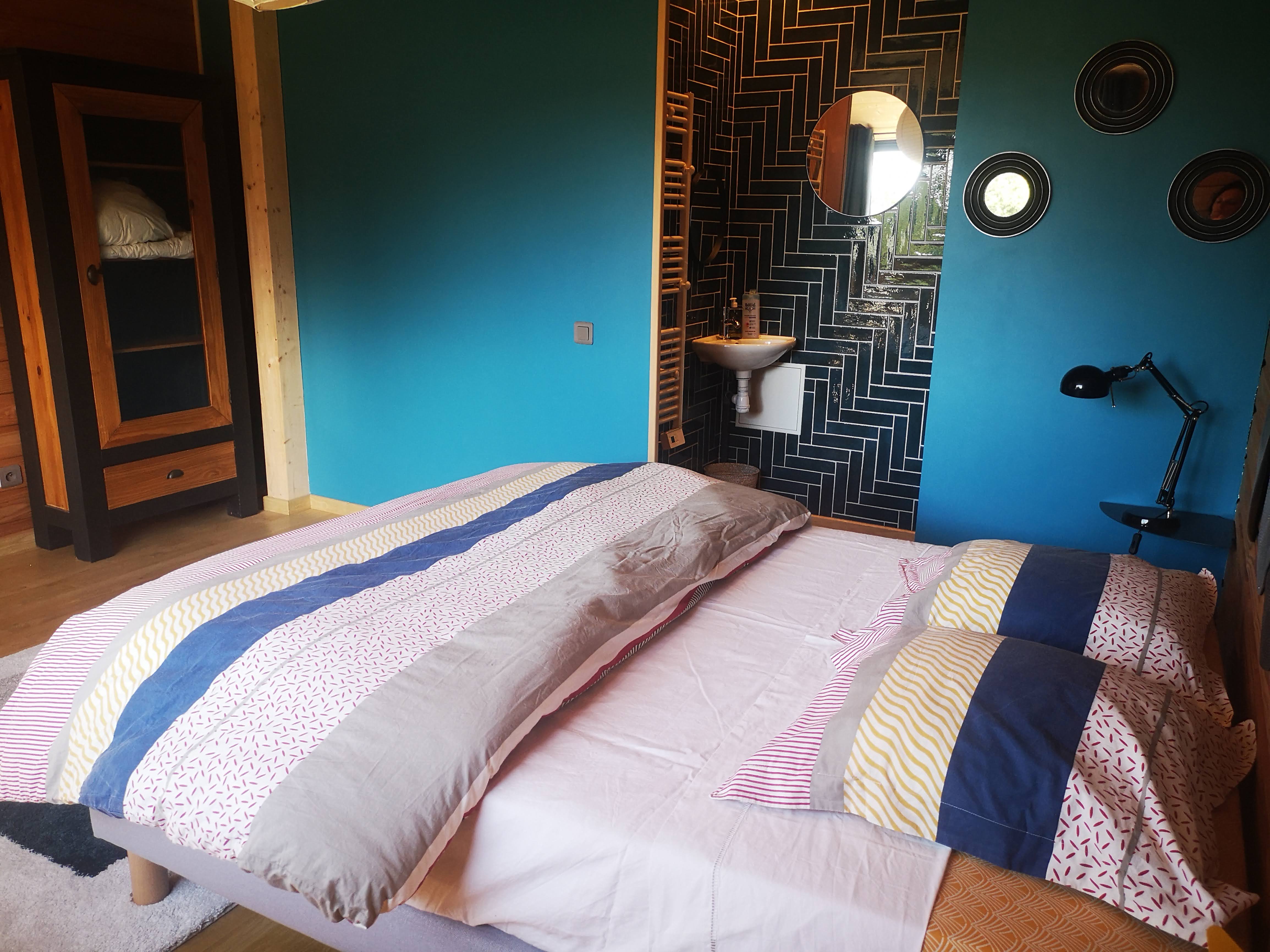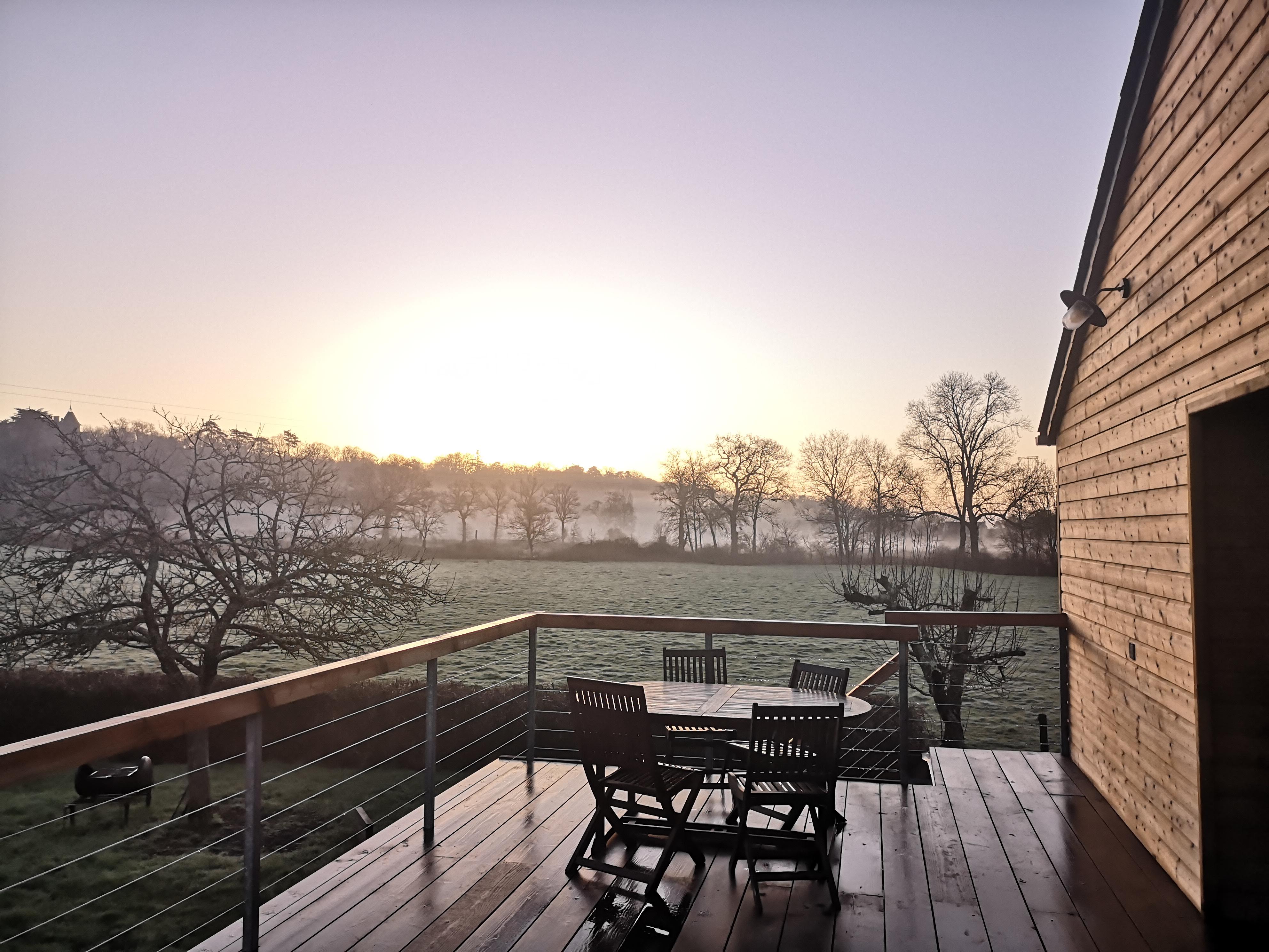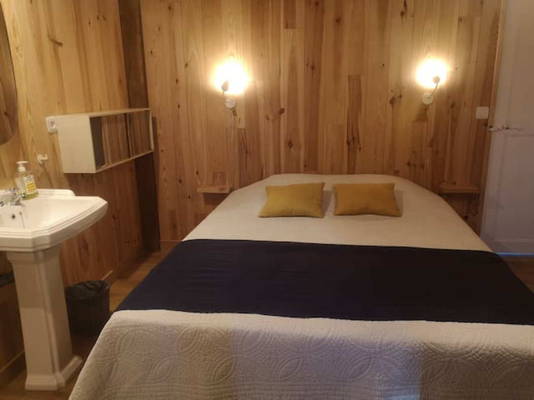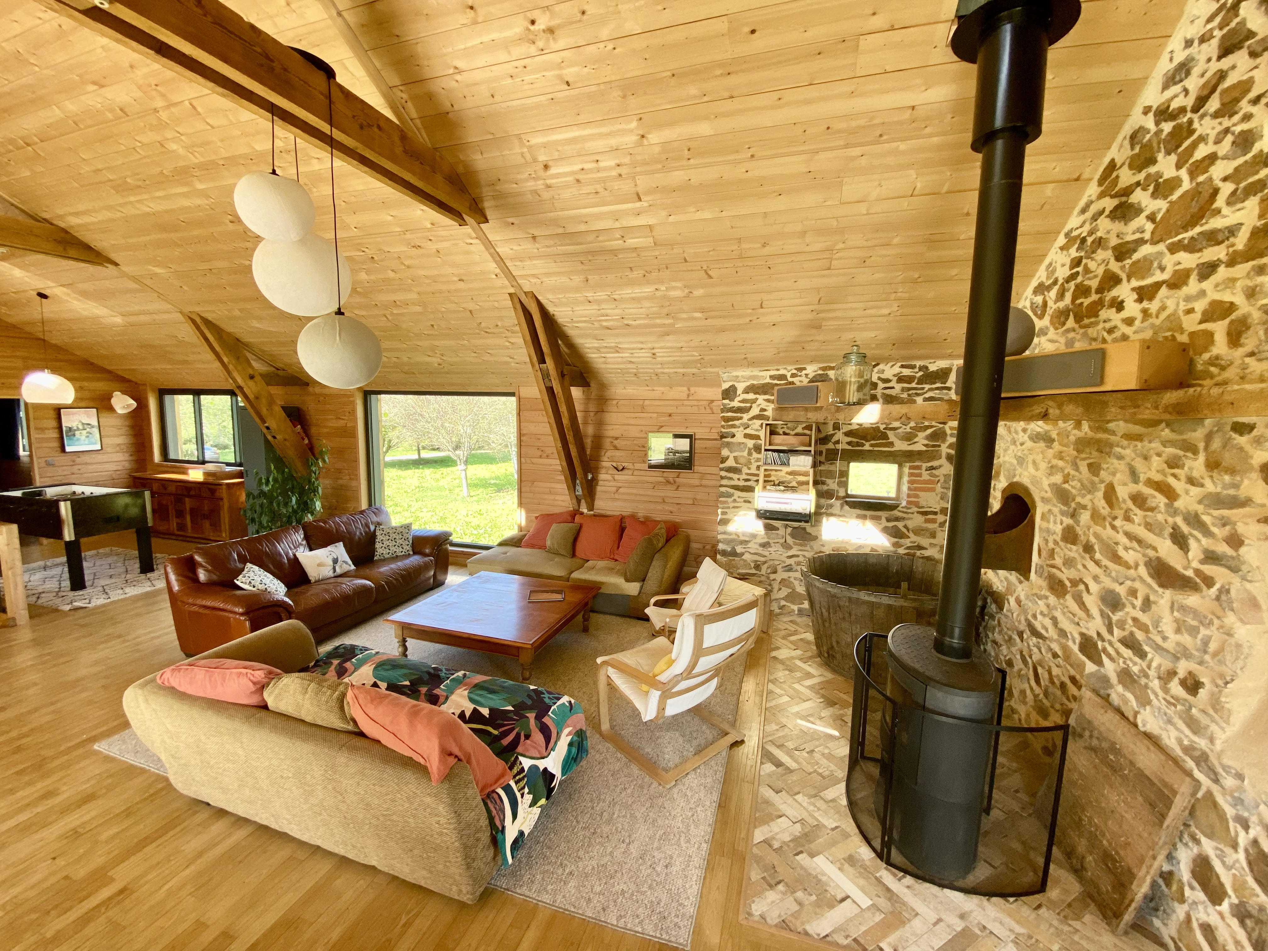 Marion et Aymeric vous accueillent dans un spacieux lodge entièrement rénové, à 15min de Laval. Les pièces de vie au 1er étage et les baies vitrées traversantes offrent une vue splendide sur la campagne aux alentours. 5 chambres, 4 salles d’eau/sdb. Ambiance chaleureuse garantie grâce à l’intérieur bois et au poêle du grand salon !