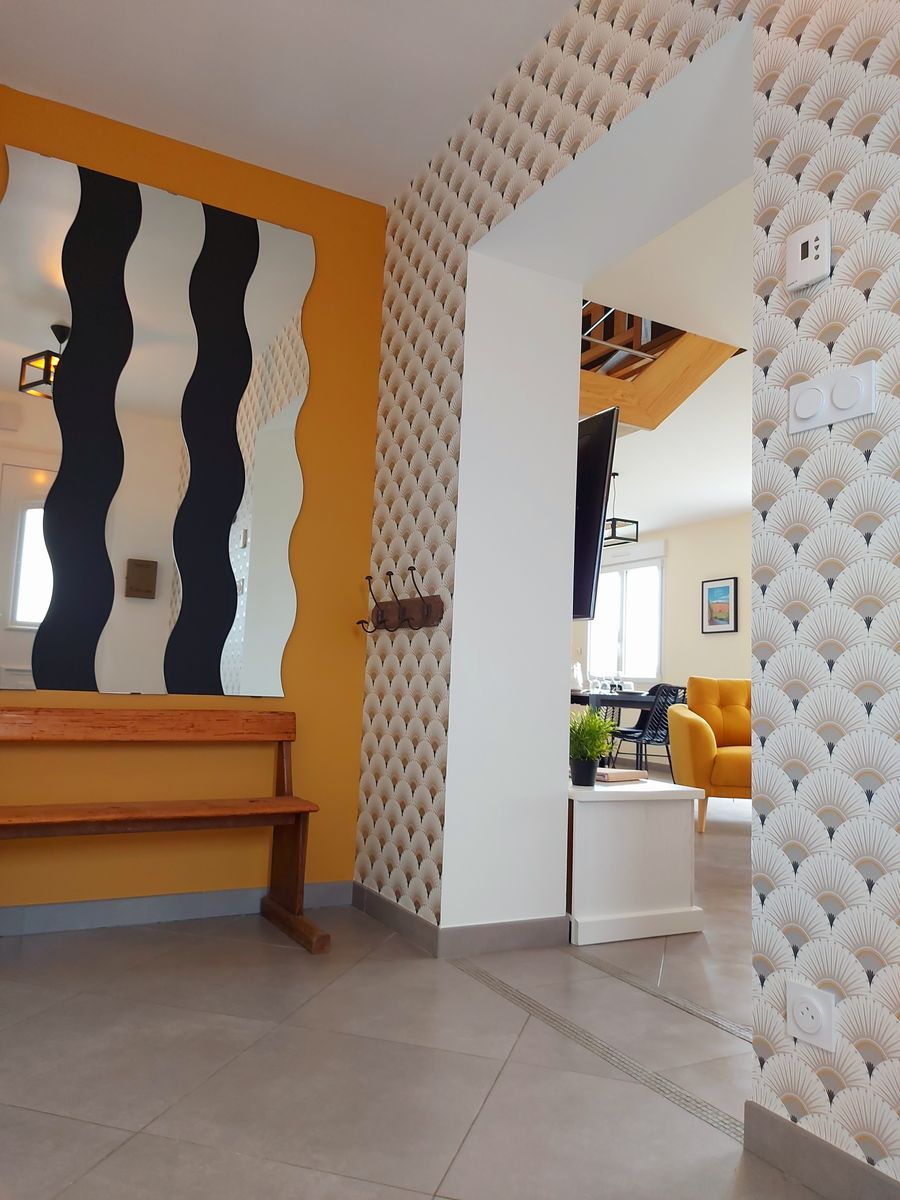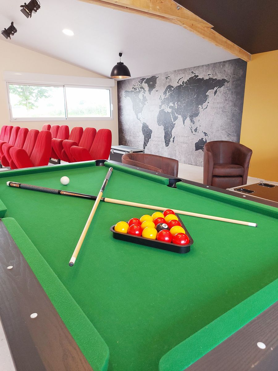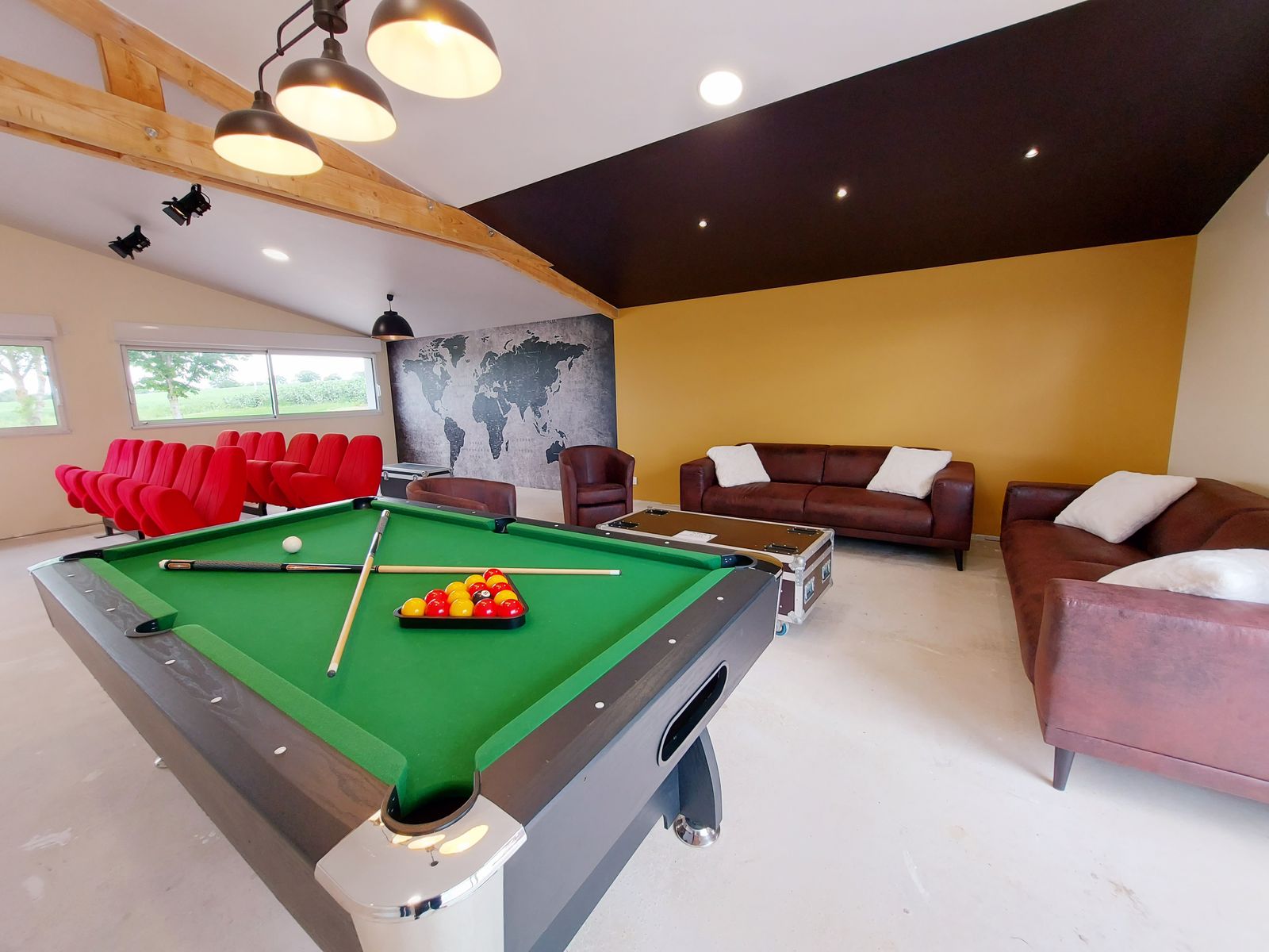 Salle de jeux 64m² : espace salon, bar, billard, babyfoot, grande TV 2.15m, sièges de cinéma.