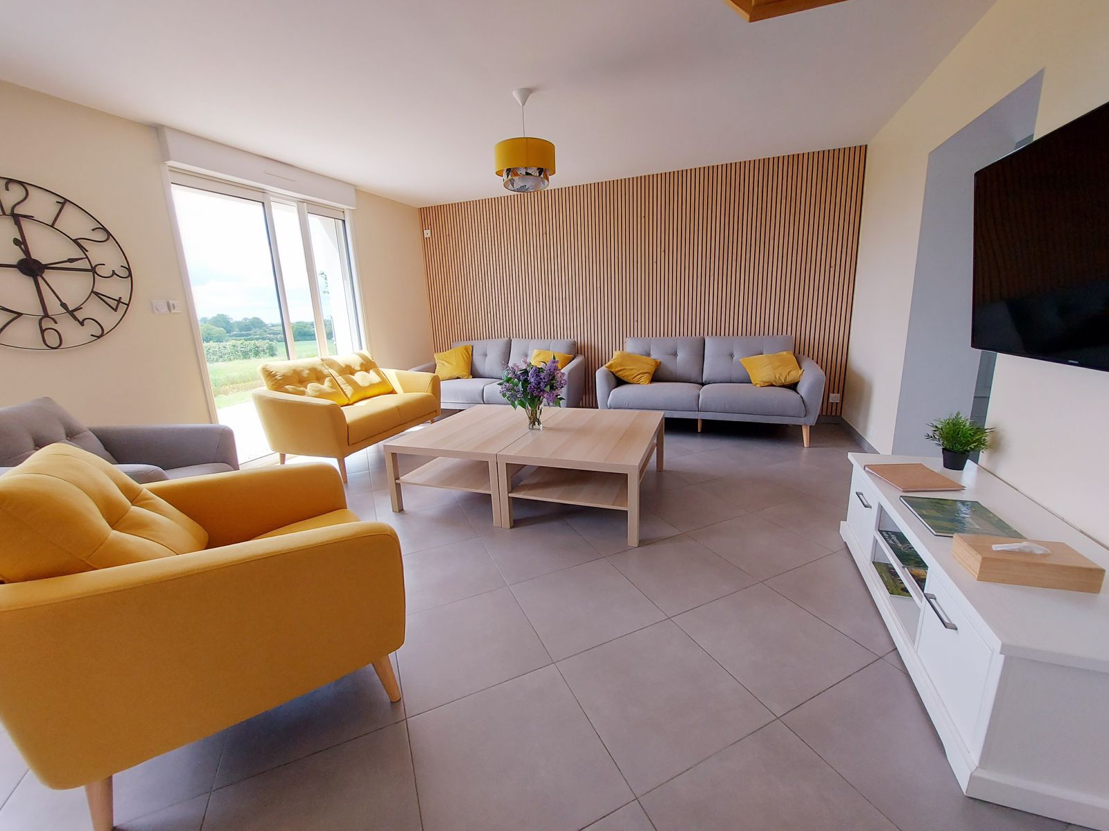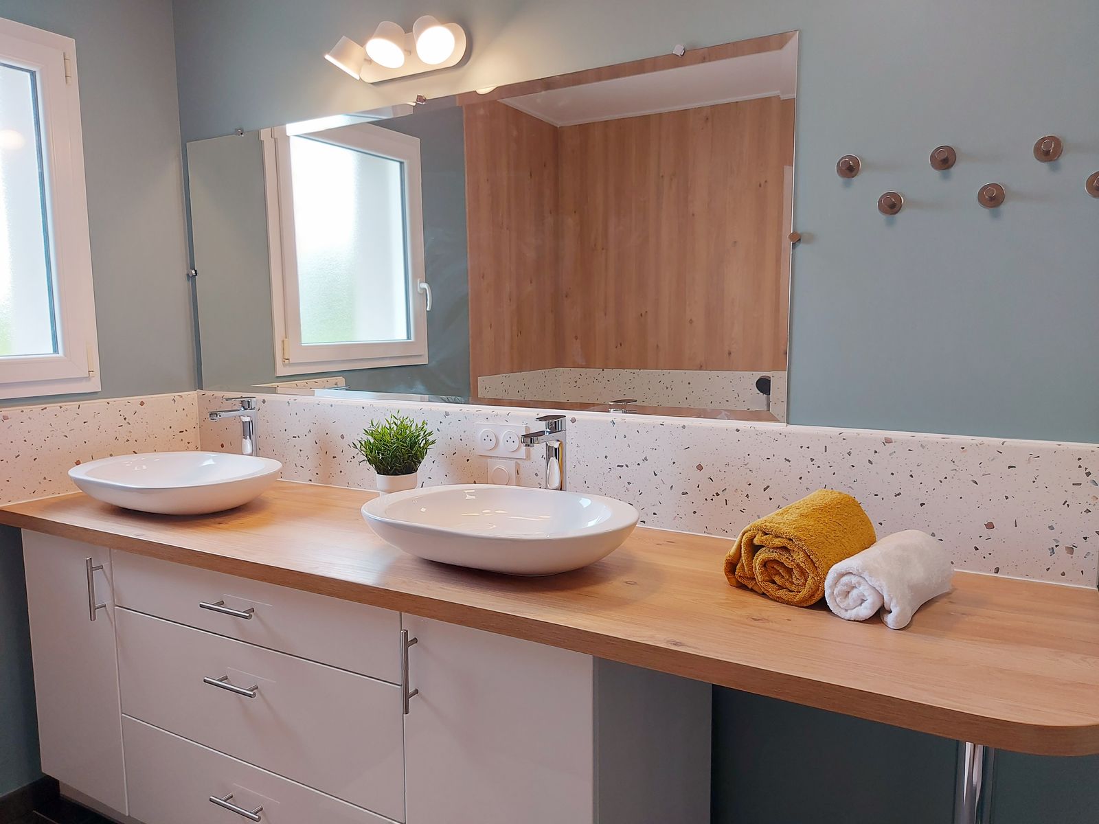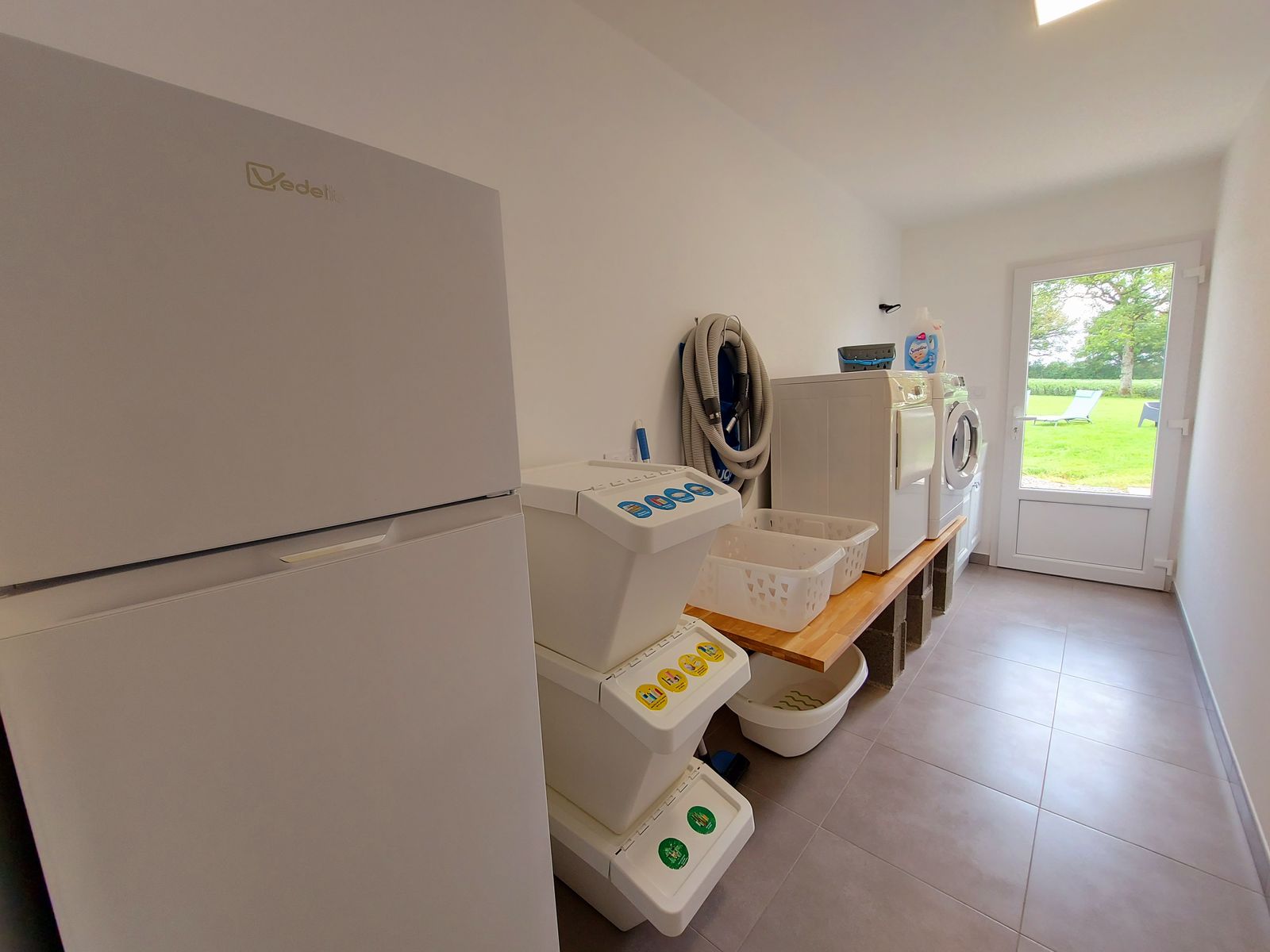 – En rez-de-chaussée : séjour de 46m² avec espace salon et espace salle à manger, TV – cuisine 20m² équipée avec four, feux gaz, lave-vaisselle, bouilloire, cafetière filtre, cafetière dosette Senseo, grille-pain, réfrigérateur, 2 appareils à raclette – buanderie avec 2e réfrigérateur et compartiment congélateur 2 étagères, lave-linge, sèche-linge – (1) Chambre Nature 13.2m² avec 1 lit 160*200 et un lit bébé – (2) Chambre Bleue 11.2m² avec 1 lit 160*200 – (3) Chambre Verte 11.2m² avec 2 lits 90*190 – Salle de bain et douche, deux vasques, sèche cheveux – WC indépendants.