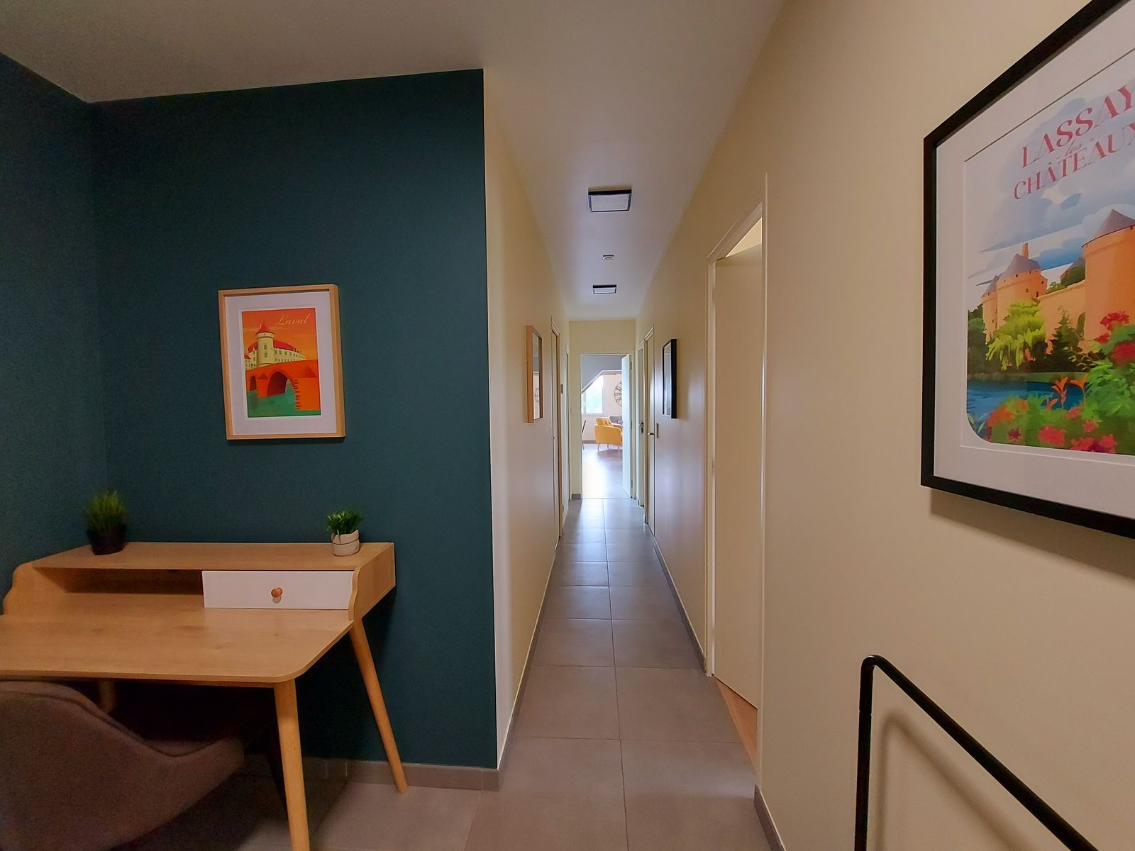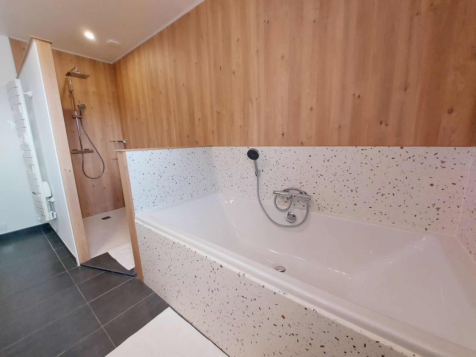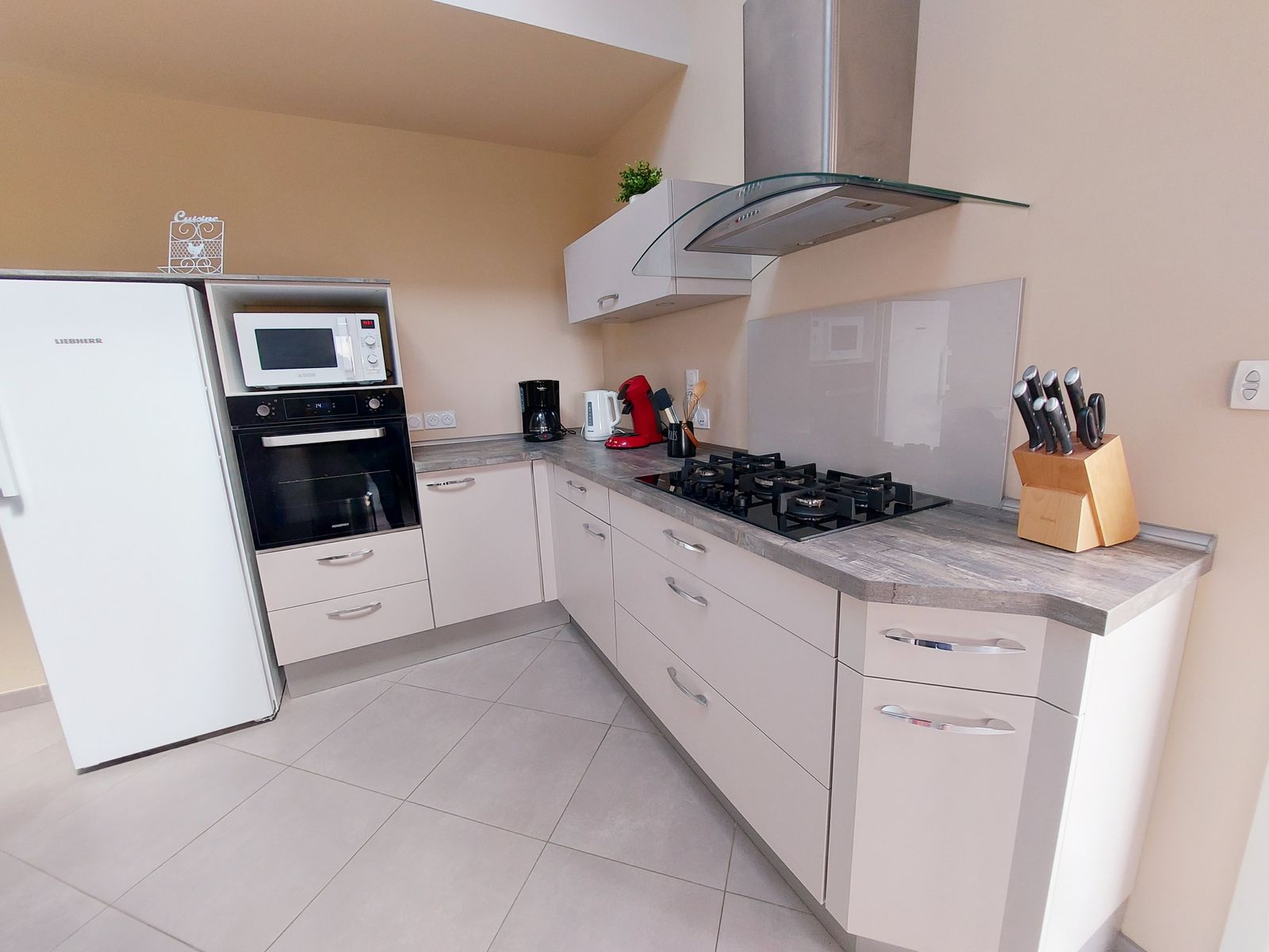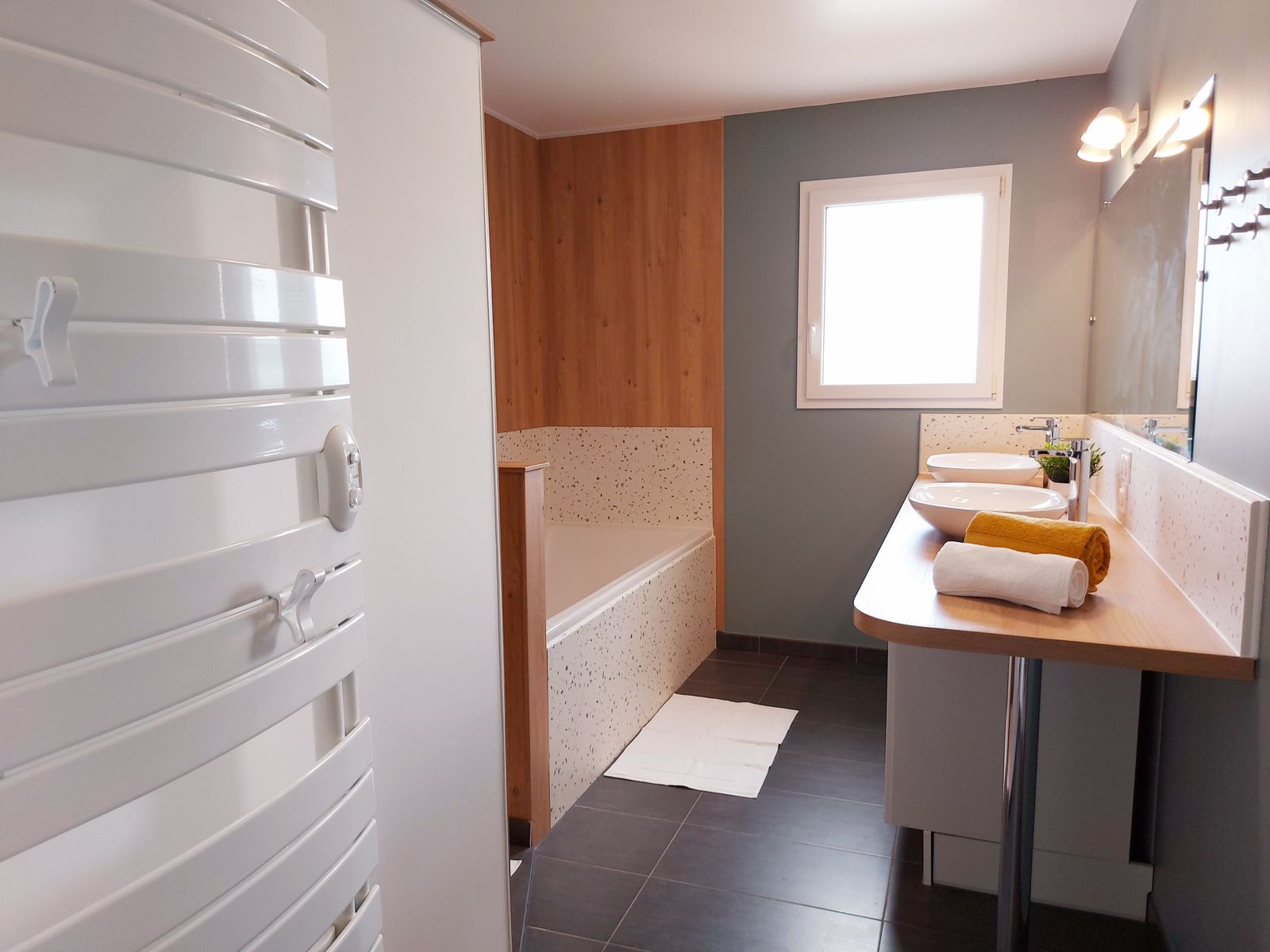 – En rez-de-chaussée : séjour de 46m² avec espace salon et espace salle à manger, TV – cuisine 20m² équipée avec four, feux gaz, lave-vaisselle, bouilloire, cafetière filtre, cafetière dosette Senseo, grille-pain, réfrigérateur, 2 appareils à raclette – buanderie avec 2e réfrigérateur et compartiment congélateur 2 étagères, lave-linge, sèche-linge – (1) Chambre Nature 13.2m² avec 1 lit 160*200 et un lit bébé – (2) Chambre Bleue 11.2m² avec 1 lit 160*200 – (3) Chambre Verte 11.2m² avec 2 lits 90*190 – Salle de bain et douche, deux vasques, sèche cheveux – WC indépendants.