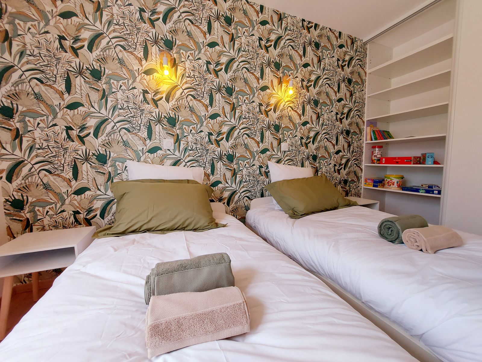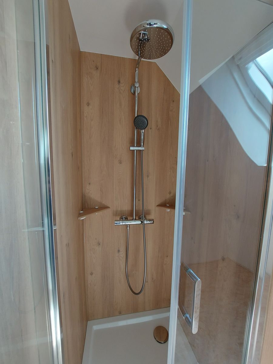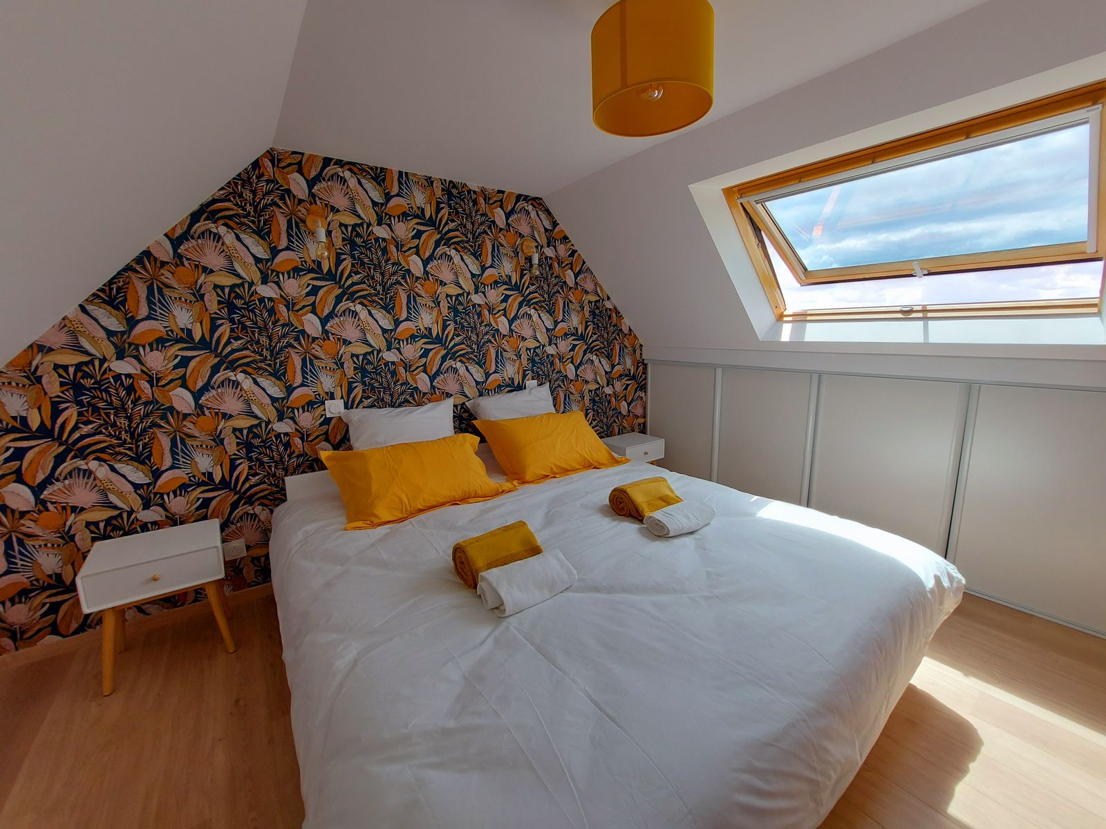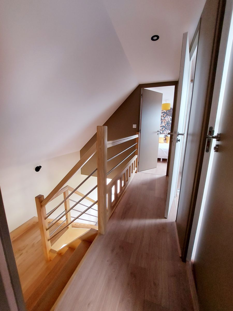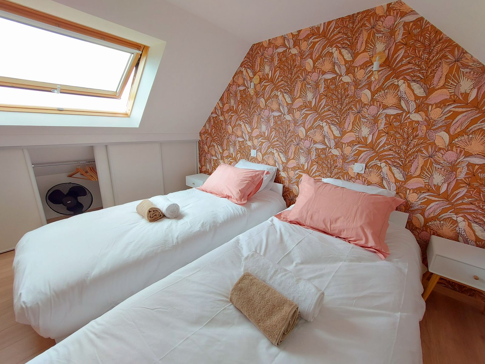 – Au 1er étage, sous pente, mesures avec 1.8m sous plafond : (4) Chambre Rose 8m² avec 2 lits jumeaux 90*200, placard – (5) Chambre Moutarde 8m² avec 2 lits jumeaux 90*200 et placard – Salle d’eau avec douche et lavabo – wc indépendants – 2 lits pliants 90*190 à mettre dans une chambre ou salle de jeux.