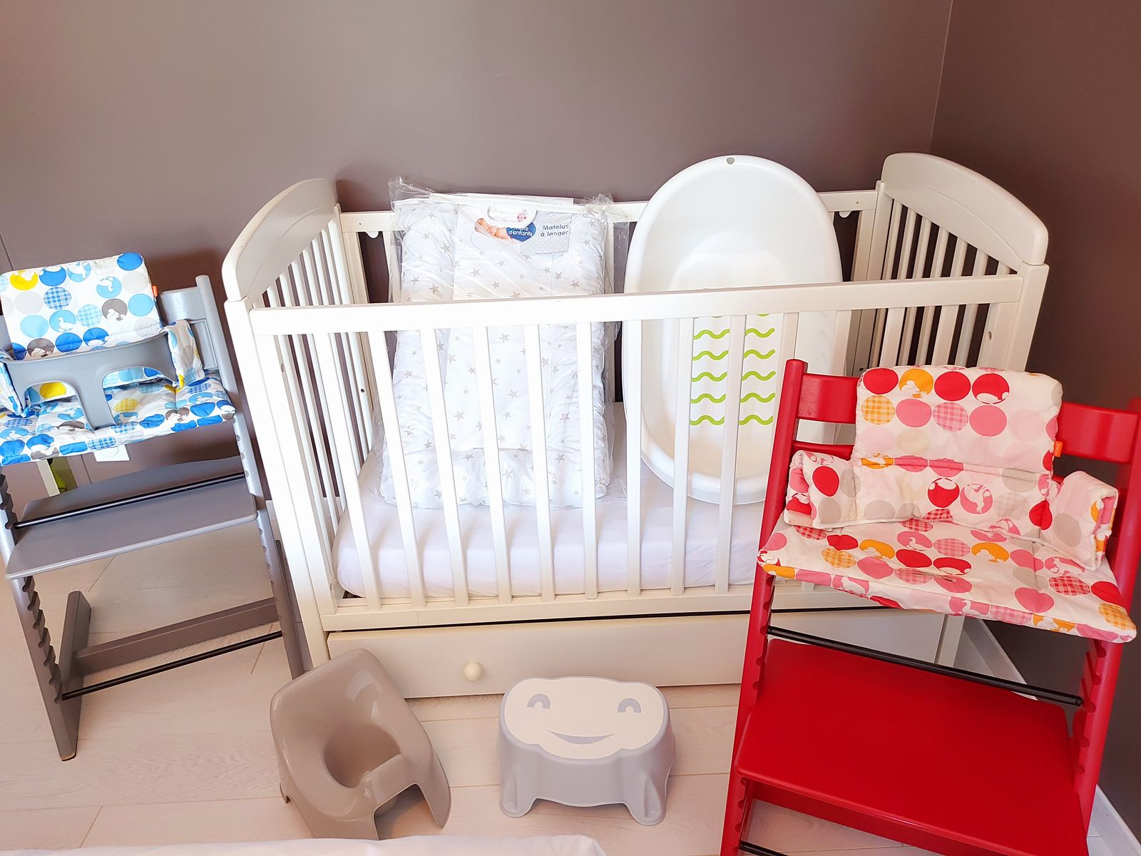 – Équipements bébé : 1 chaise bébé – 1 chaise enfant – 1 baignoire – 1 siège douche – 1 marche – 1 matelas à langer – 1 lit parapluie – 1 lit barreaux