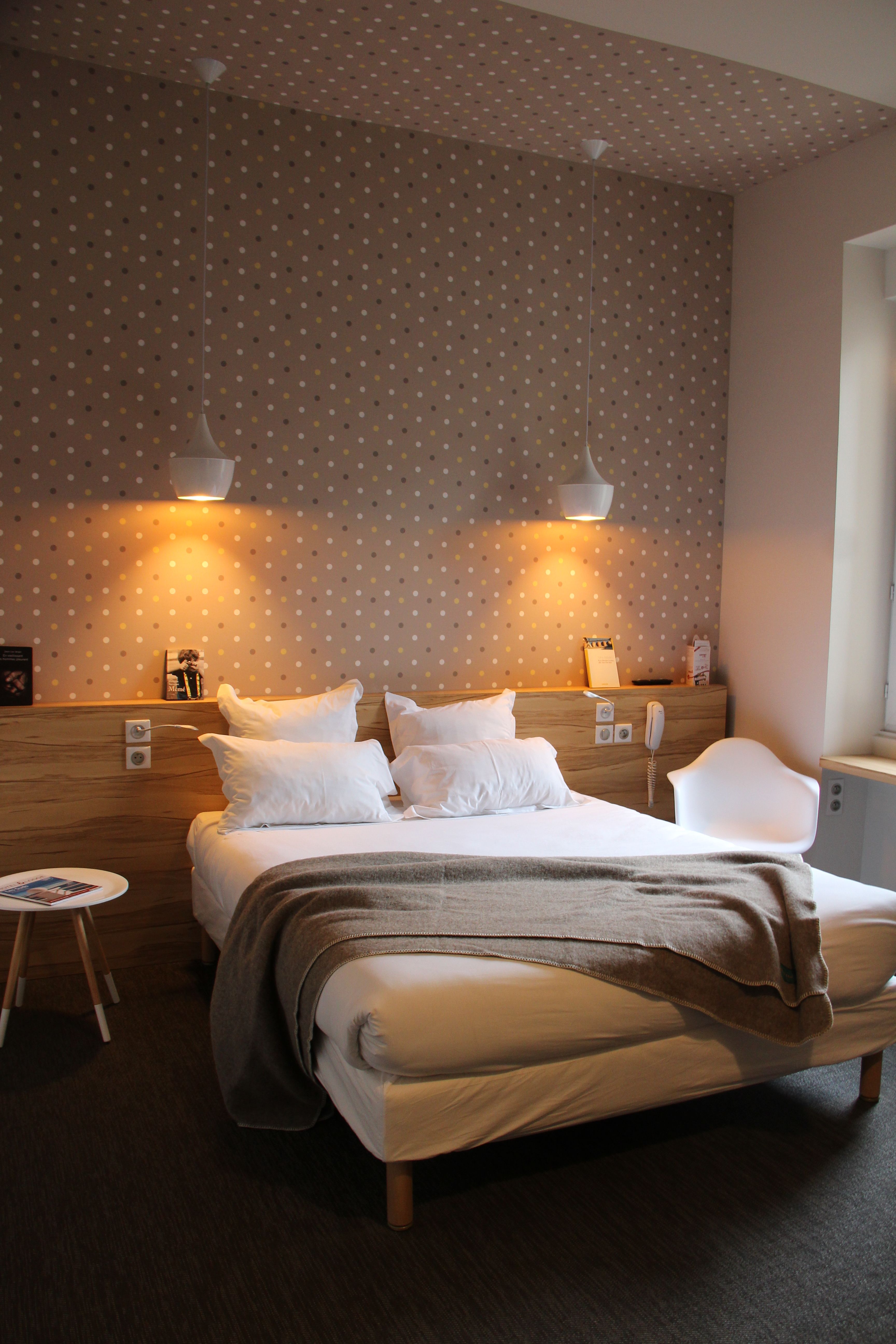 Les murs des chambres sont peints en blanc craie. Un pan de mur est recouvert d’une tapisserie à motifs géométriques ou bien peint dans une des 4 couleurs de l’hôtel. Le mobilier est en bois clair. La tête de lit vous servira à poser vos effets personnels, et comporte des tas de bouquins qui sont à votre disposition le temps de votre séjour à l’hôtel.