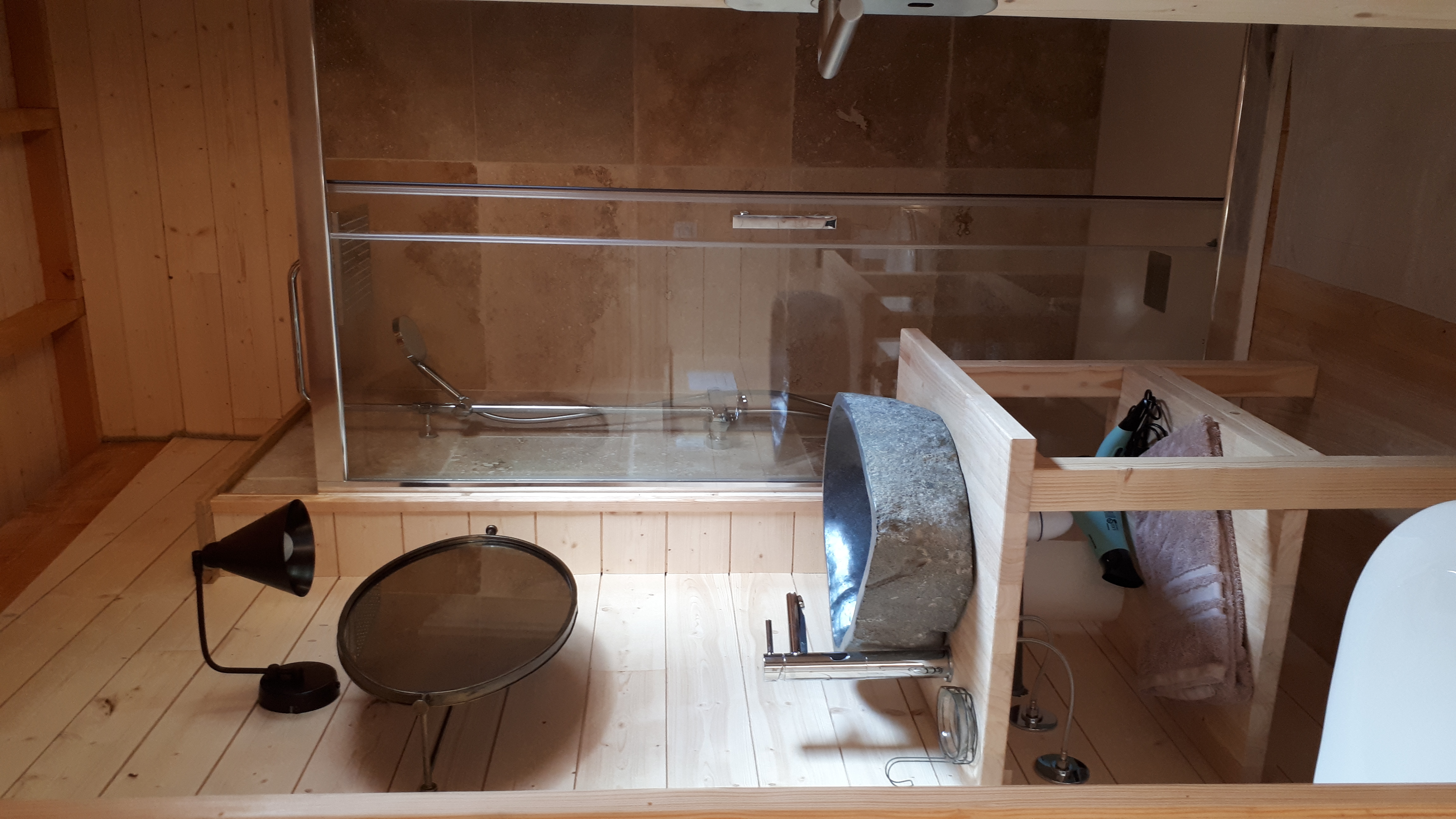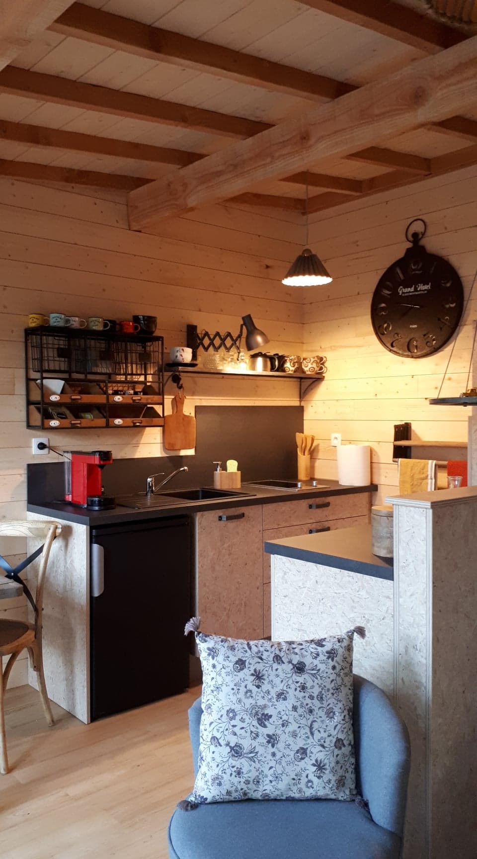 Située au fond de notre jardin fleuri, accessible facilement par un escalier effleurant les érables, la Cabane du Bon Chemin, chauffée et isolée, offre un espace de 26m2 pour votre confort, avec TV et Wi-Fi gratuit, comprenant un espace nuit douillet : 1 lit 2 places (140×190) et 1 lit escamotable (90×190). Un espace cuisine équipé pour les longs séjours, ainsi qu’une salle de bain avec une grande douche à l’italienne, lavabo et WC.
