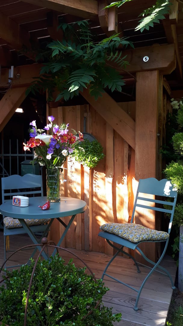 Une baie-vitrée s’ouvre sur une terrasse privative de 7m² sur pilotis, couverte d’une verrière qui surplombe le jardin, le bassin. Elle offre une vue sur notre maison en pierre. Un escalier vous mène vers une seconde terrasse ombragée au rez-de-jardin, idéale pour se détendre et profiter de la nature.