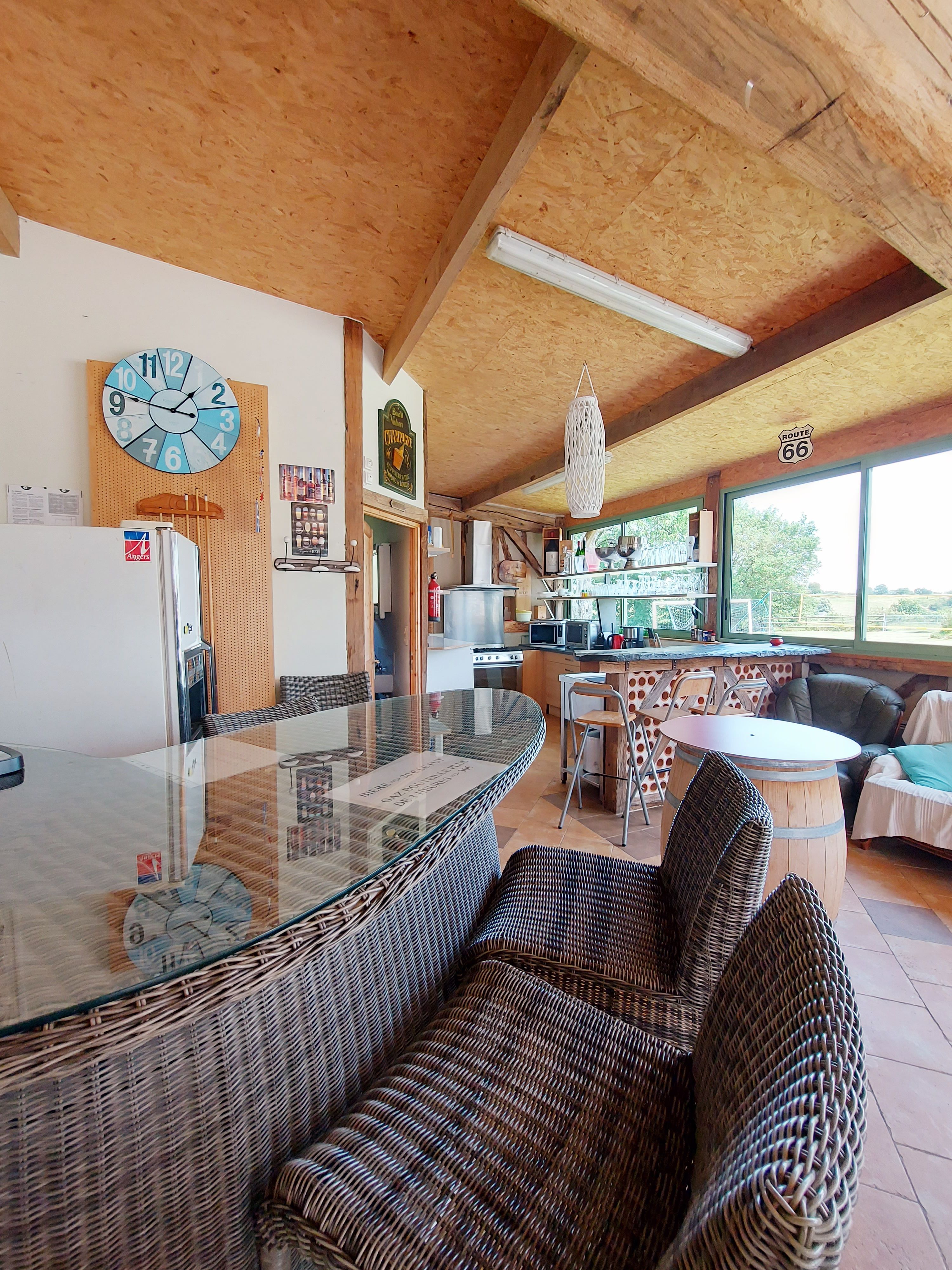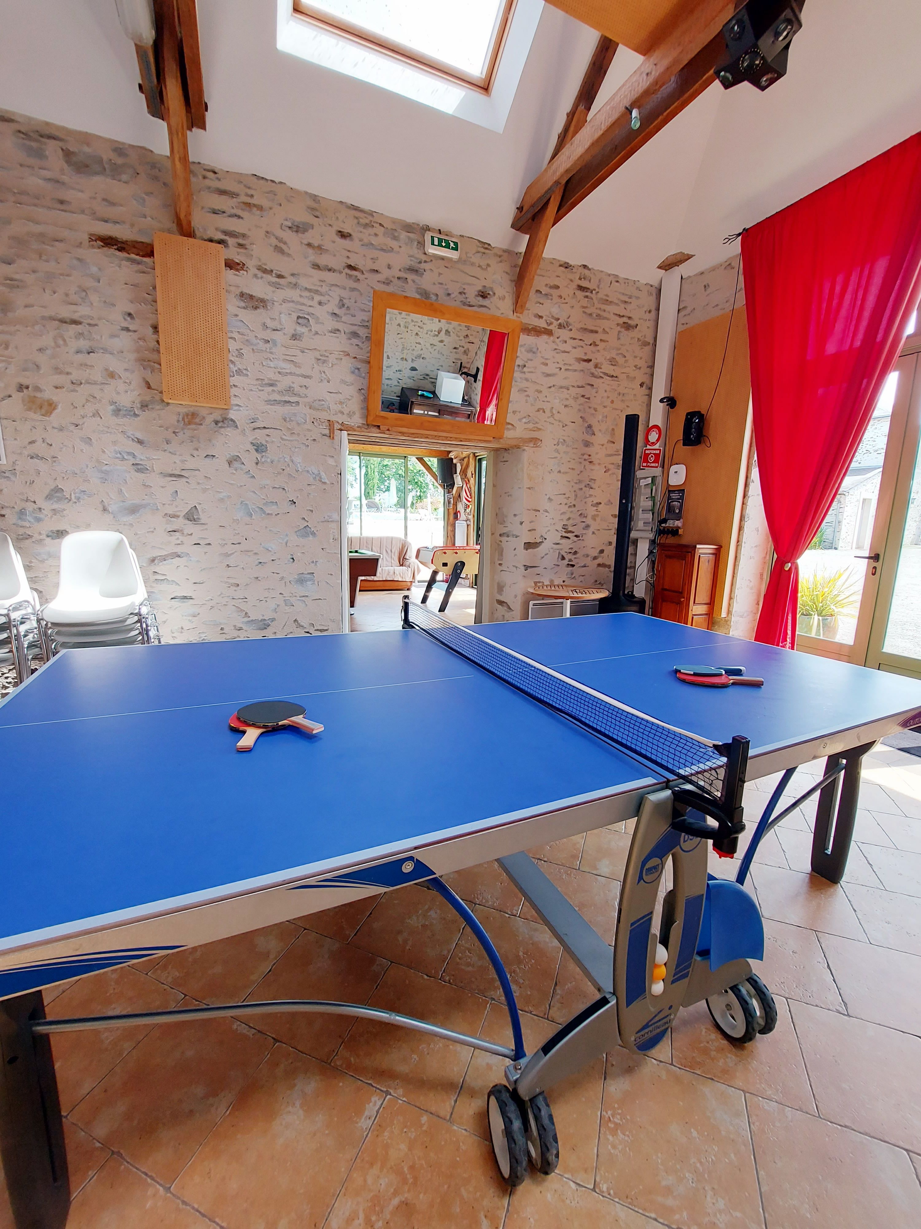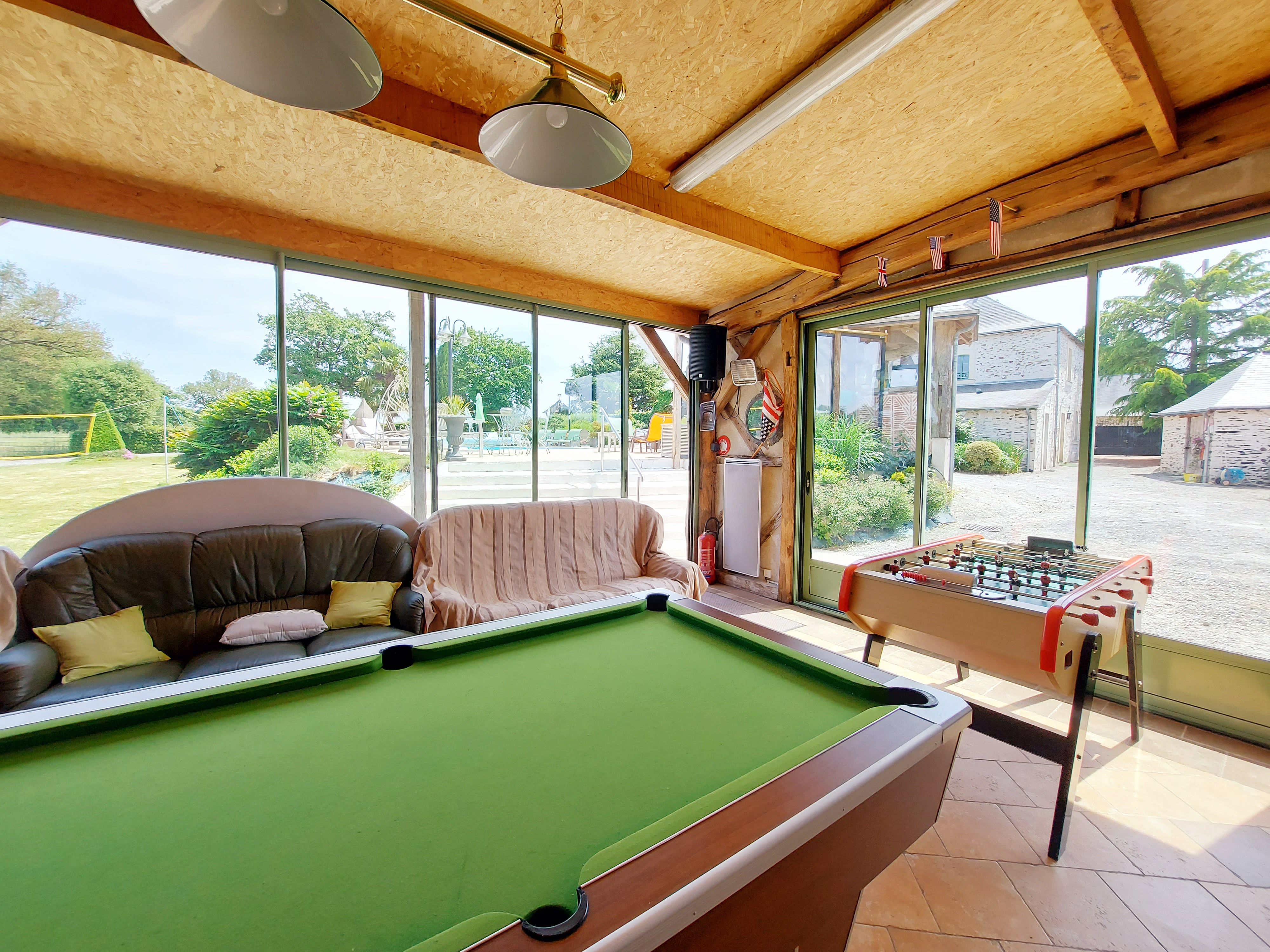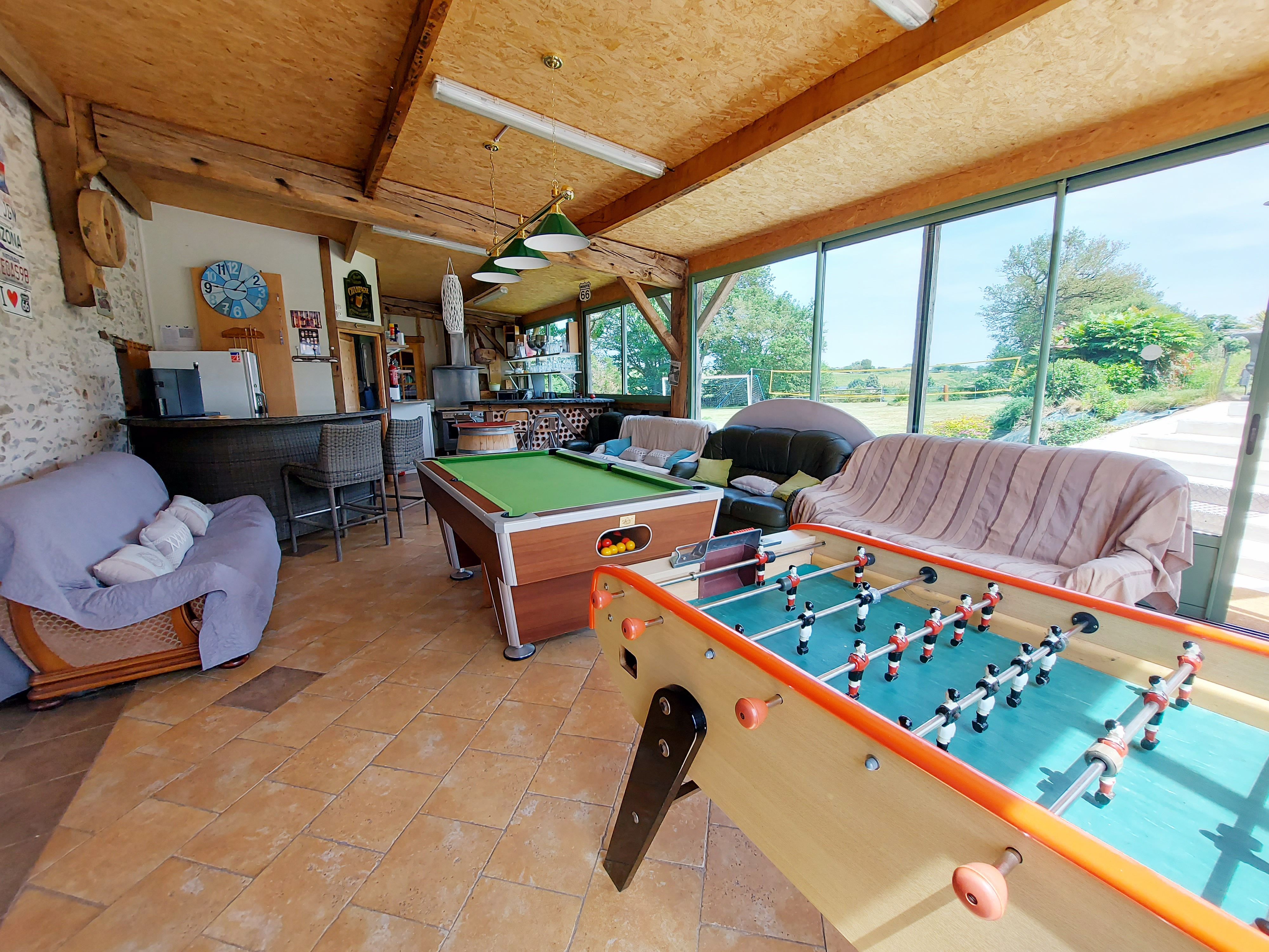 A proximité de la piscine, en contre-bas, 2 vastes salles de près de 60m² chacune. Bar, billard, babyfoot et table de ping-pong. Possibilité d’aménager la salle en salle de repas grâce à la cuisine qui complète le bar.