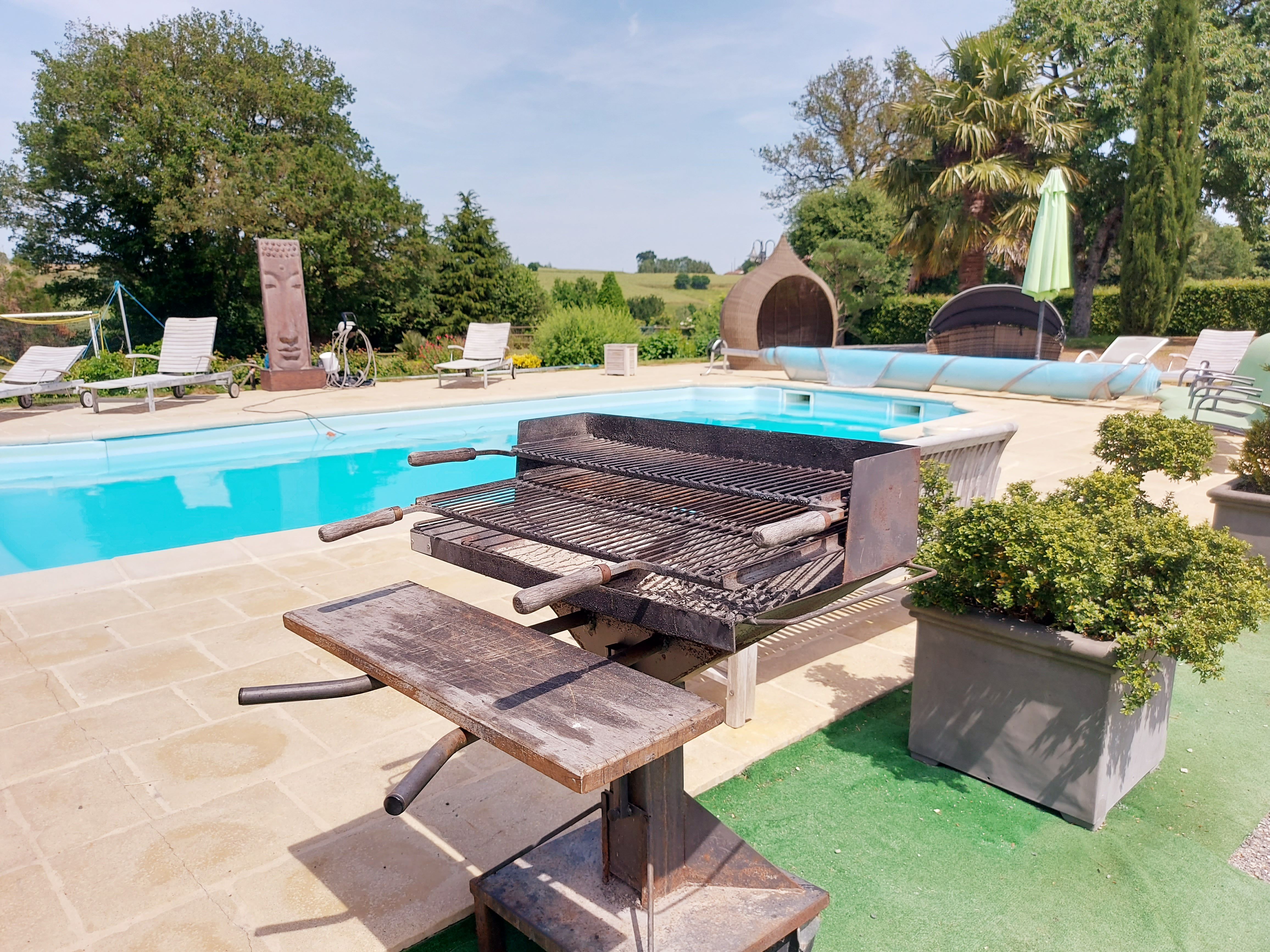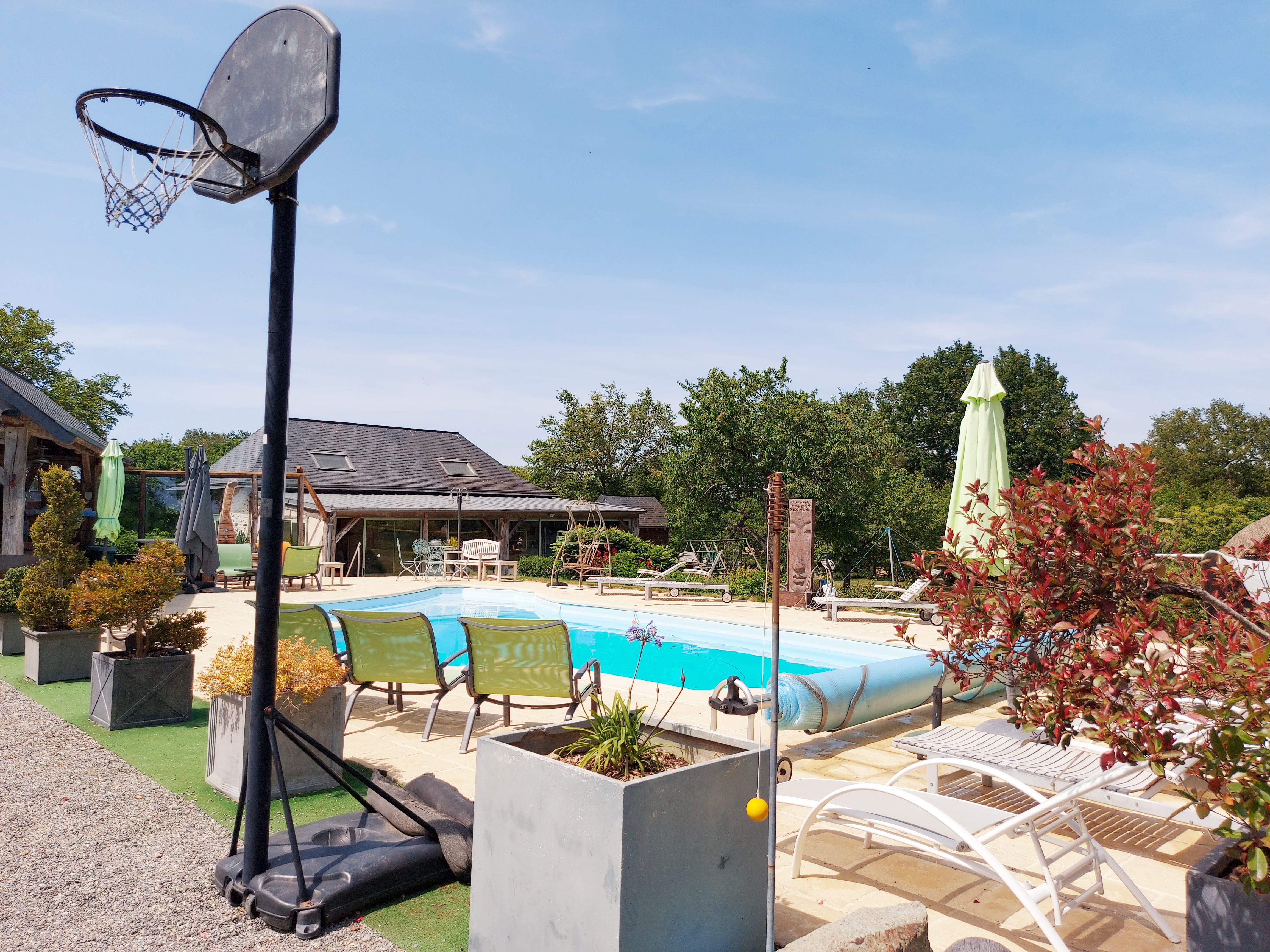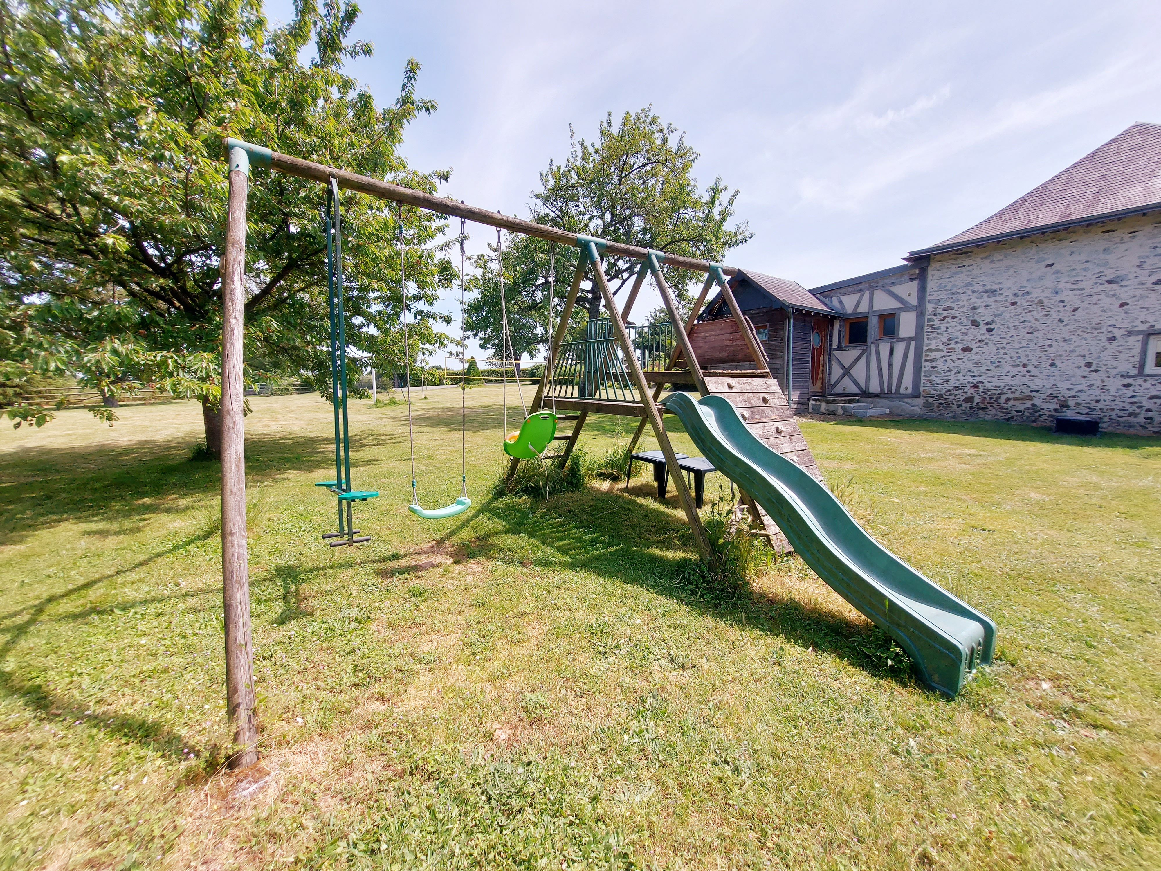 En extérieur, de grand arbres pour l’ombre. La pelouse accueille un but de foot, un filet de volley et un portique avec toboggan et balançoire pour enfants. A 200 mètres, en sortant de l’espace clos, accès à l’étang de pêche privé, 800m², pour une pêche familiale (carpes et autres espèces).