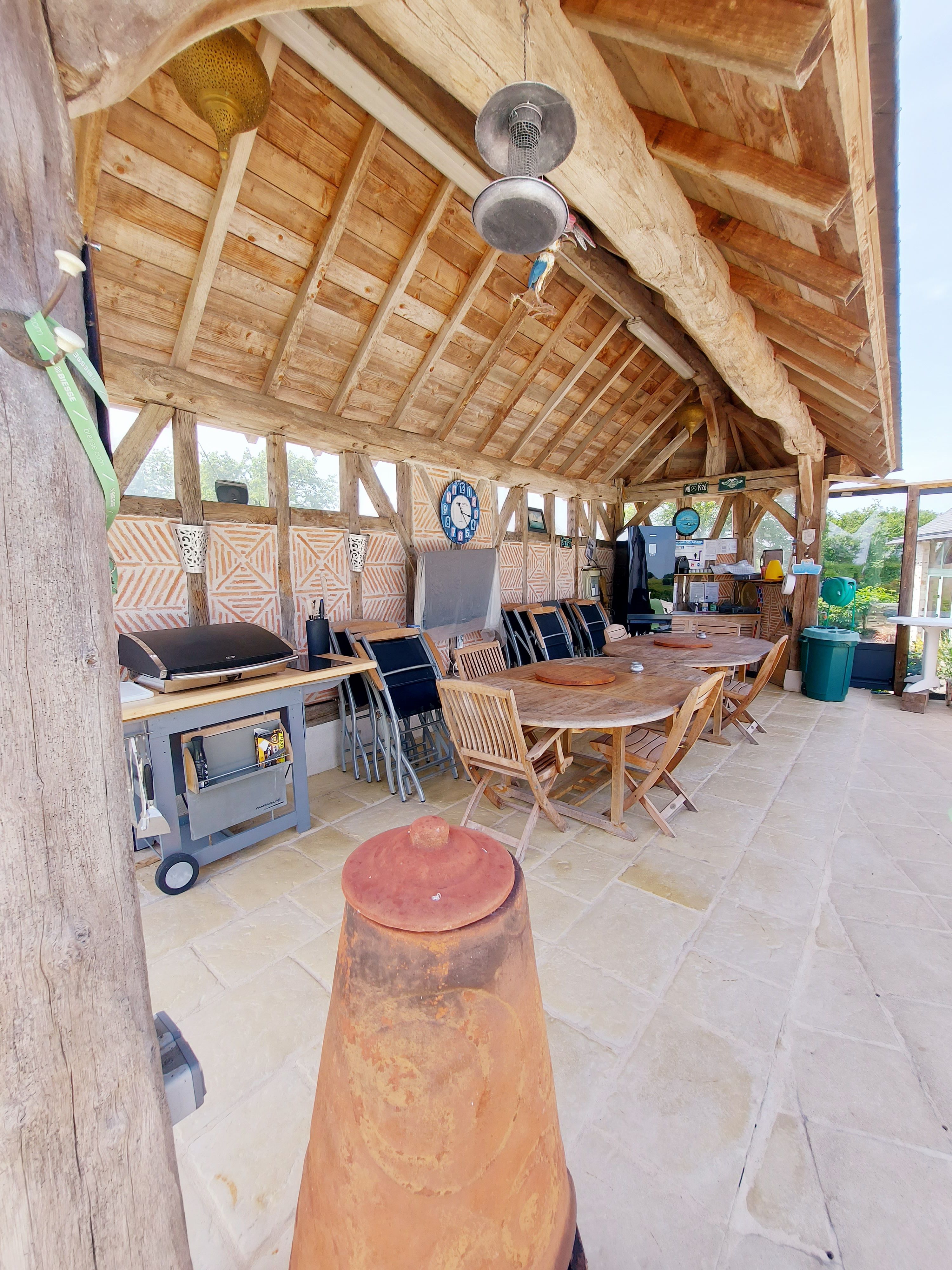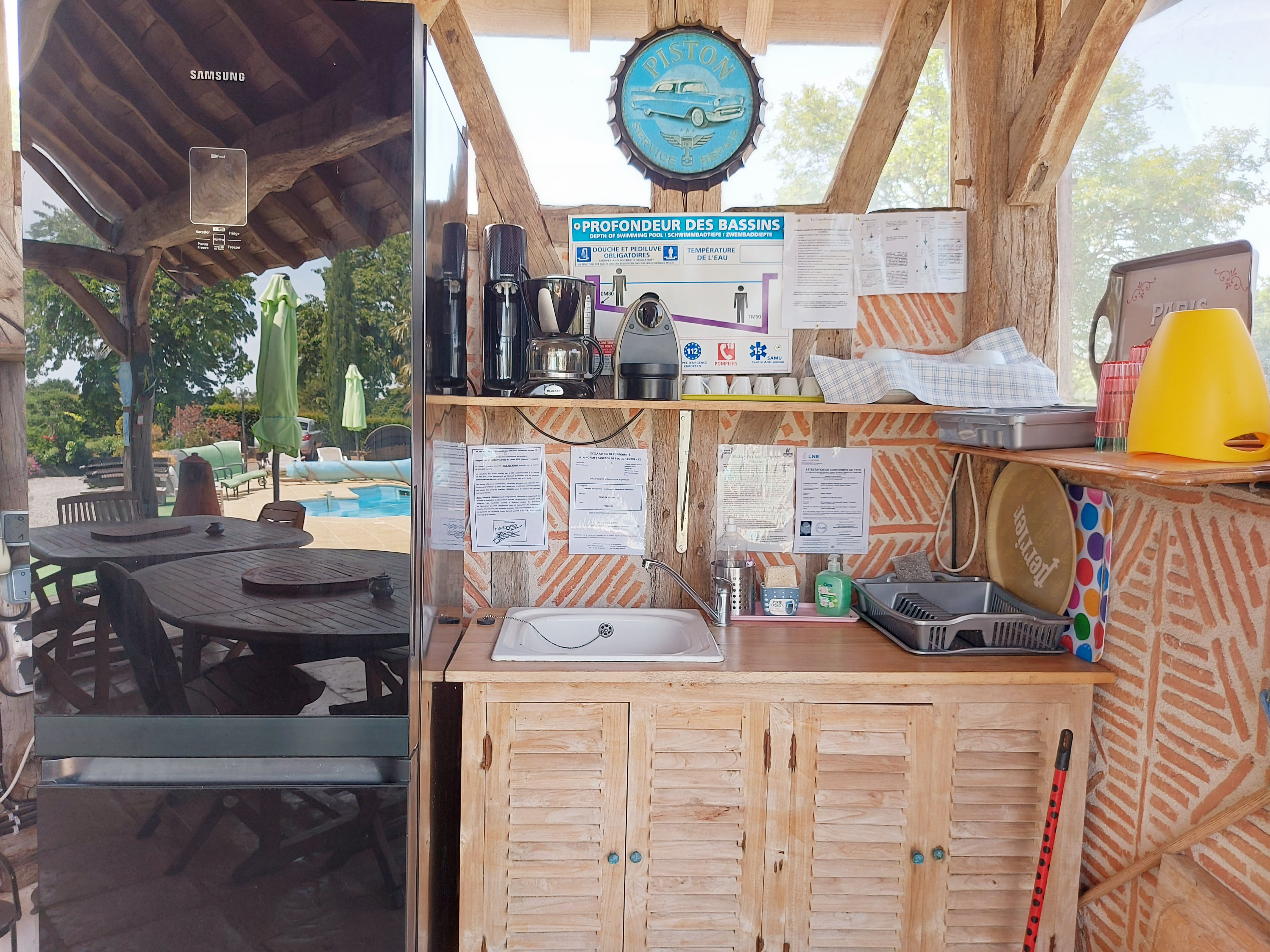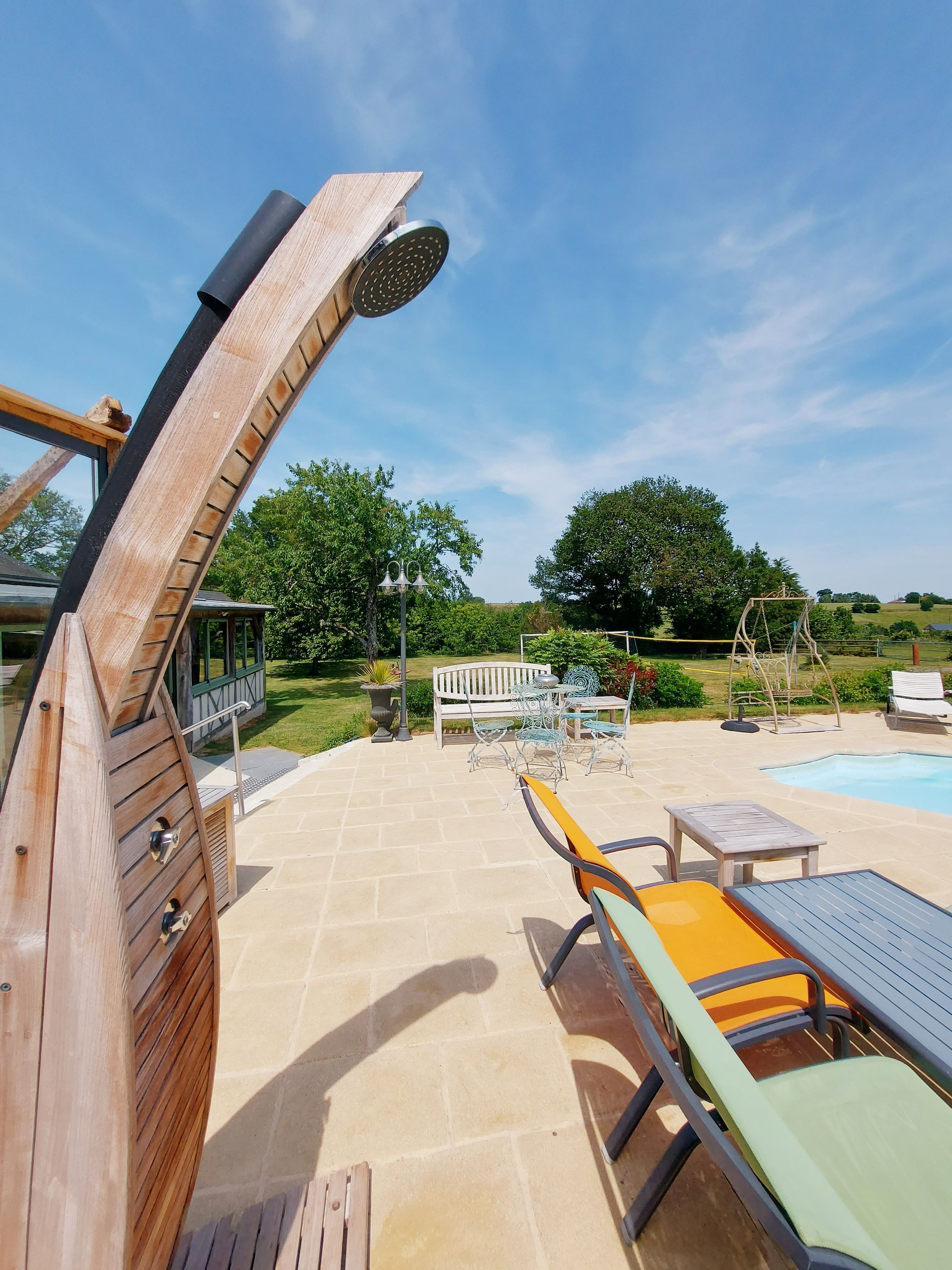 En extérieur, de grand arbres pour l’ombre. La pelouse accueille un but de foot, un filet de volley et un portique avec toboggan et balançoire pour enfants. A 200 mètres, en sortant de l’espace clos, accès à l’étang de pêche privé, 800m², pour une pêche familiale (carpes et autres espèces).