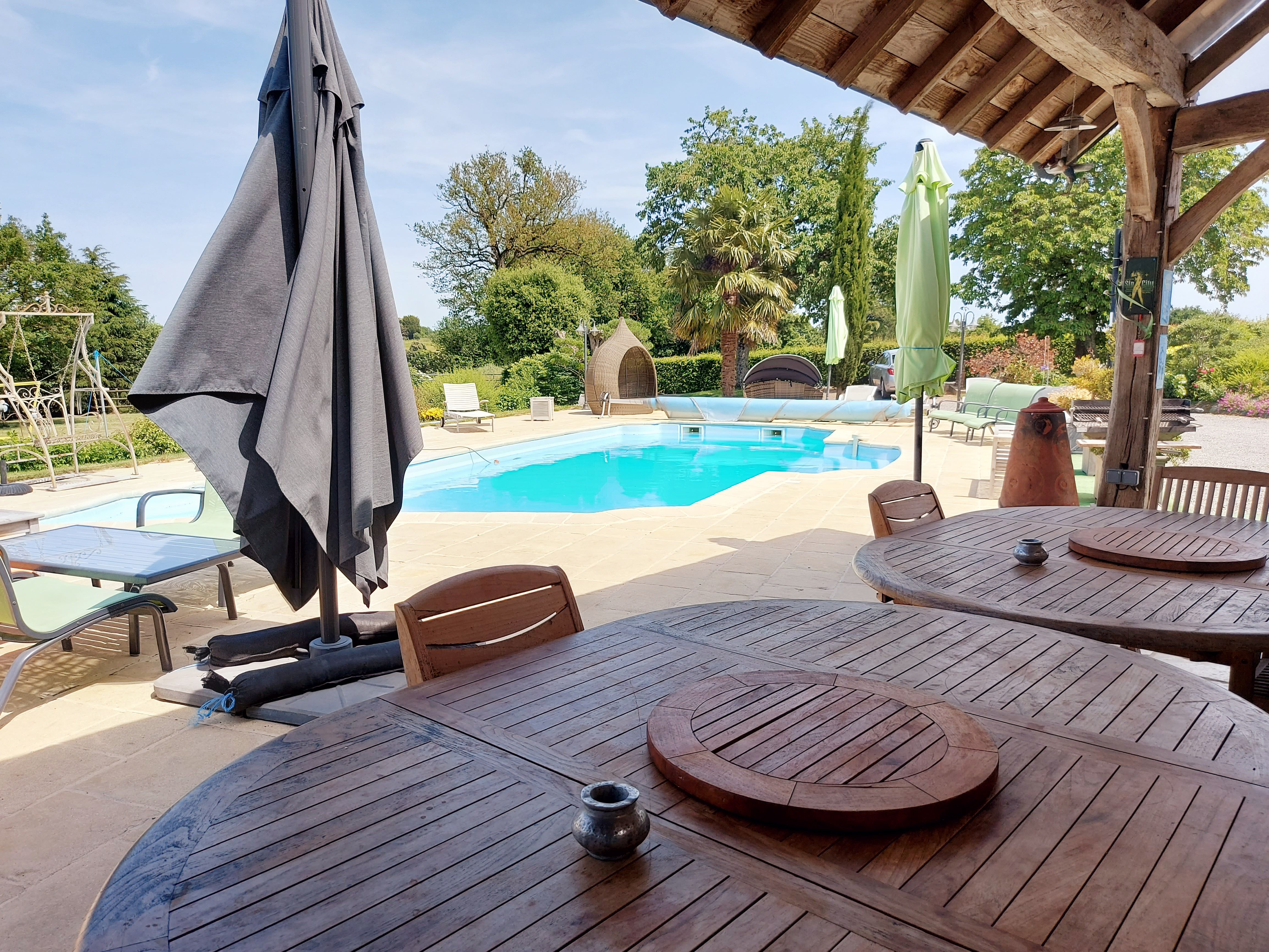 La terrasse est aménagée pour se reposer, prendre ses repas sous le patio et profiter pleinement de la piscine chauffée (mai à octobre). Mobilier extérieur et bains de soleil pour tous les goûts, sous toutes les formes !
