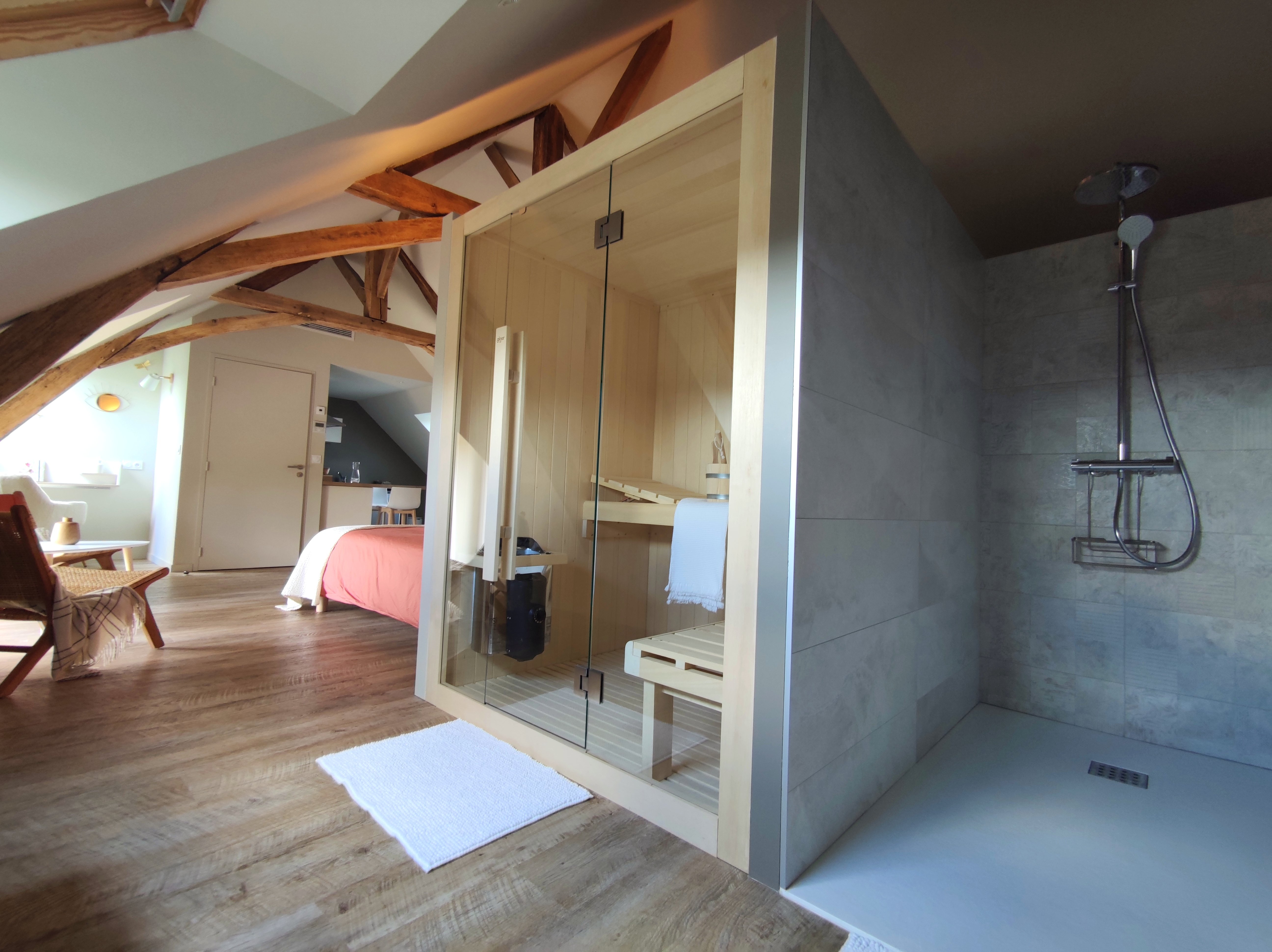 Profitez de la chaleur bienfaisante de son sauna finlandais traditionnel avec vue sur la campagne.