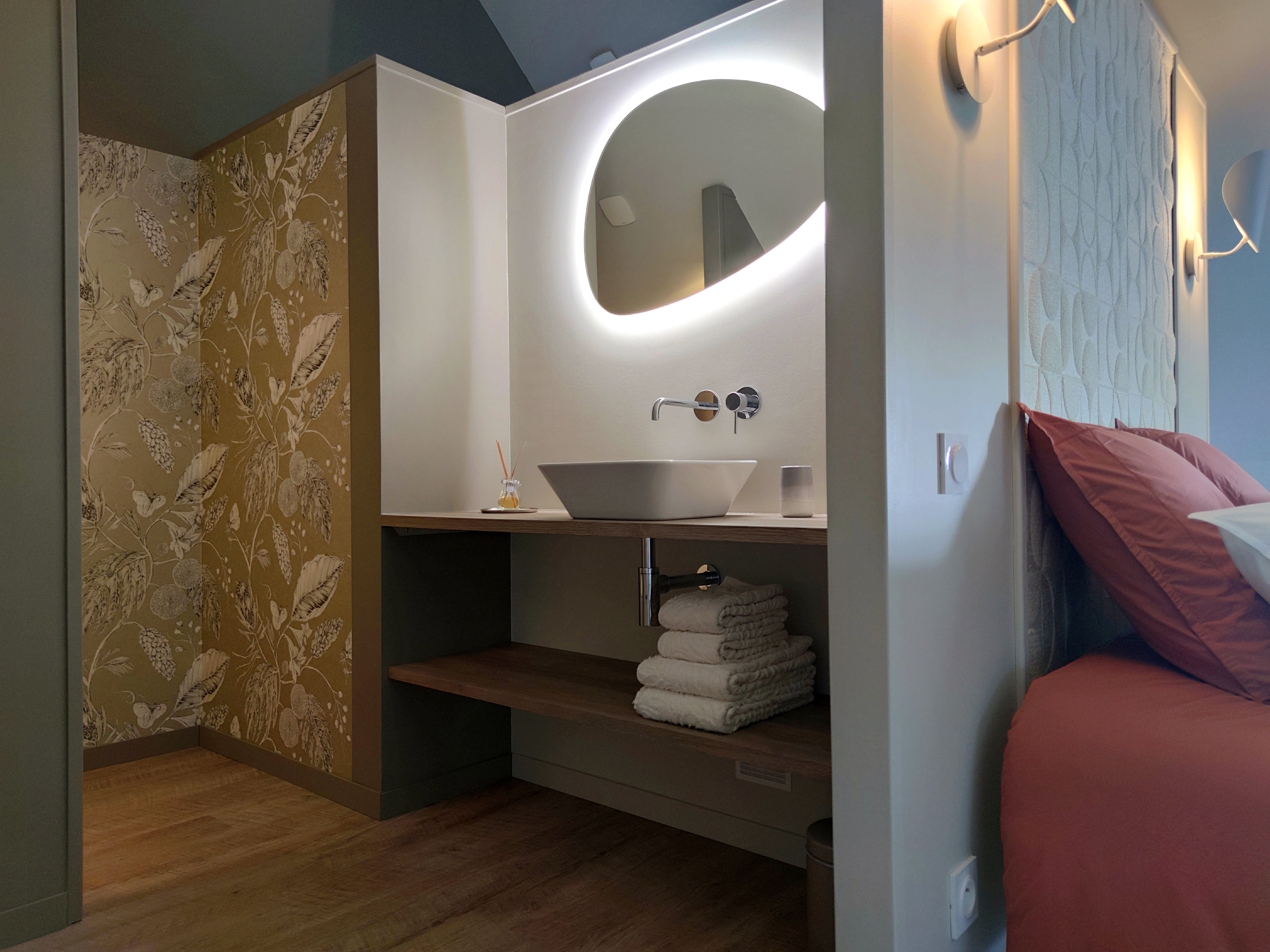 La suite est équipée d’une douche XXL, d’une vasque et de WC. Linge de toilette et peignoirs sont fournis.