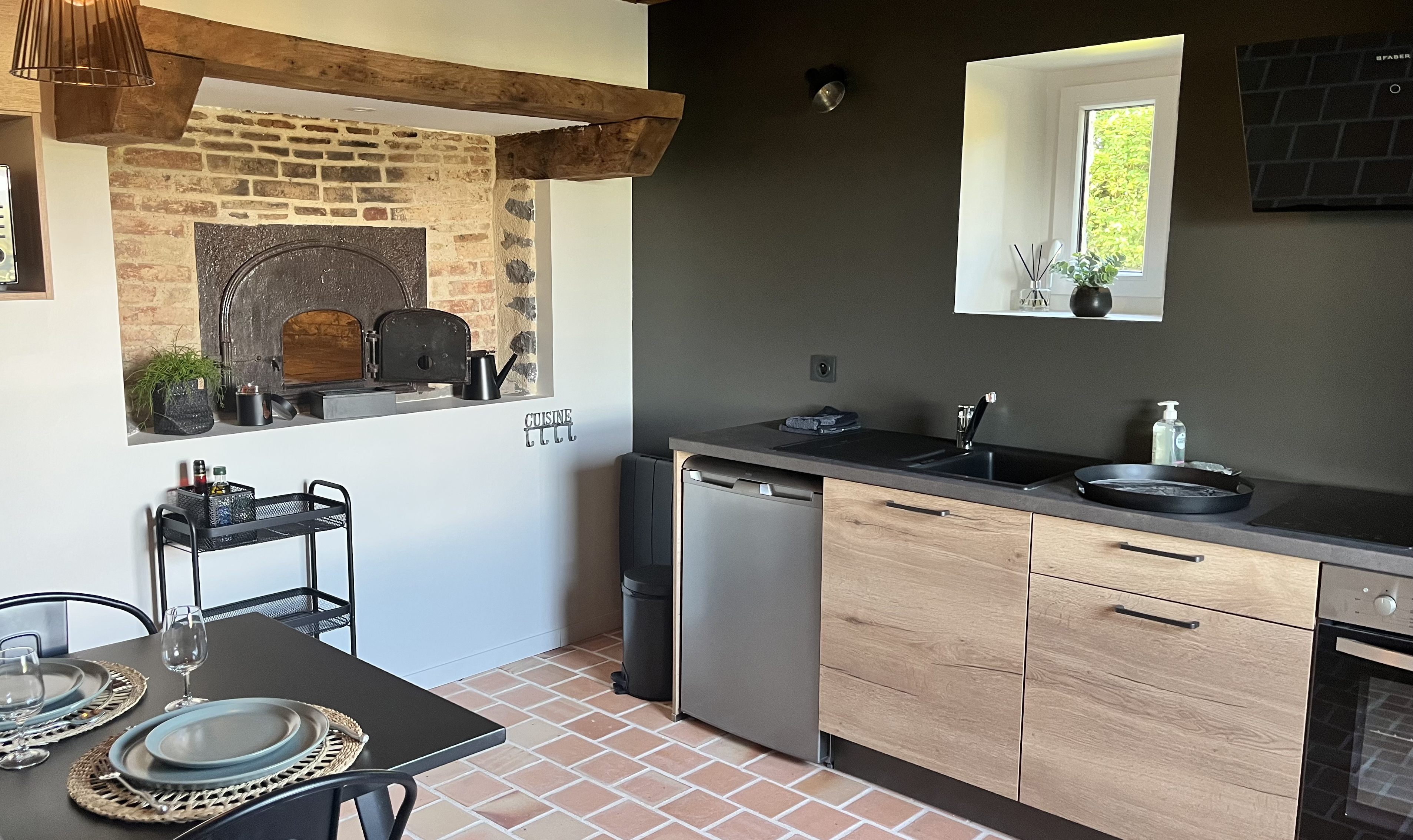 Côté cuisine, vous profiterez d’un espace qui a gardé toute son authenticité avec l’ancien four à pain. Malgré tout, la cuisine a été entièrement ré-aménagée et équipée (four, four micro-ondes, plaques induction, hotte, réfrigérateur, bouilloire, cafetière à dosettes, plateau de courtoisie avec sachets de thé et dosettes café et chocolat).